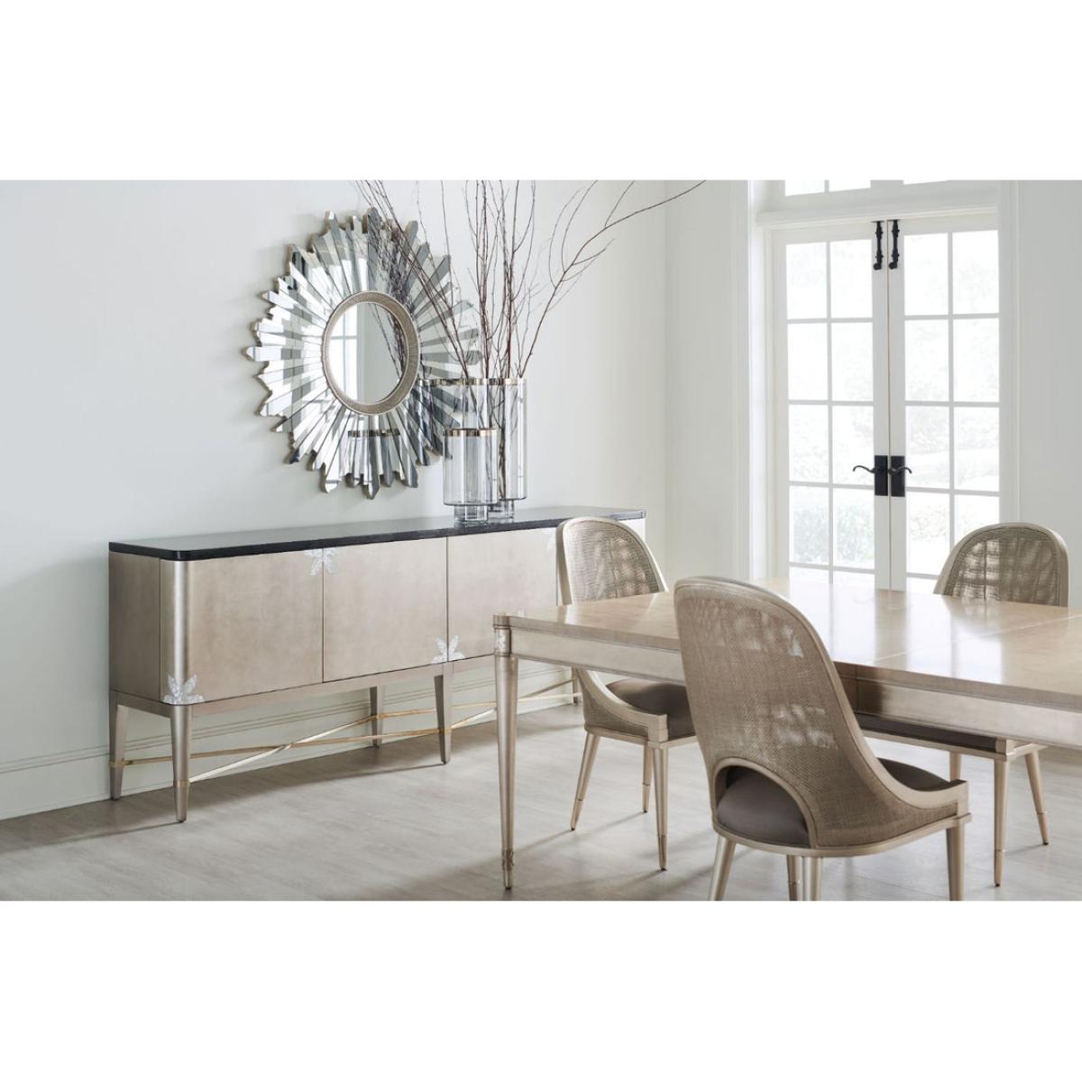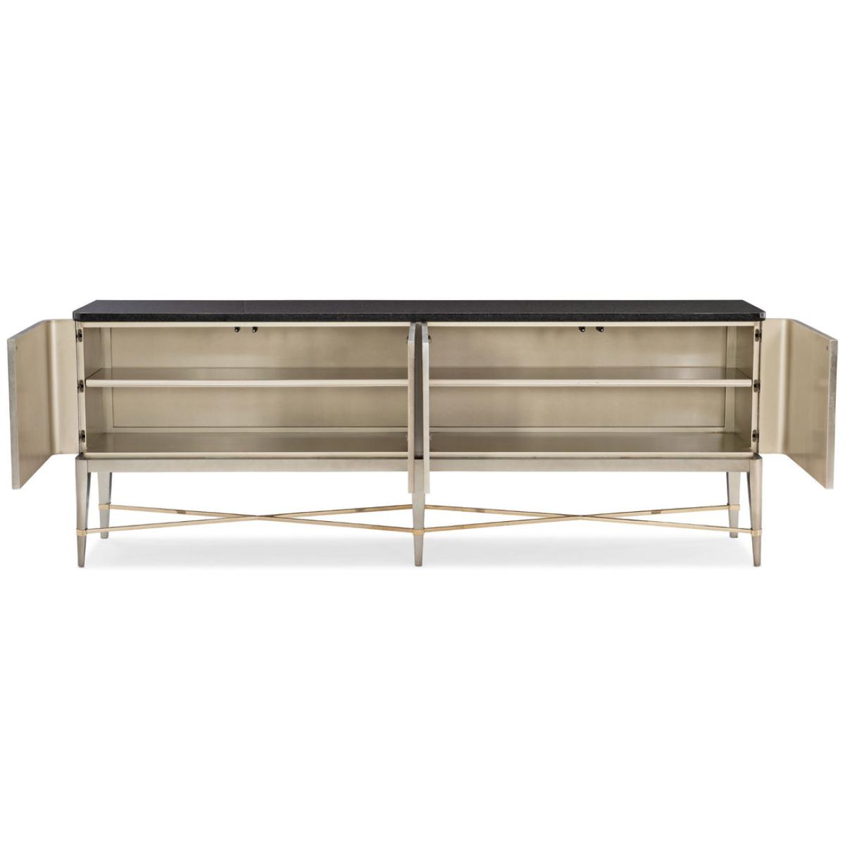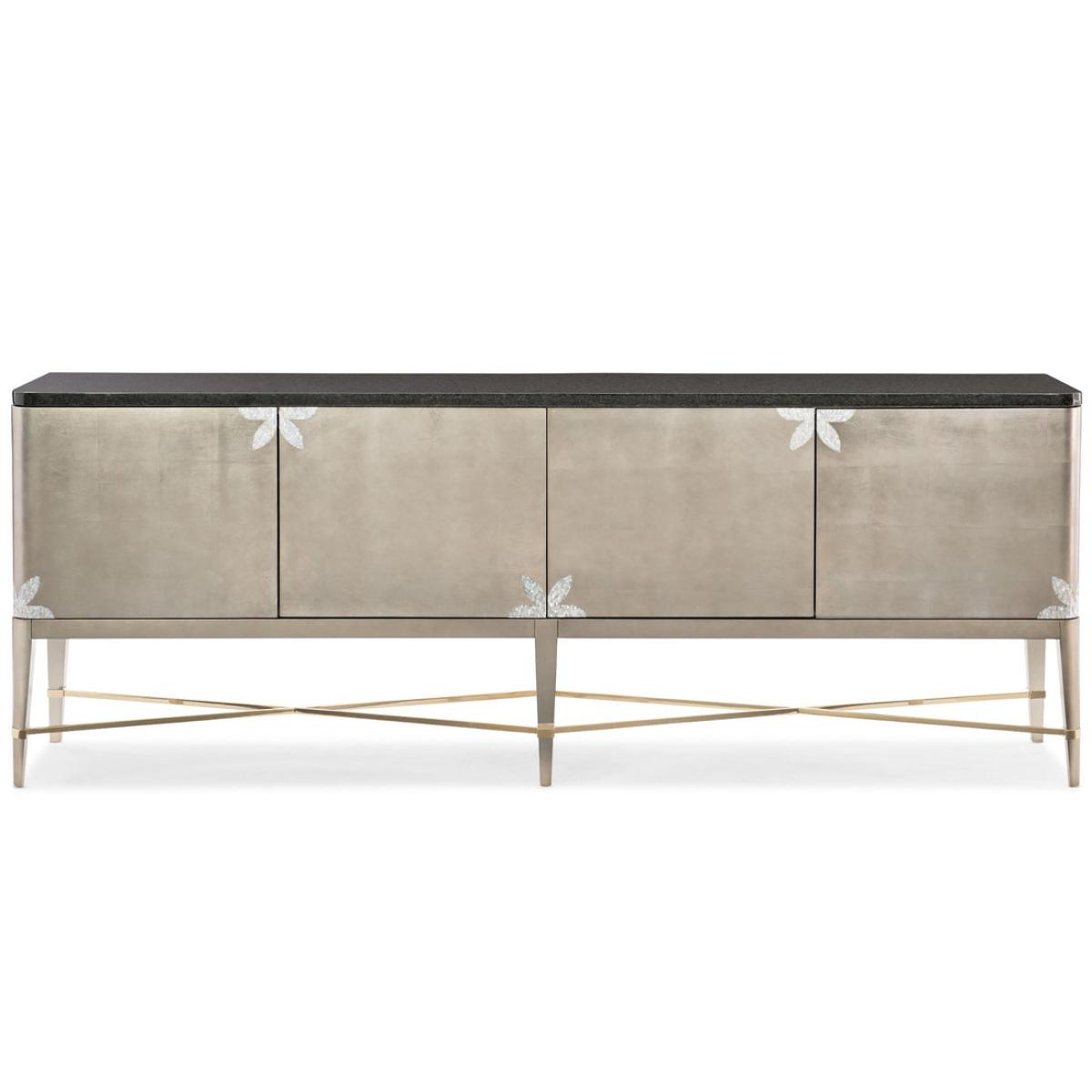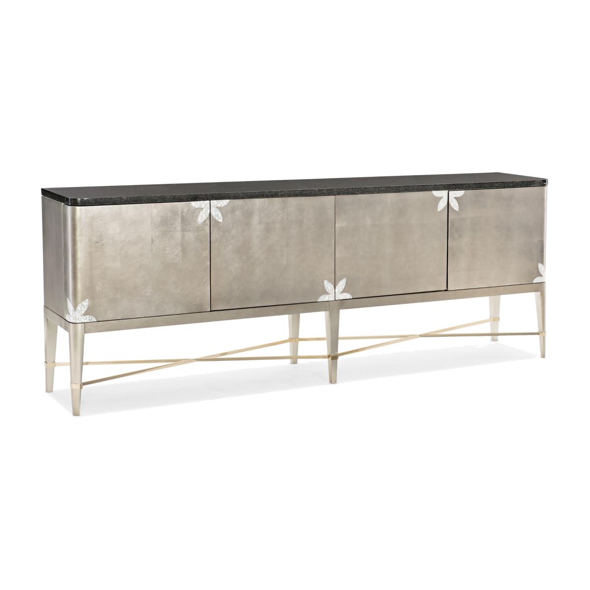 Edgy and elegant, this glamorous cabinet adds an element of fashion to any room. You'll love the white Mother of Pearl inlay featured on each of its four doors as well as the bold contrast of a granite stone top. A Charcoal Leaf finish lends dramatic presence while it's metal stretcher sparkles in Whisper of Gold. As functional as it is elegant, this thoughtfully designed piece offers plenty of storage and boasts an adjustable shelf in each interior compartment. Together, its intriguing mix of materials adds layers of luxury to its sophisticated silhouette. Case finished in Charcoal Leaf. Granite stone top. Four doors with white MOP inlay accents. One adjustable shelf in each of the interior compartments. Metal stretcher in plated Whisper of Gold. Interior finish in Soft Silver Paint.