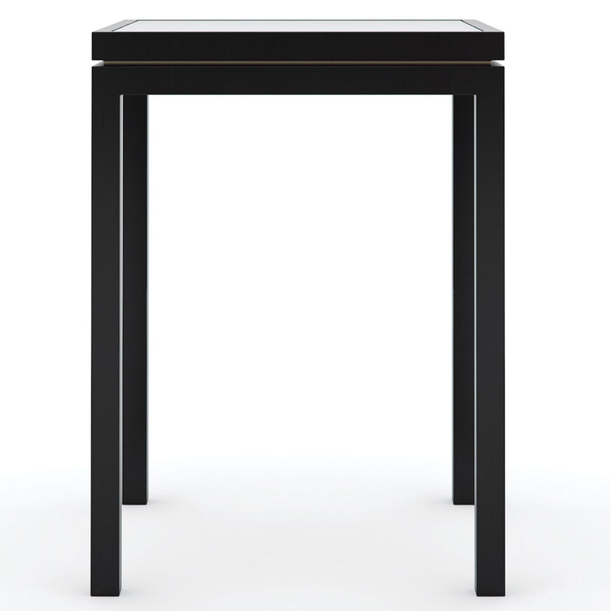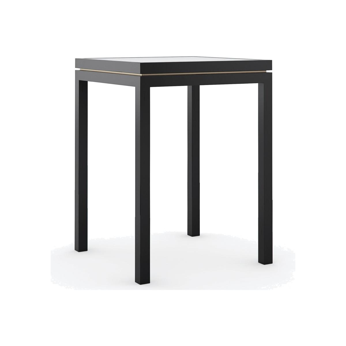 Essential as the little black dress, this elegant side table is well-designed for any occasion. A glass top framed in Tuxedo Black adds depth and reflection, warmly accented by a slim metal band in a Whisper of Gold. Perfectly proportioned for a beverage or book, it adds sophisticated style with a petite footprint. Table finished in Tuxedo Black. Metal frame in Whisper of Gold. Glass top.