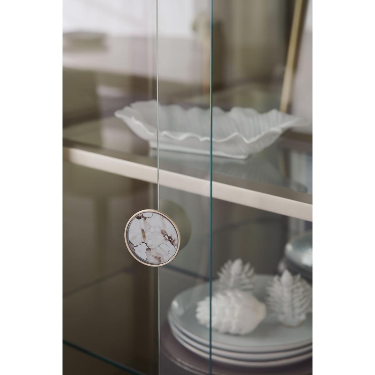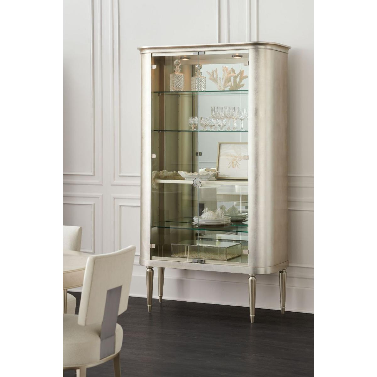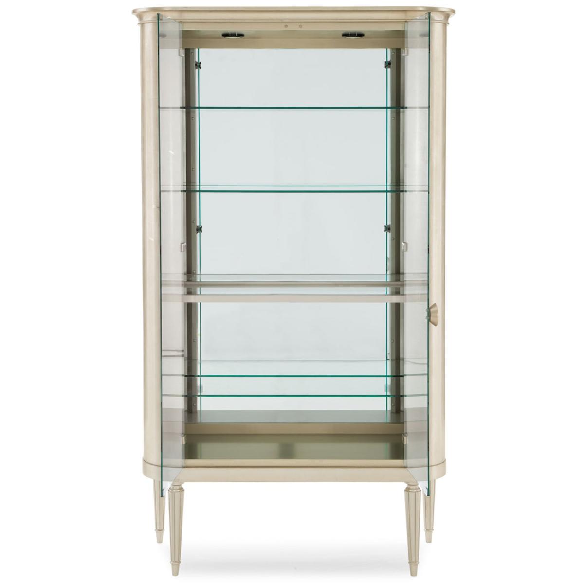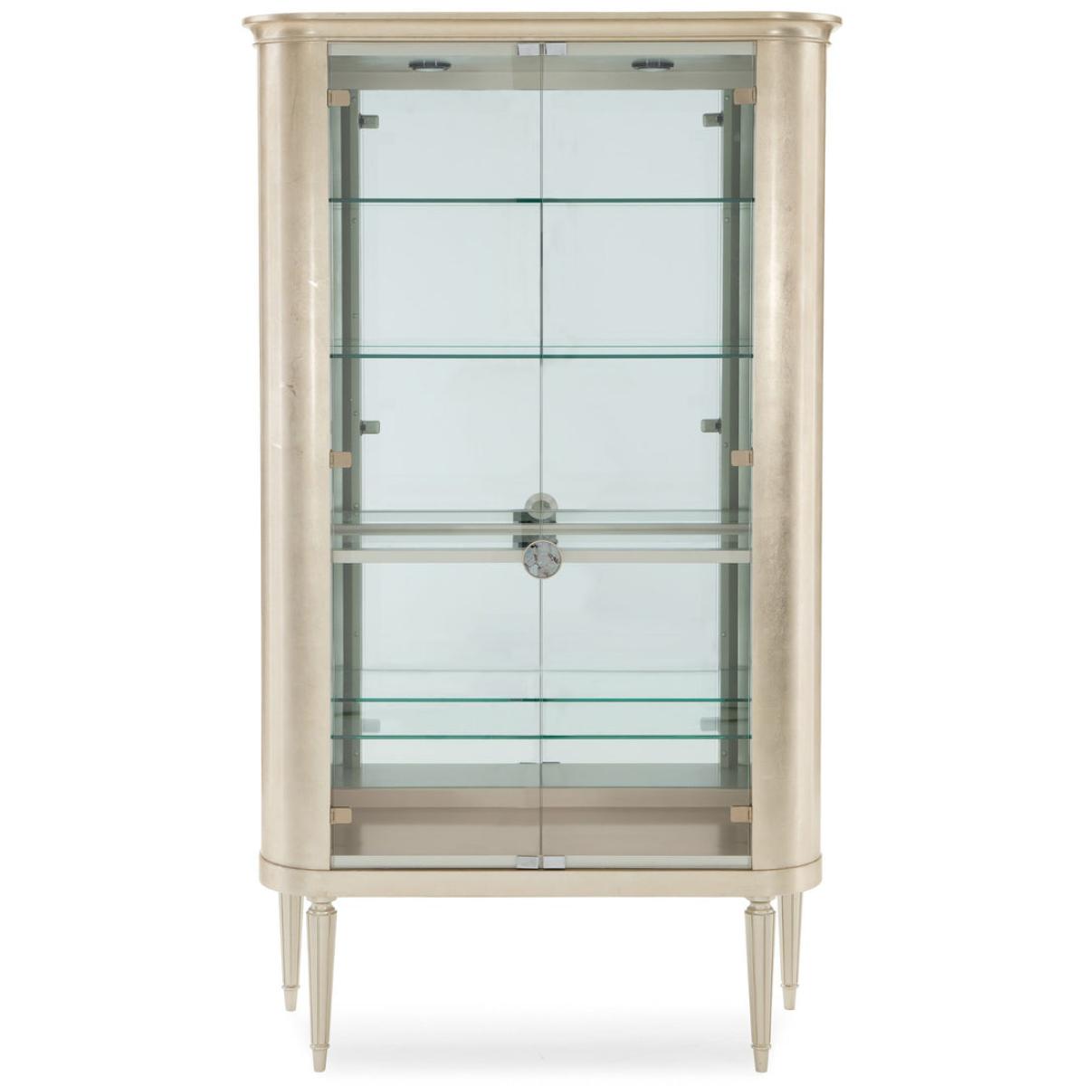 When it's time to showcase your favourite treasures, the Time to Reflect cabinet has no equal. Tall and statuesque with all the right curves highlighted by Soft Silver Leaf and Soft Silver Paint, this stunning design elevates the art of display. It features two doors with three adjustable glass shelves and a centre wood-framed glass shelf. A mirrored interior and LED light work together to brilliantly reflect everything inside. Case in Soft Silver Leaf. Legs and interior in Soft Silver Paint. Interior mirrored back panel. Two doors with three adjustable glass shelves and one center wood framed shelf with glass insert. Interior LED light. Metal ferrule. Legs ship KD.