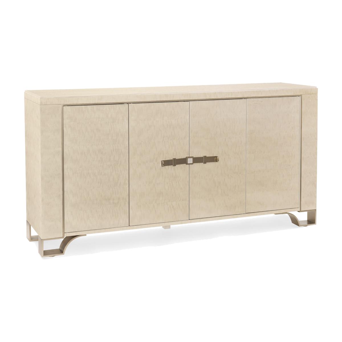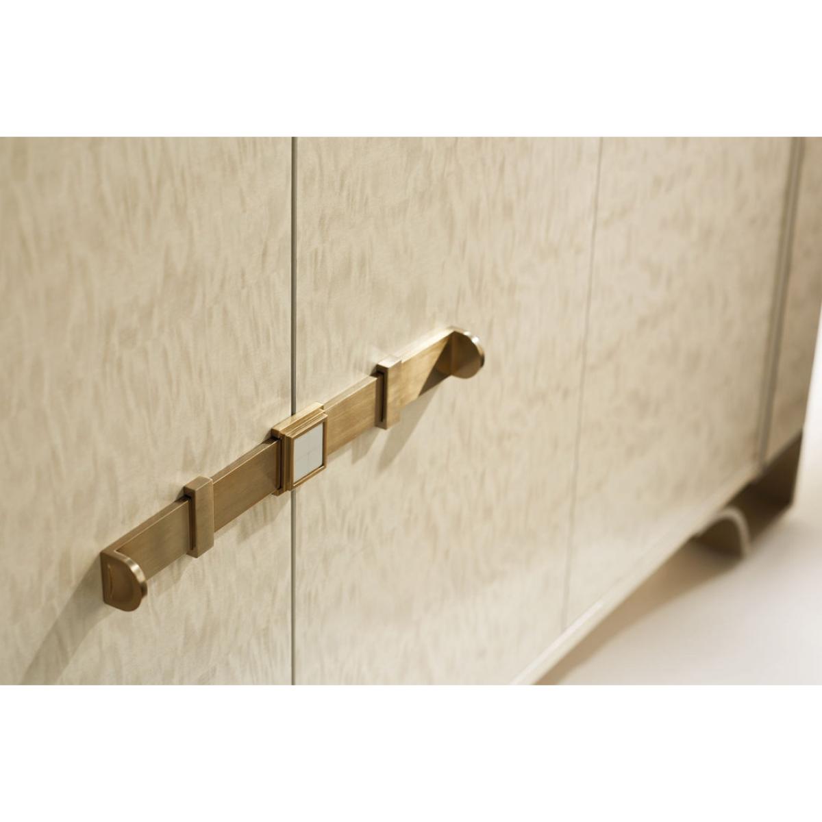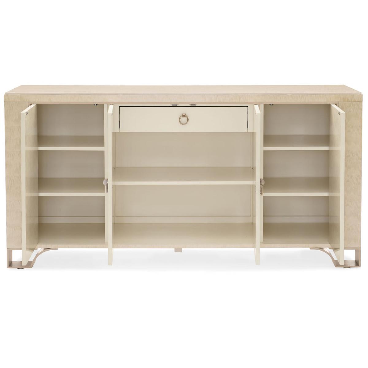Destined to be the "Toast Of The Town", this elegant case piece brings glamour home. Its distinctive design feels visually light yet significant. An exquisitely sophisticated Platinum Blonde finish brings its mottled Anegre alive while creating modern glamour. Behind each outside door you'll find two adjustable shelves while an adjustable shelf and tray drawer lie behind its centre doors. Intriguing door hardware adds a jewellery-like decorative element, as do its four metal feet finished in Golden Shimmer Paint. Case finished in Platinum Blonde. Four doors. Two adjustable shelves behind each outside door. One tray drawer with side drawer guides and one adjustable shelf behind center doors. Metal feet finished in Golden Shimmer. Interior in Ivory.