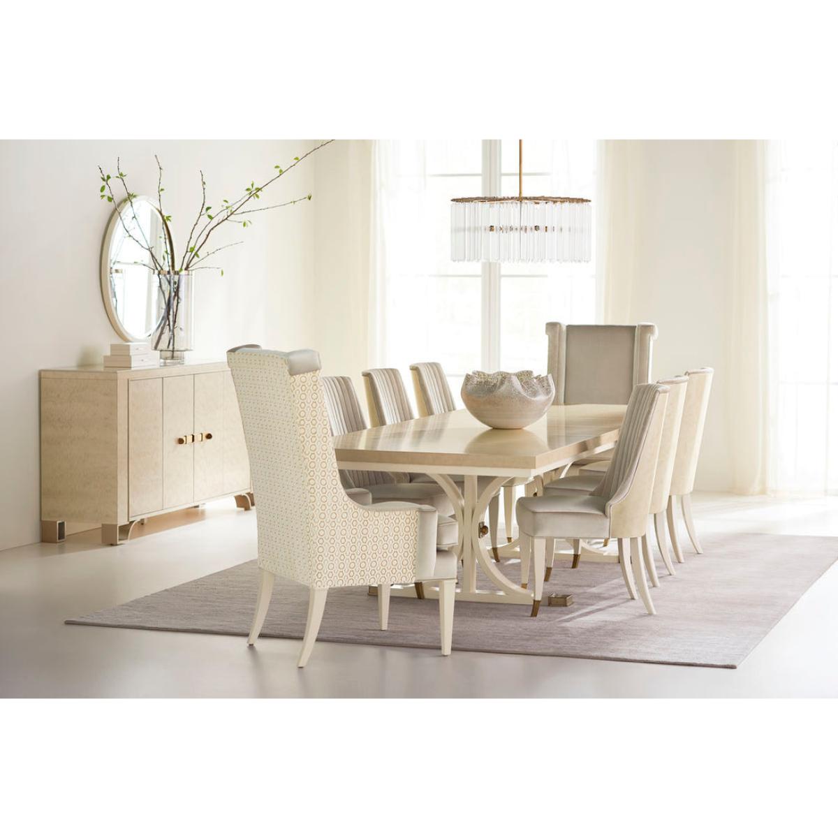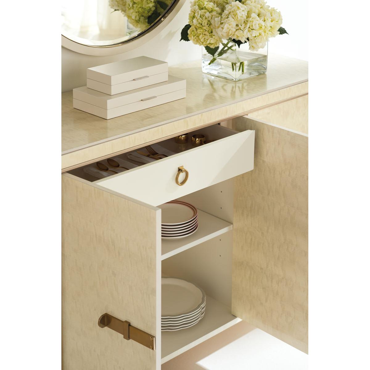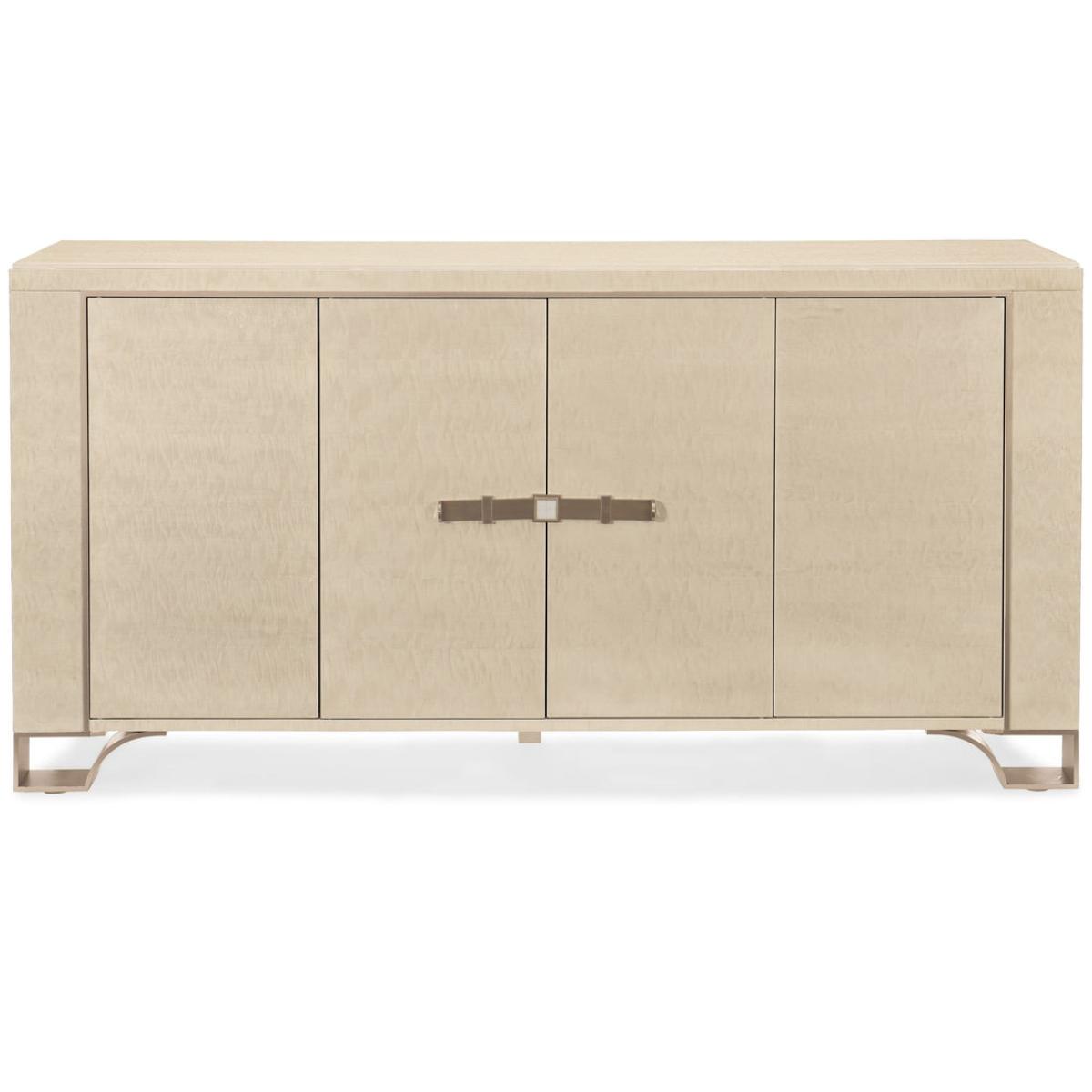 Destined to be the "Toast Of The Town", this elegant case piece brings glamour home. Its distinctive design feels visually light yet significant. An exquisitely sophisticated Platinum Blonde finish brings its mottled Anegre alive while creating modern glamour. Behind each outside door you'll find two adjustable shelves while an adjustable shelf and tray drawer lie behind its centre doors. Intriguing door hardware adds a jewellery-like decorative element, as do its four metal feet finished in Golden Shimmer Paint. Case finished in Platinum Blonde. Four doors. Two adjustable shelves behind each outside door. One tray drawer with side drawer guides and one adjustable shelf behind center doors. Metal feet finished in Golden Shimmer. Interior in Ivory.