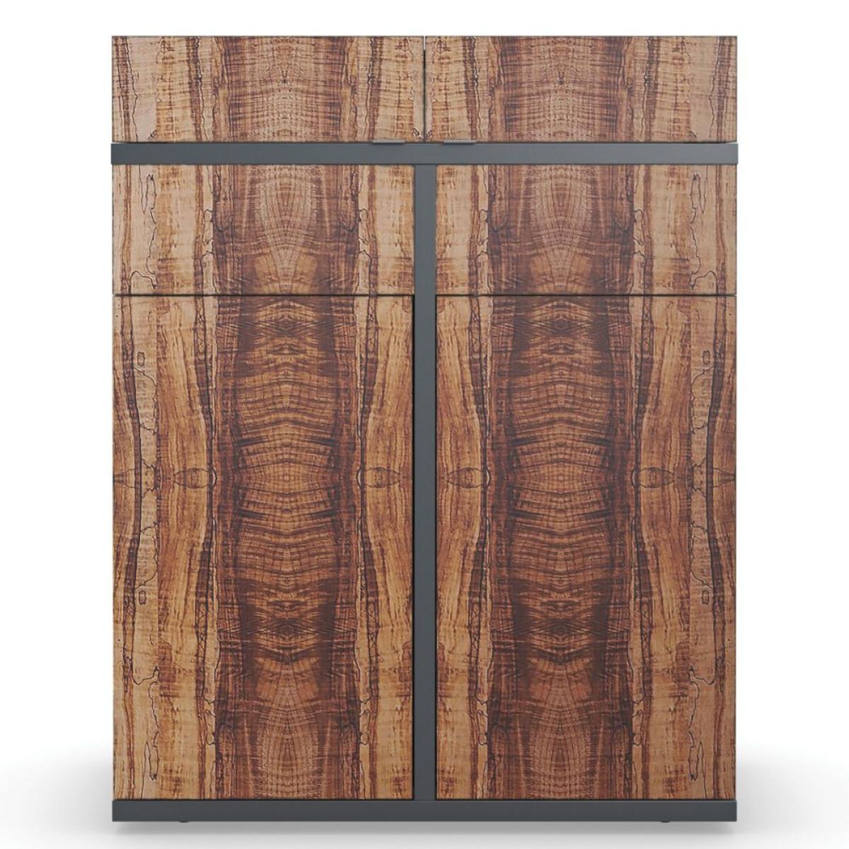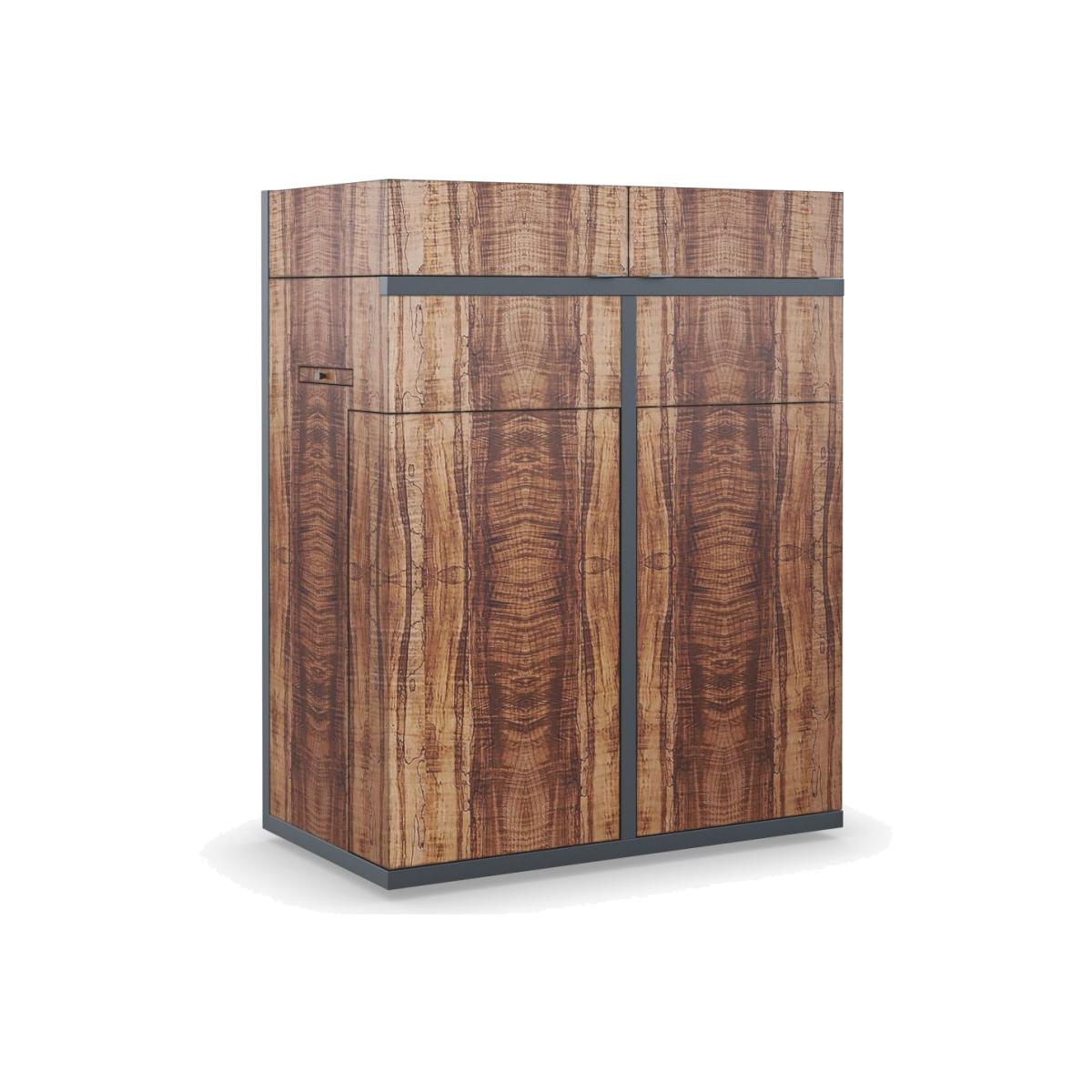 Luxury, understated: this sleek bar cabinet mixes form and function with innovation to elevate entertaining. Well-suited for compact spaces or larger living interiors, its clean-lined design accentuates the natural beauty of printed spalted maple. Features dual flip-top compartments that open to reveal storage with removable dividers, and pull-out shelves on each side. Touch-latch doors with built-in shelves for bottles and glasses neatly conceal more storage space inside, while casters make it easy to move. Case finished in Naturally Organic. Metal frame in Greenway. Black laminated surface under dividers. Small pull out shelf on each side Flip top lid features storage area with removable dividers and mirrored back top section. Two touch latch doors when open have storage for bottles and glasses. Center features open storage area and one adjustable shelf. Bar has casters for mobility Interior in Greenway.