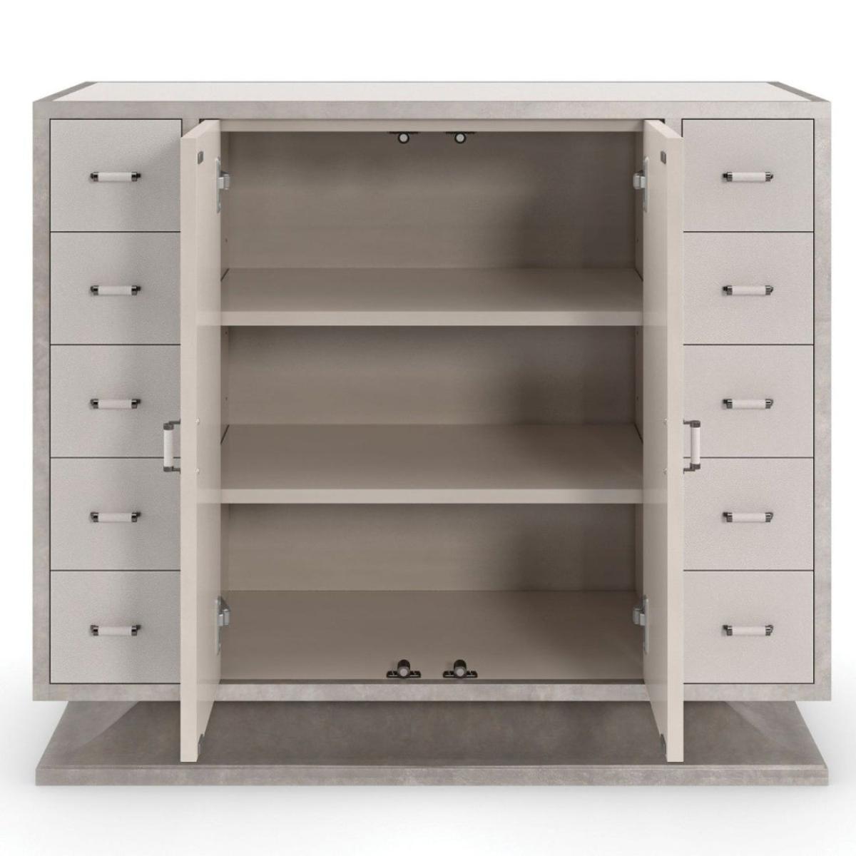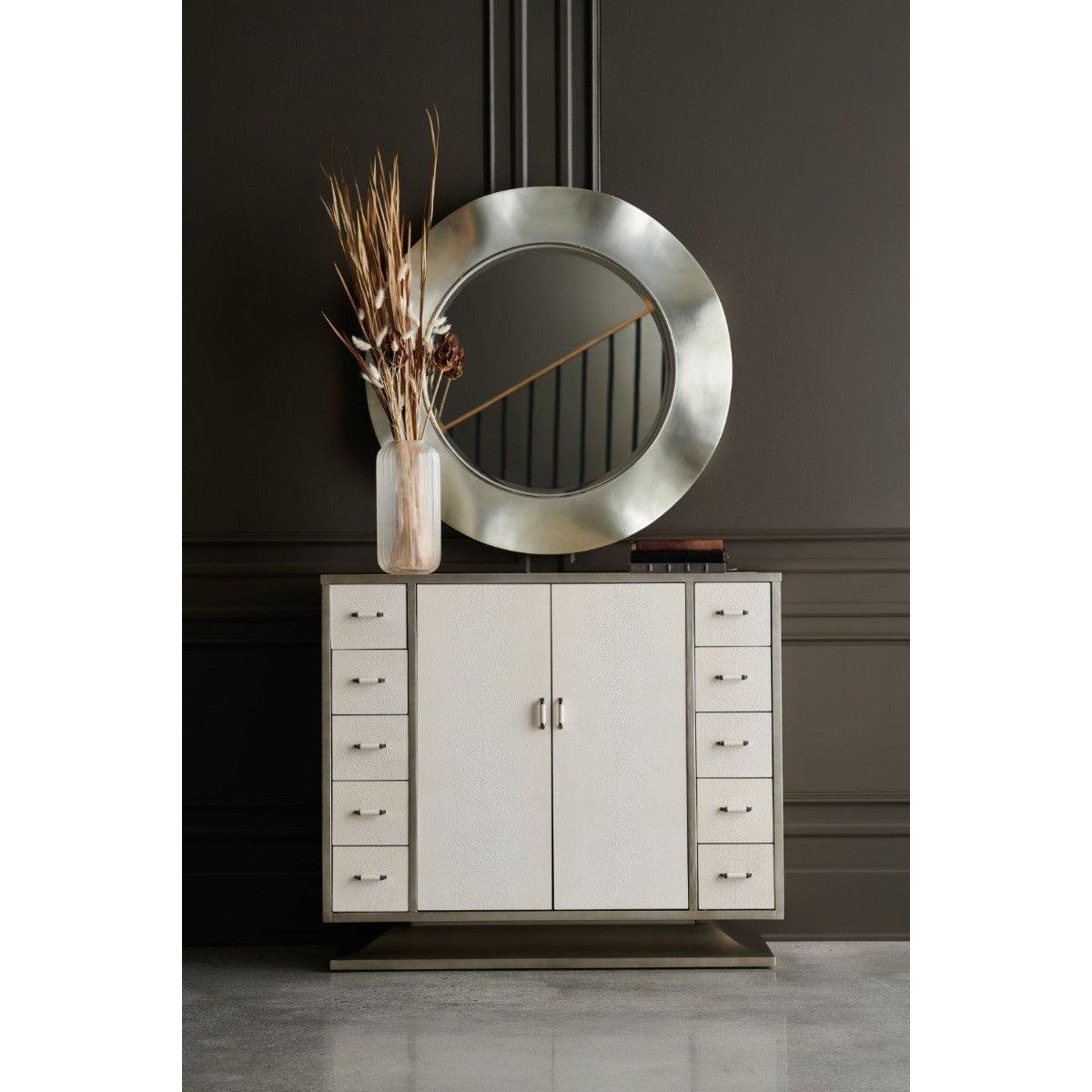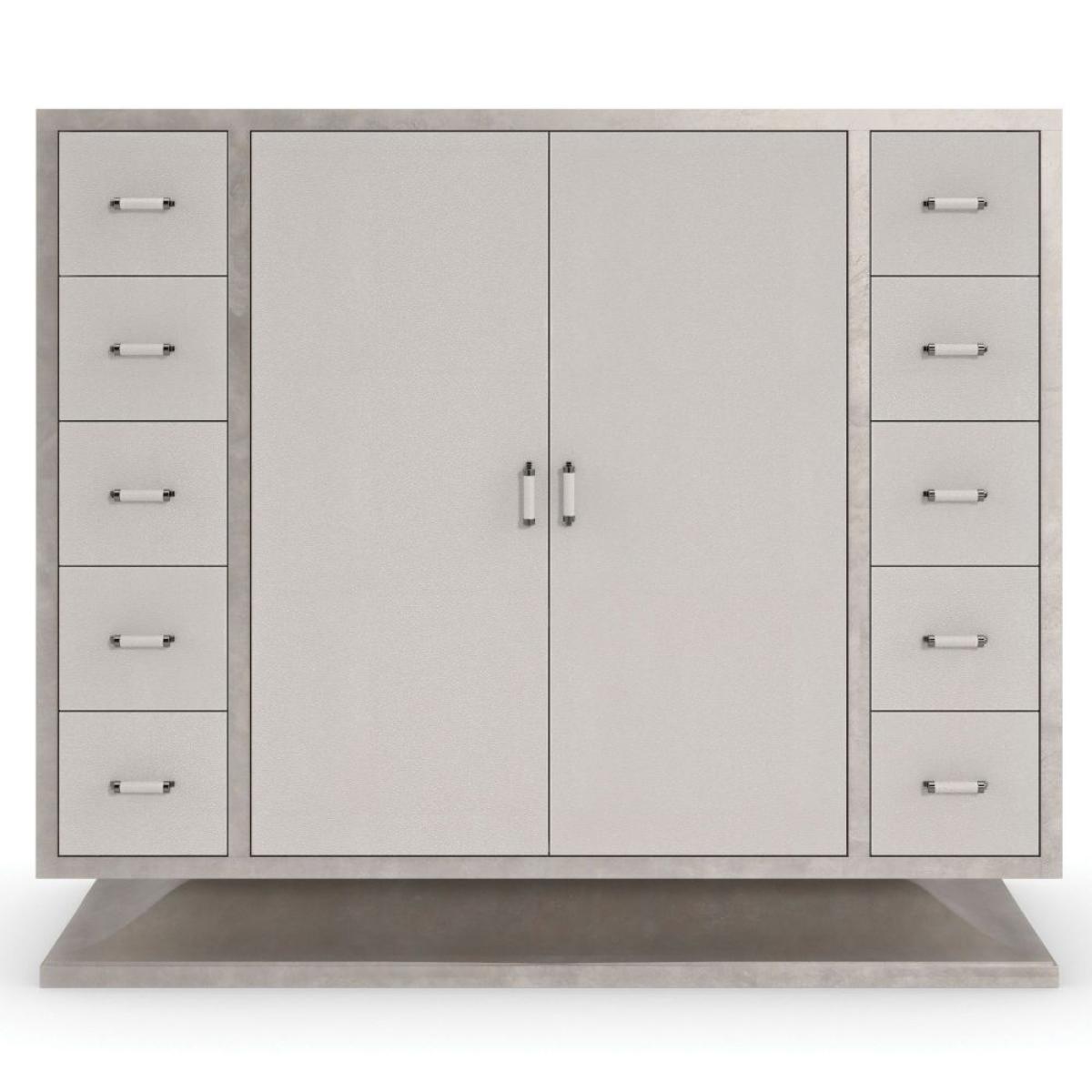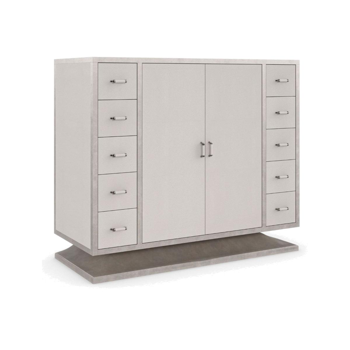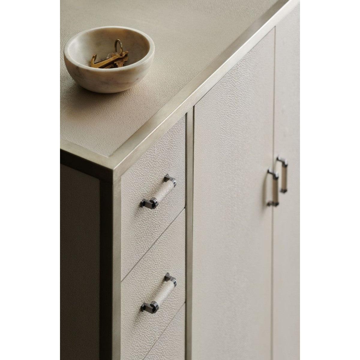 For curiosities and keepsakes, this Art Deco-inspired cabinet features ten petite drawers and ample storage behind two soft-close doors with European hinges. Wrapped in faux shagreen, it introduces a classic, collected-over-time aesthetic, punctuated by a wood base and trim in a smoky Charcoal finish. A Matte Pearl-painted interior and metal pulls, also wrapped in faux shagreen, add an element of distinction to this casually luxe storage piece. Case in wrapped in faux Shagreen. Wood trim and base in Charcoal Leaf. Two doors with soft close European hinges. Centre interior features two adjustable shelves. Ten side drawers with wood guides and runners. Metal hardware in Deep Bronze wrapped in faux Shagreen. Interior in Matte Pearl.