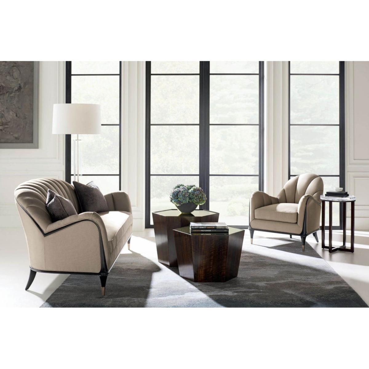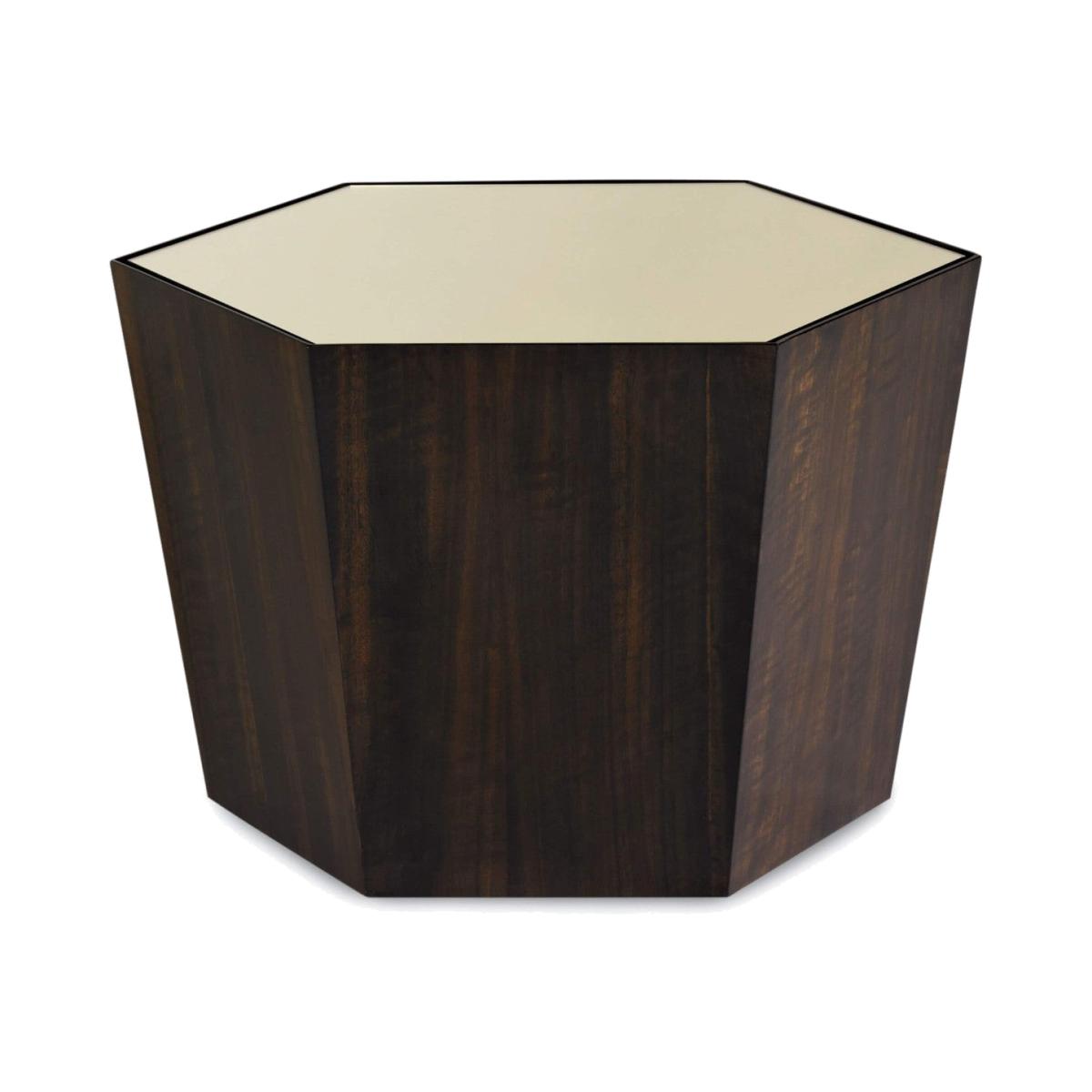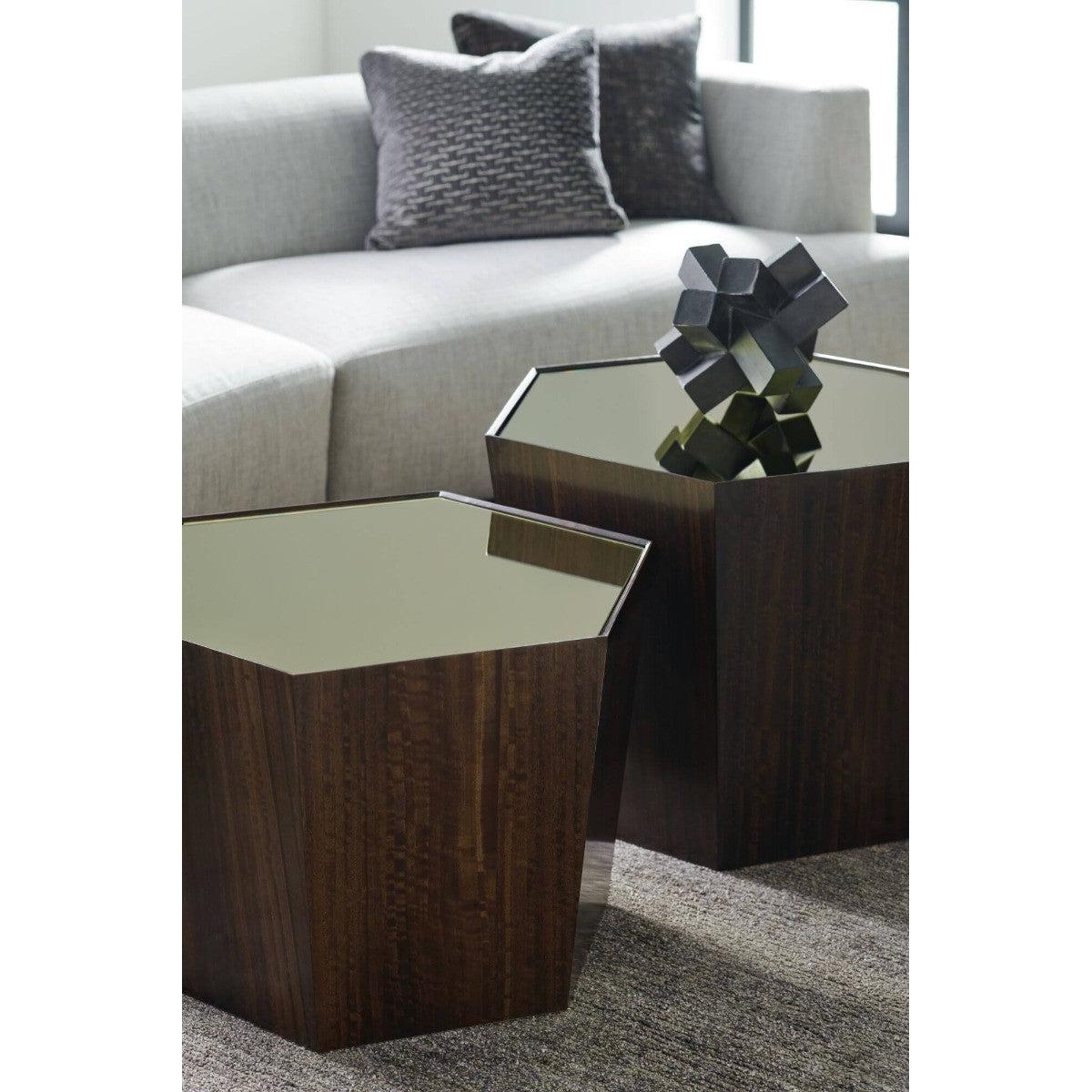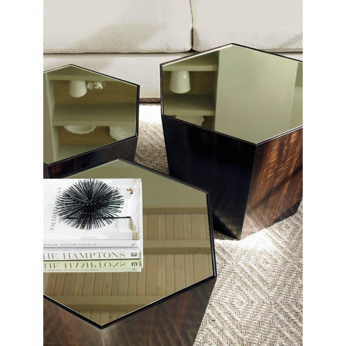 The point is... we think this is the freshest, savviest cocktail grouping going! Fumed Eucalyptus veneers surround the solid, slightly angled base of these tables. We l-o-v-e the gold mirror tops - so unexpected and fun. Two sizes are available, so feel free to mix and match. Use one in front of a mid-size sofa or chaise and two at the ends of a long sofa. Then again, three or more may be grouped in front of a long sectional. Gold tinted mirror top. Made to bunch with CON-COCTAB-023.
