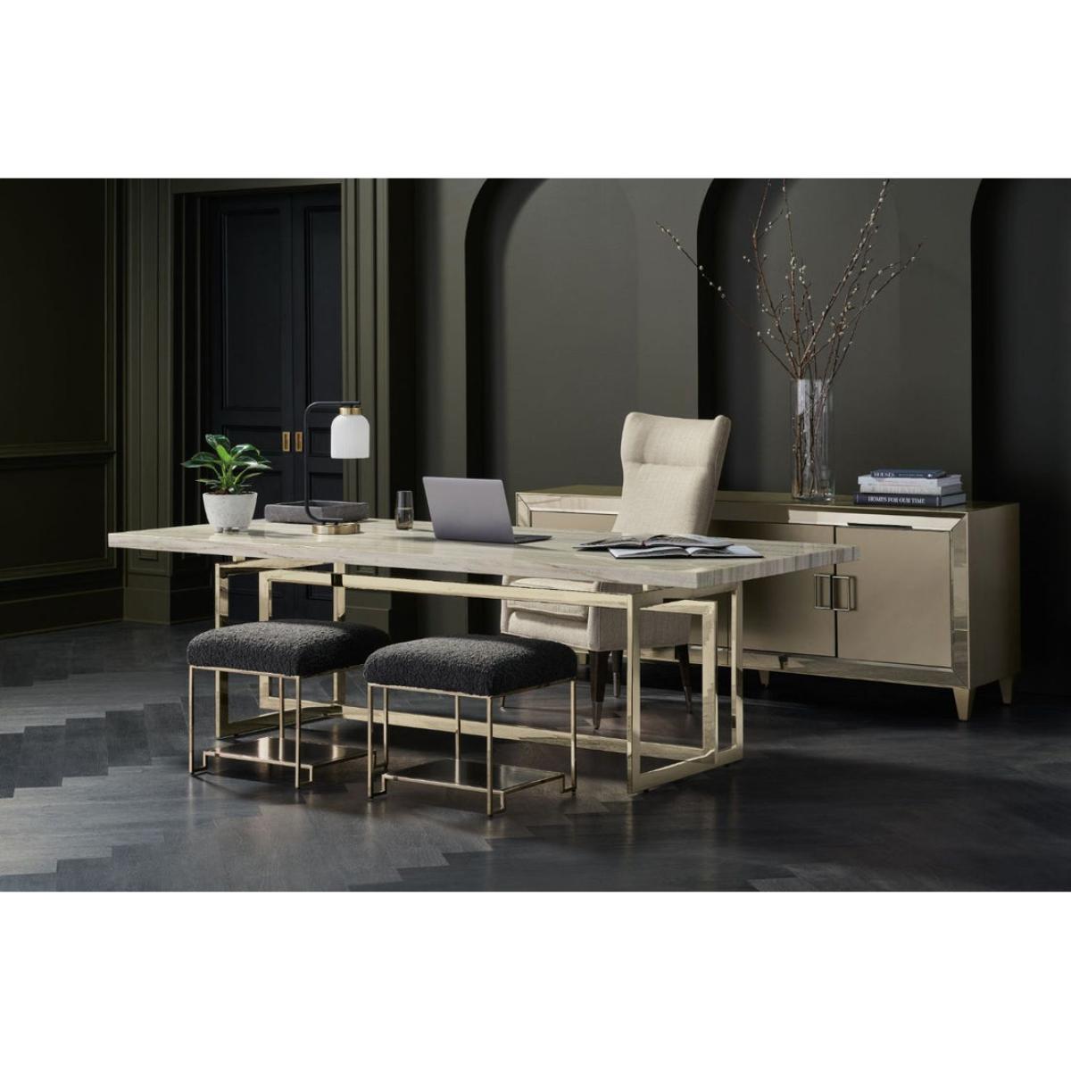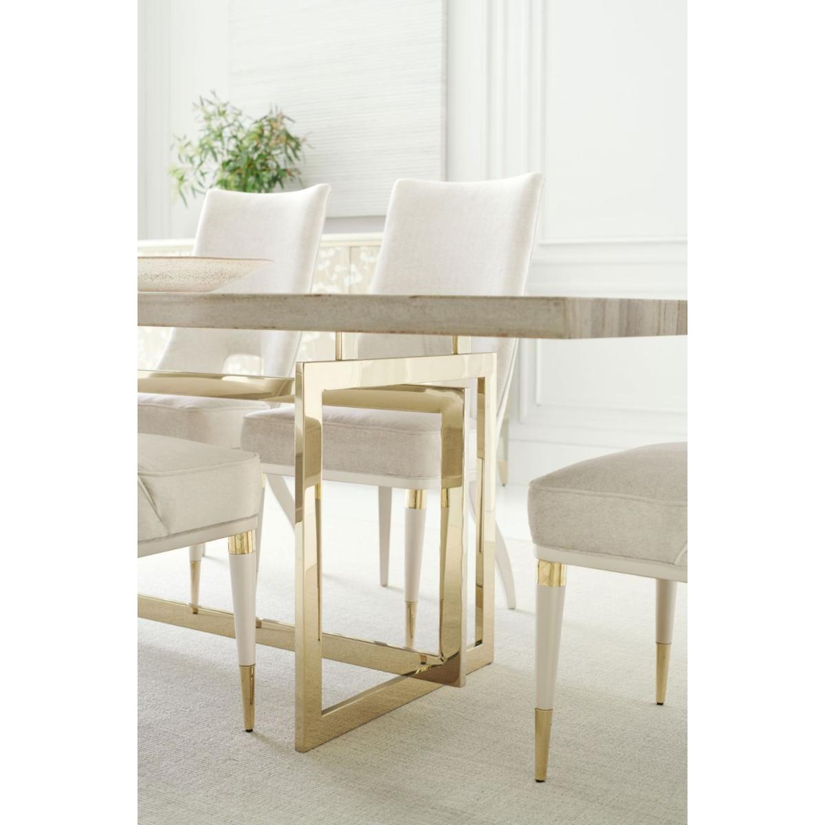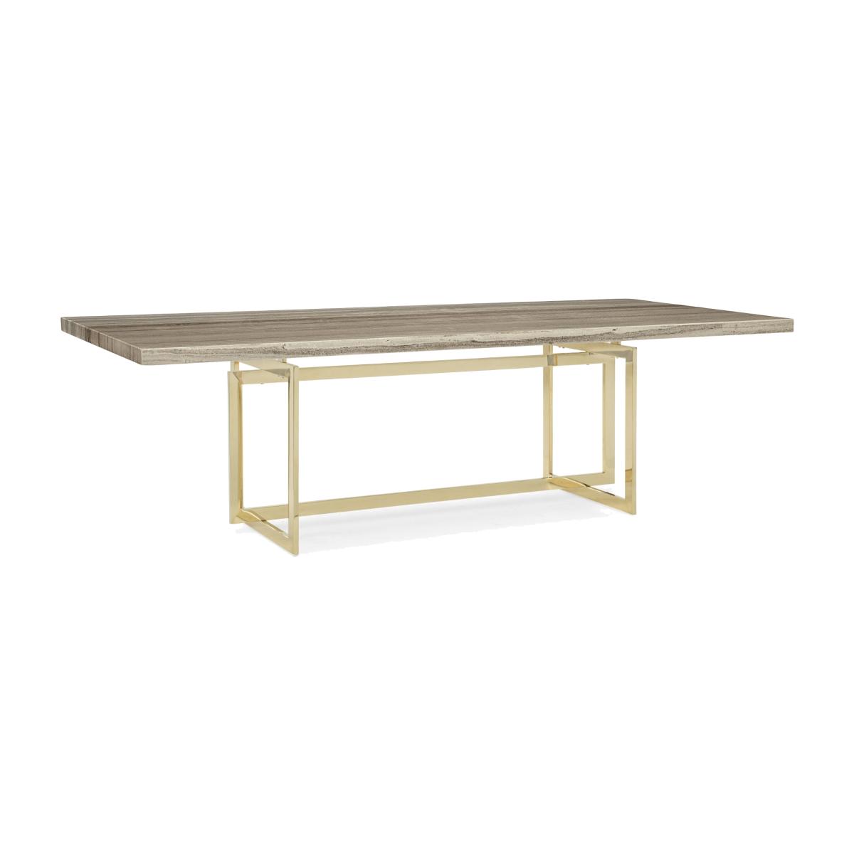 Because not all dining rooms are created equal, there's the Wish You Were Here table. An extraordinary example of organic luxe, it offers an ultra-impressive 100-inch tabletop of grey sandstone. Earthy tones meld with greiges and soft greys to create a visual that's sleek and modern while still feeling warm and natural. A bold, open geometric base finished in Whisper of Gold creates a mix of materials and brings in the glamour. With a dining room table this stunning, you'll hesitate to cover it!Metal base finished in Whisper of Gold. Gray Sandstone top.