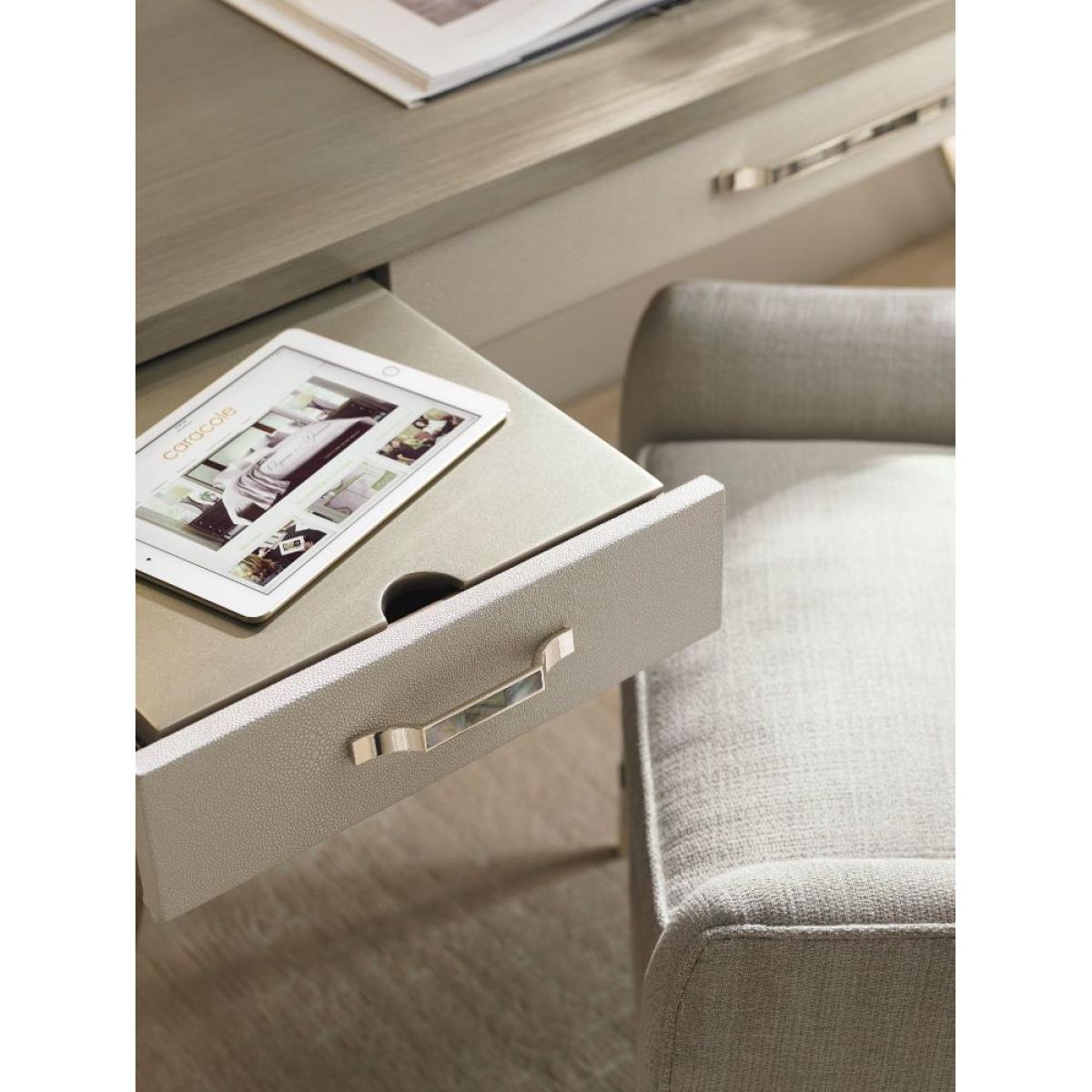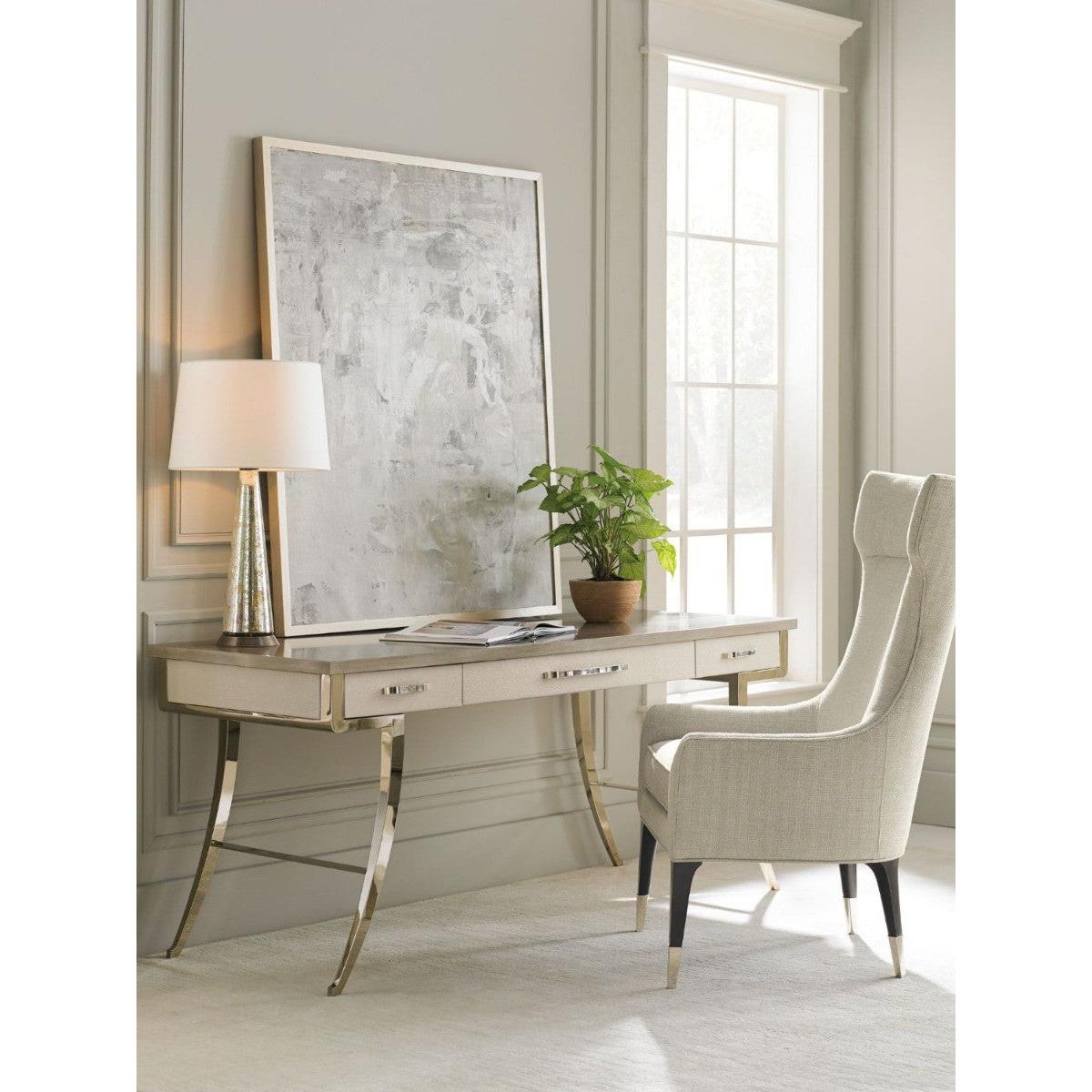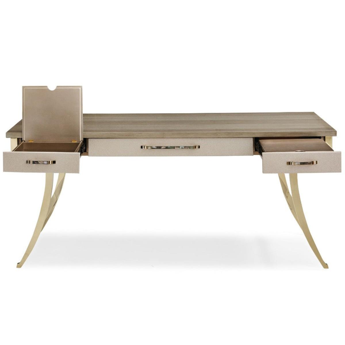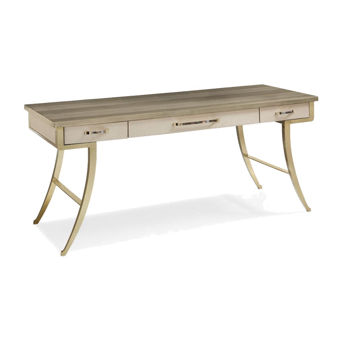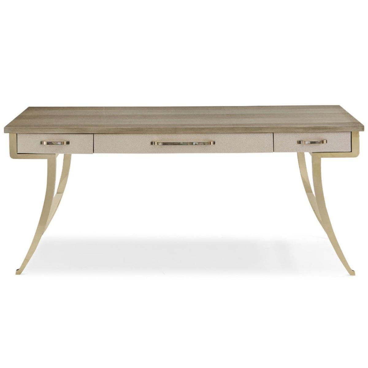When there is serious work to be done, this 70 inch desk is made for business. A single slab of Koto wood is finished in Champagne Shimmer for one-of-a-kind style. The top looks like it is literally floating on a geometric base and dramatically curved sabre legs – all in brilliant Whisper of Gold. Offsetting the hard surfaces of the piece are side insets and three drawers finished in neutral faux shagreen. Drawer interiors shimmer in Taupe Paint. Open the centre drawer to find a pencil holder and easy storage of slim materials. Each side drawer offers an additional work surface with hidden storage underneath. Each drawer is outfitted with custom metal and Mother of Pearl hardware. Sitting down to work was never this beautiful. Bottom of drawers aprons to floor: 24. 75". Knee space: 50. 5". Three drawers with side guides. Centre drawer with pencil tray. Outside drawers with work surface. Hidden storage behind and below work surface. Drawer interiors in Taupe Paint. Panels covered in faux shagreen fabric. Metal frame in Whisper of Gold.
