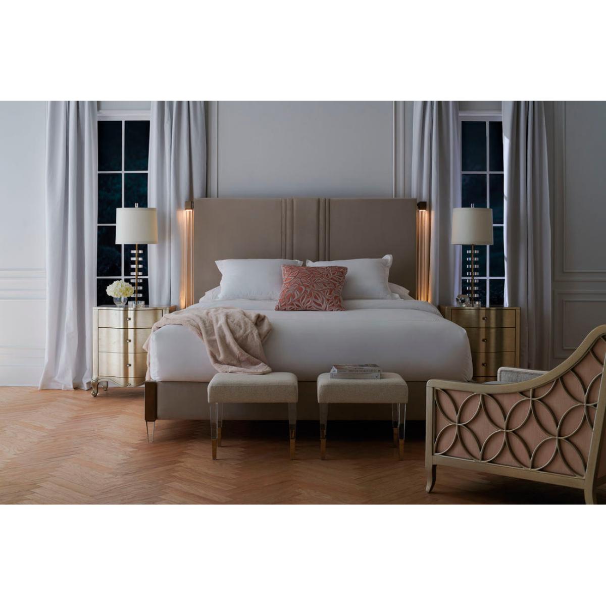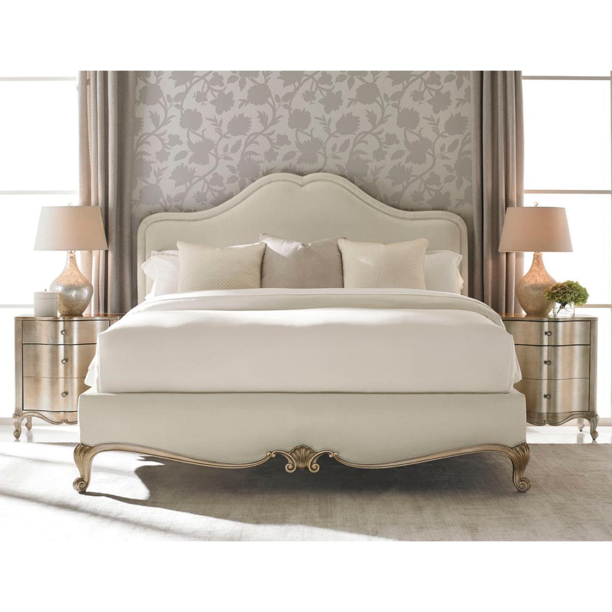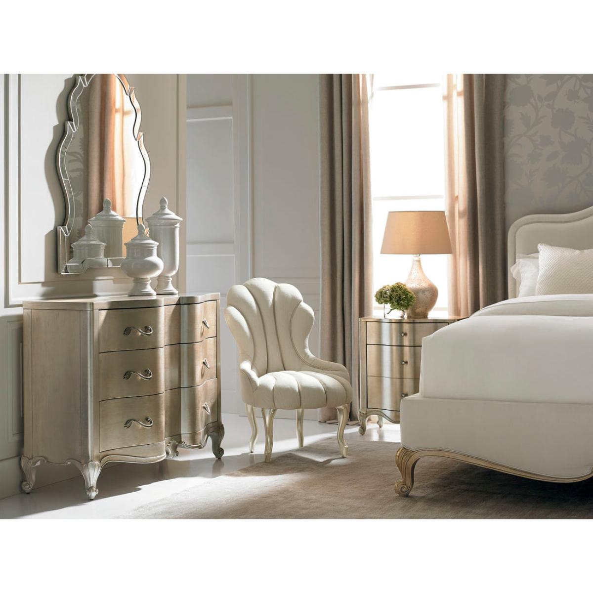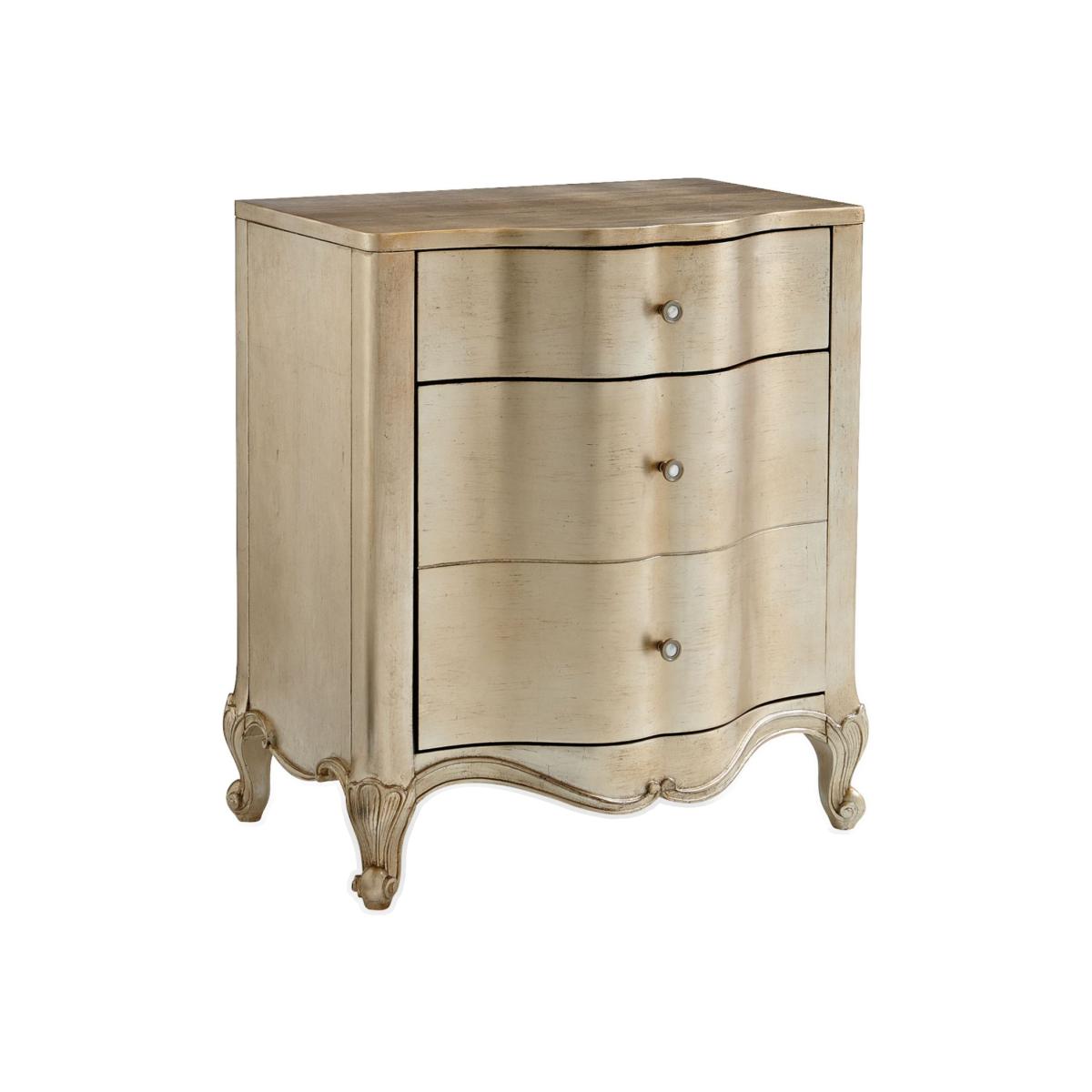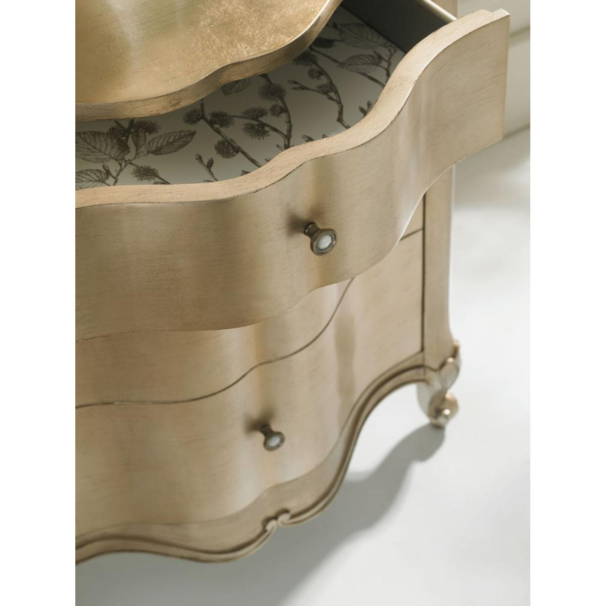 Cozied up next to any of our Caracole beds, You Are The One, is a delightful nightstand with two drawers that offer perfect space to store your bedside favourites. Its cute, curvy shape is dressed in an Auric finish. Four-inch squares of silver leaf are hand-applied and kissed with a soft glaze. Inside the top drawer you will find a botanical print stencilled in metallic silver lining the drawer bottom. For smaller spaces, feel free to use this as the perfect side table next to your favourite sofa. Two drawers. Top drawer with printed drawer bottom. Bottom drawer with hidden storage.