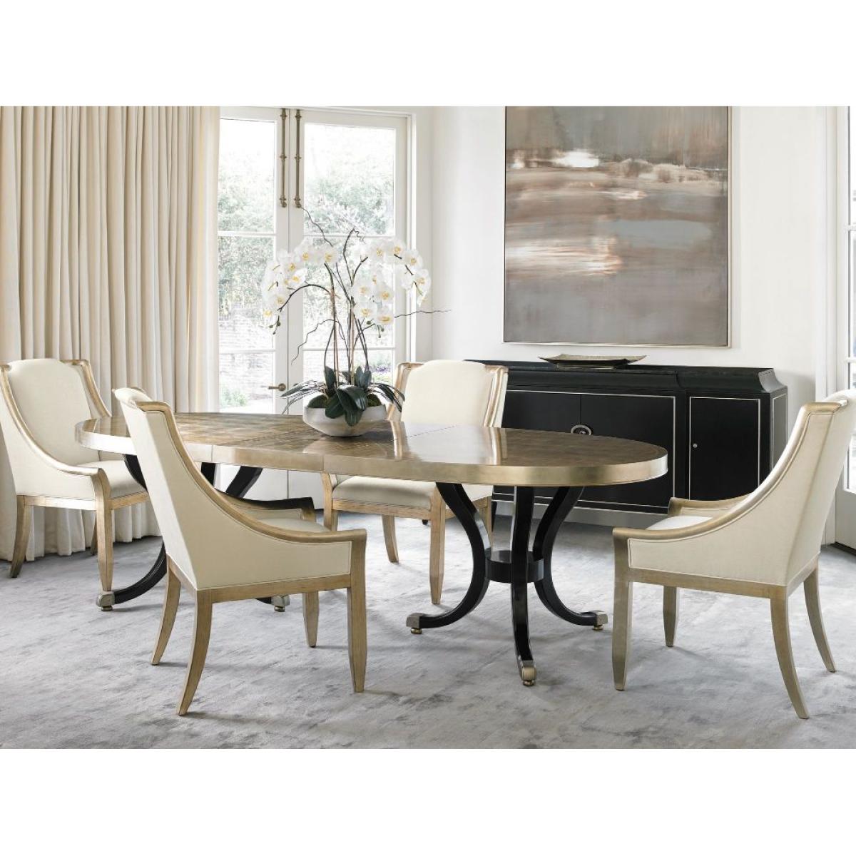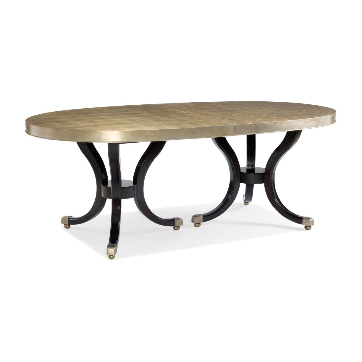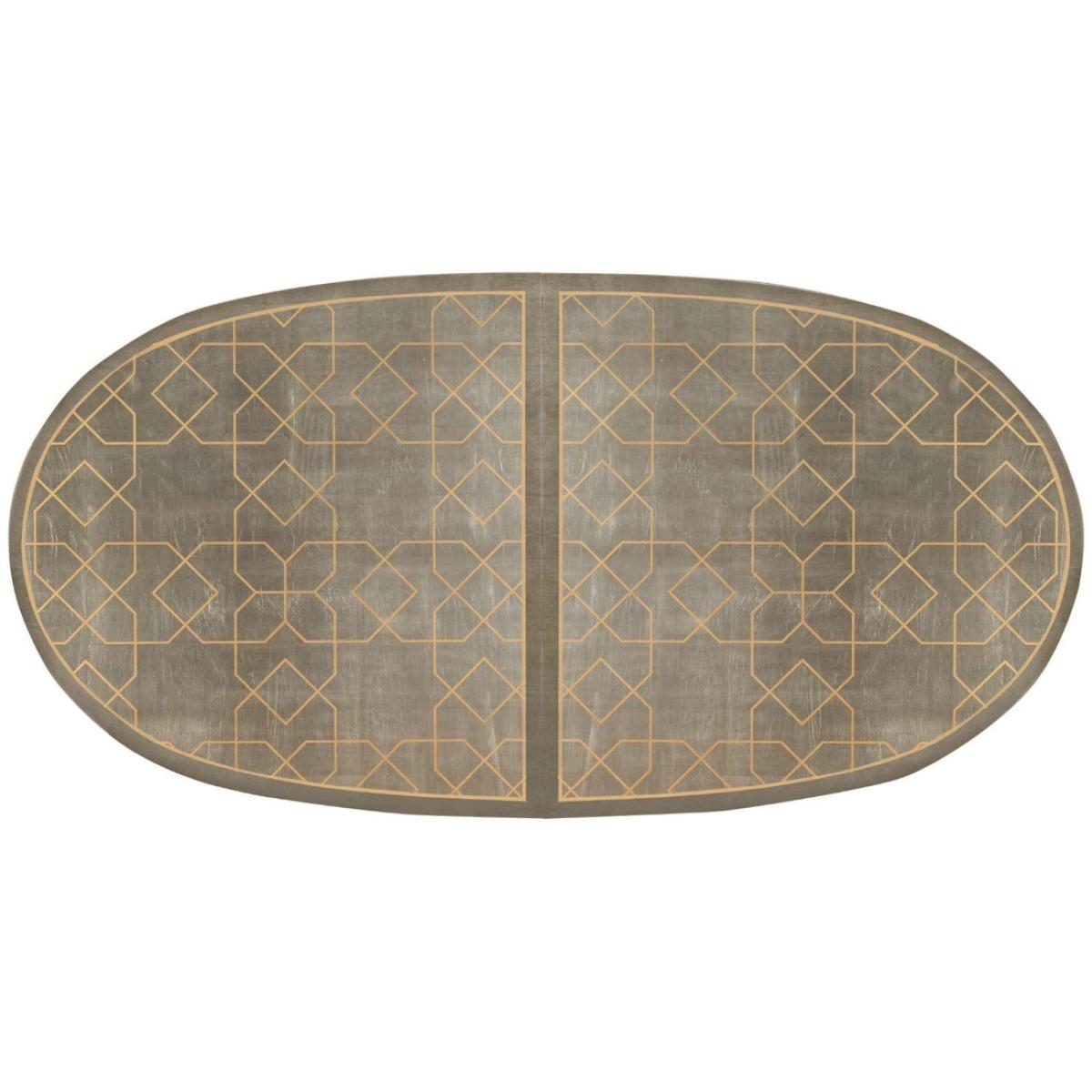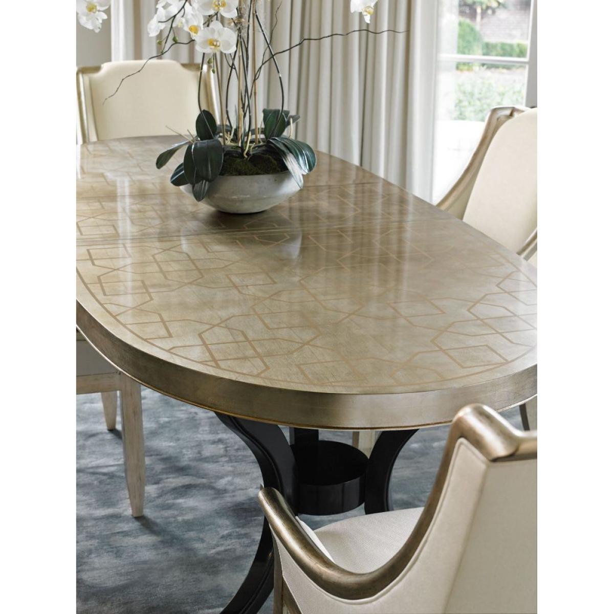 This dining room table makes a dramatic impression thanks to its modern mix of finishes and interesting geometric surface art. A timeless double pedestal design is finished in our Satin Ebony. The table's eye-catching surface has an interlocking, lattice pattern that is artfully rendered in Taupe Silver Leaf with Gold Stencil.  Table extends to 304. 8cm (120") with two 48. 26 (19") leaves. Top with decorative leafed pattern.