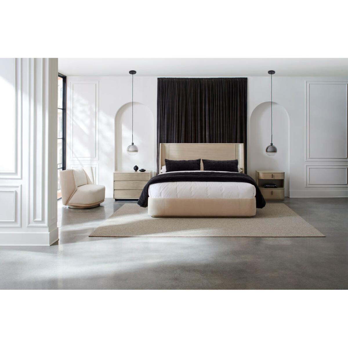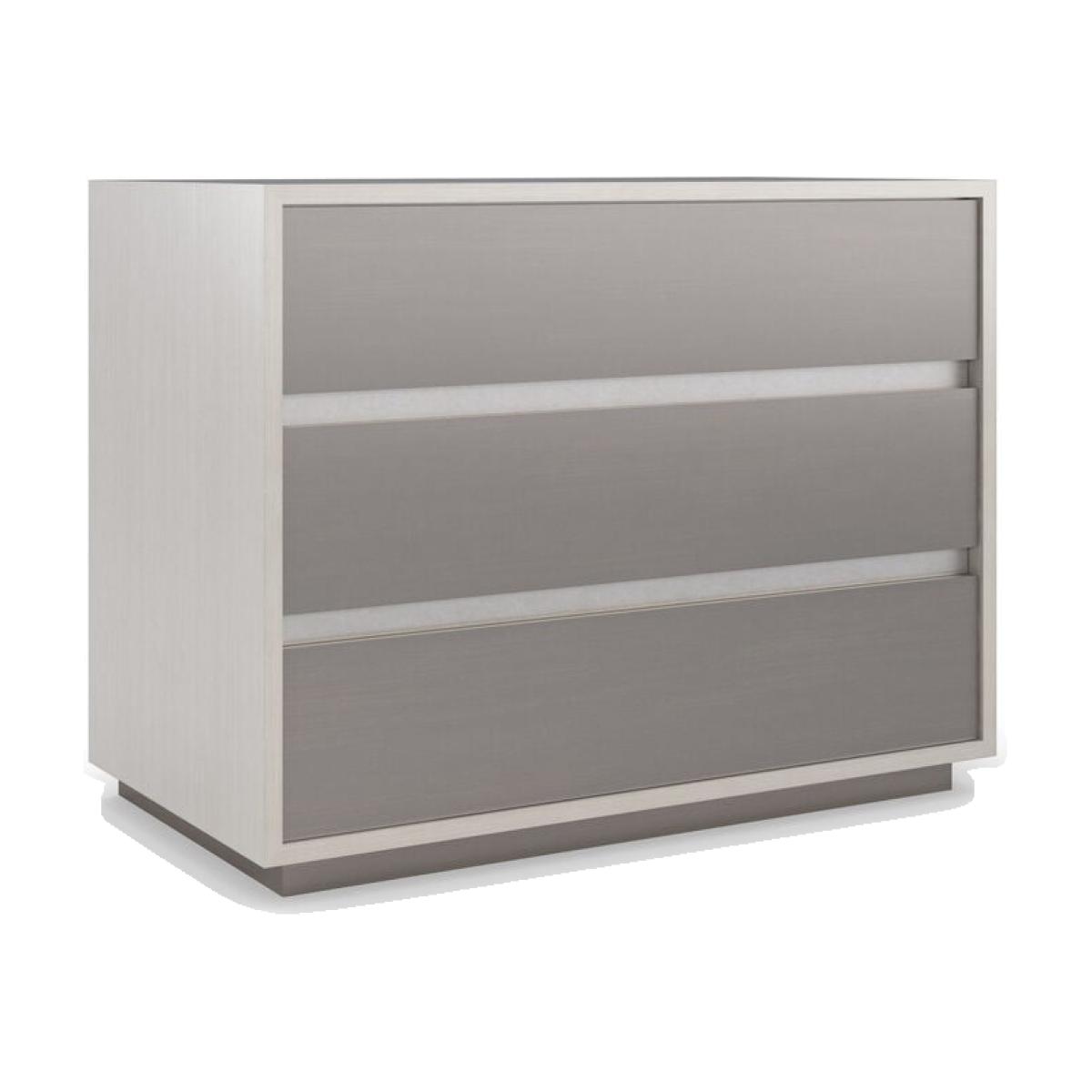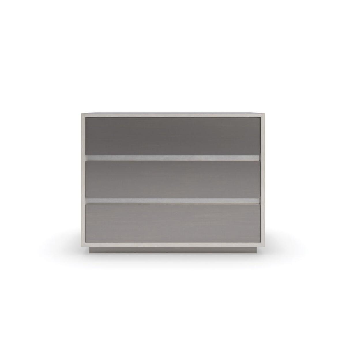 A streamlined style in a monochromatic palette, this large nightstand brings an Italian modern aesthetic to bedroom interiors. Its architectural profile features three spacious drawers, finished in a shimmering Smoked Stainless Steel paint. Its overall Thunder finish adds subtle contrast and gives light to the natural beauty of wood. A USB port on the back lets you discreetly charge your smartphone, laptop, and other devices. Case top and sides in Thunder. Case trim in Smoked Stainless Steel Paint. Three drawers with Smoked Stainless Steel Paint drawer fronts and undermount soft close guides. Drawer interior in cream paint. USB port on back.