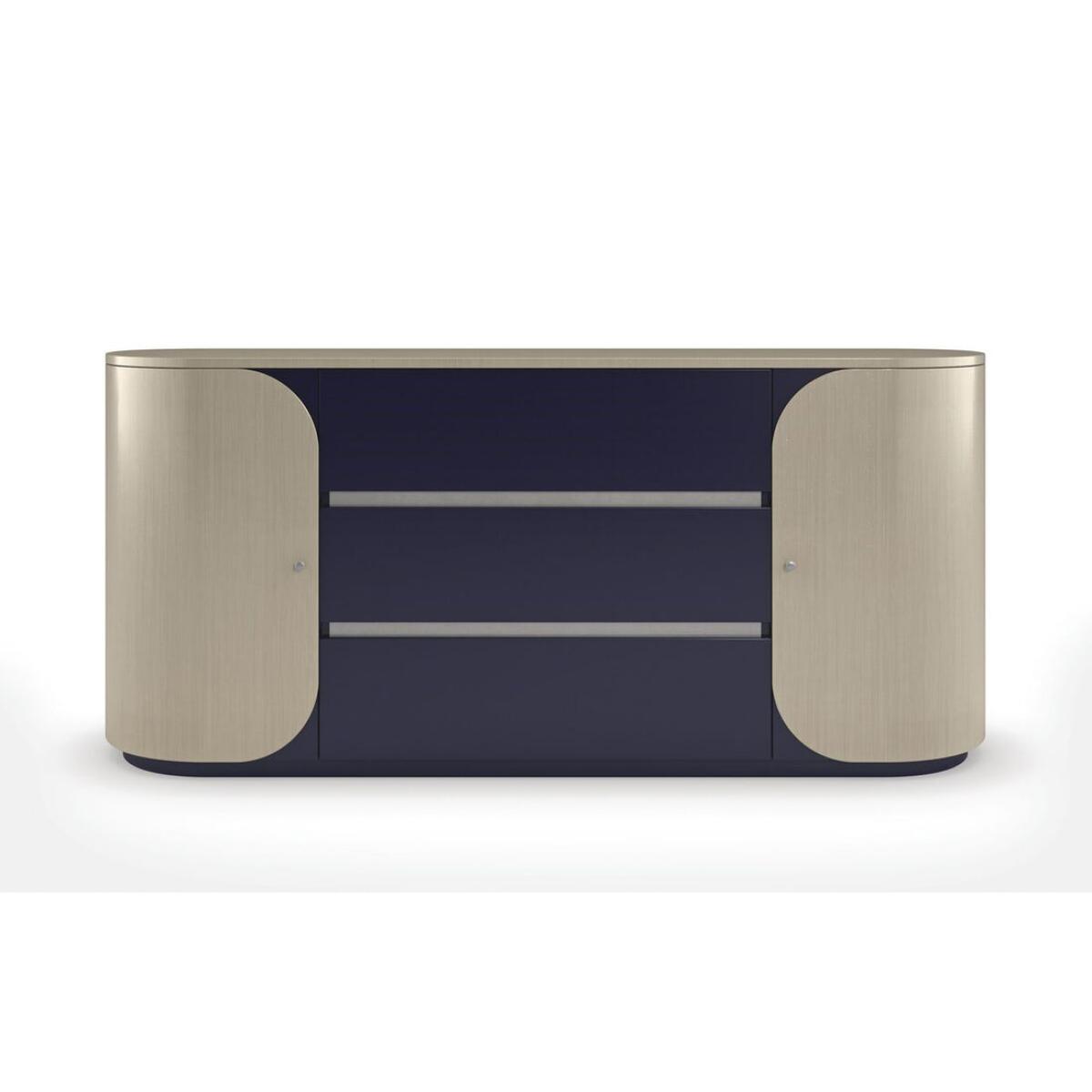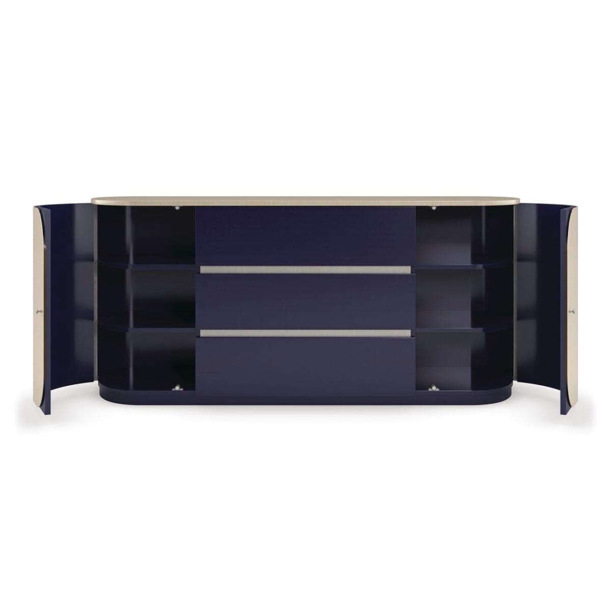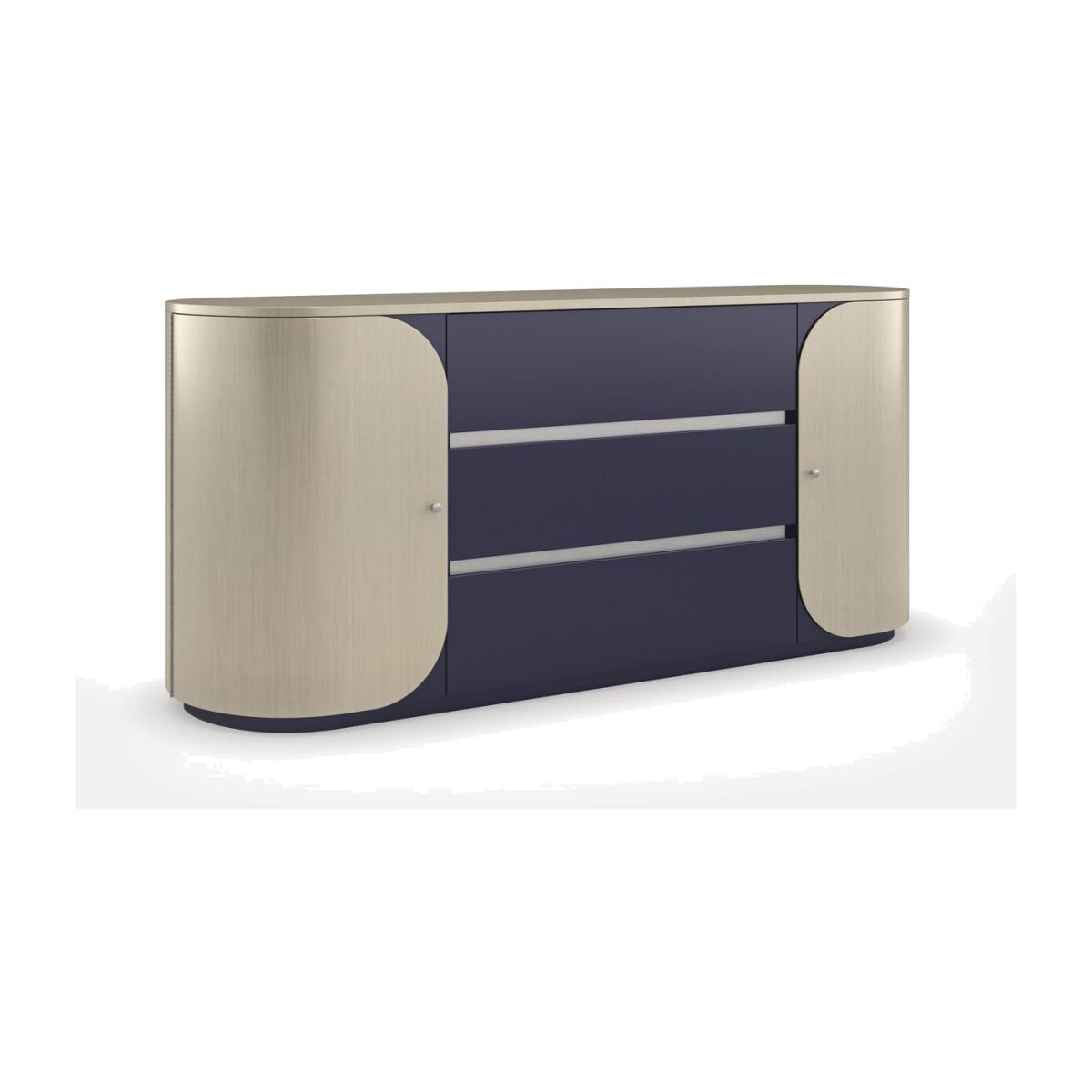 A high-fashion design with a sophisticated profile, this oval-shaped dresser introduces an Italian modern aesthetic and a bold pop of colour to bedroom interiors. Painted drawer fronts in a Prussian Blue hue add depth to its sleek and simple form, accentuated by subtly curved doors in a Thunder finished veneer. Offers abundant storage with three soft-close drawers and two adjustable shelves behind each door. Case in Thunder. Three drawers with fronts in Prussian Blue Paint with soft close undermount drawer guides. Two doors with two adjustable shelves behind each door. Plinth base in Prussian Blue Paint. Door interior in Prussian Blue Paint. Drawer interior in cream paint.