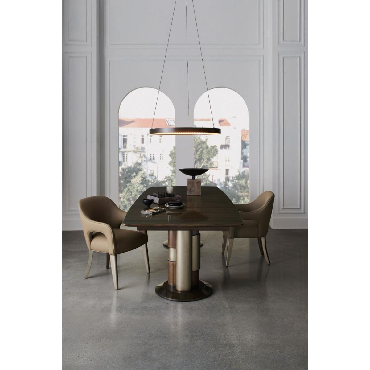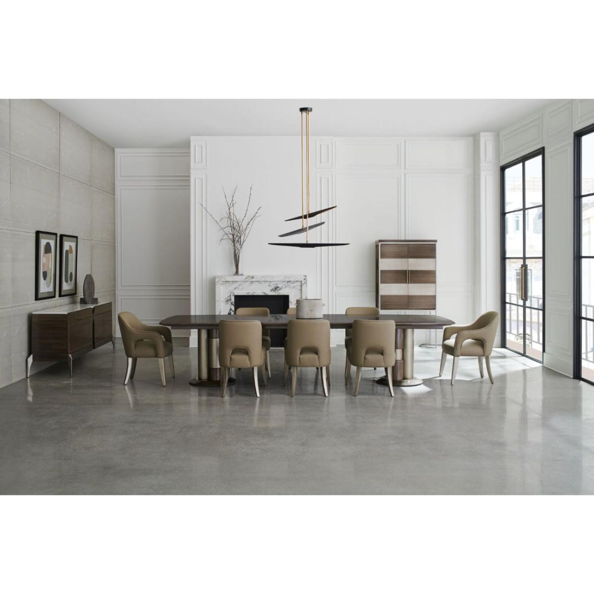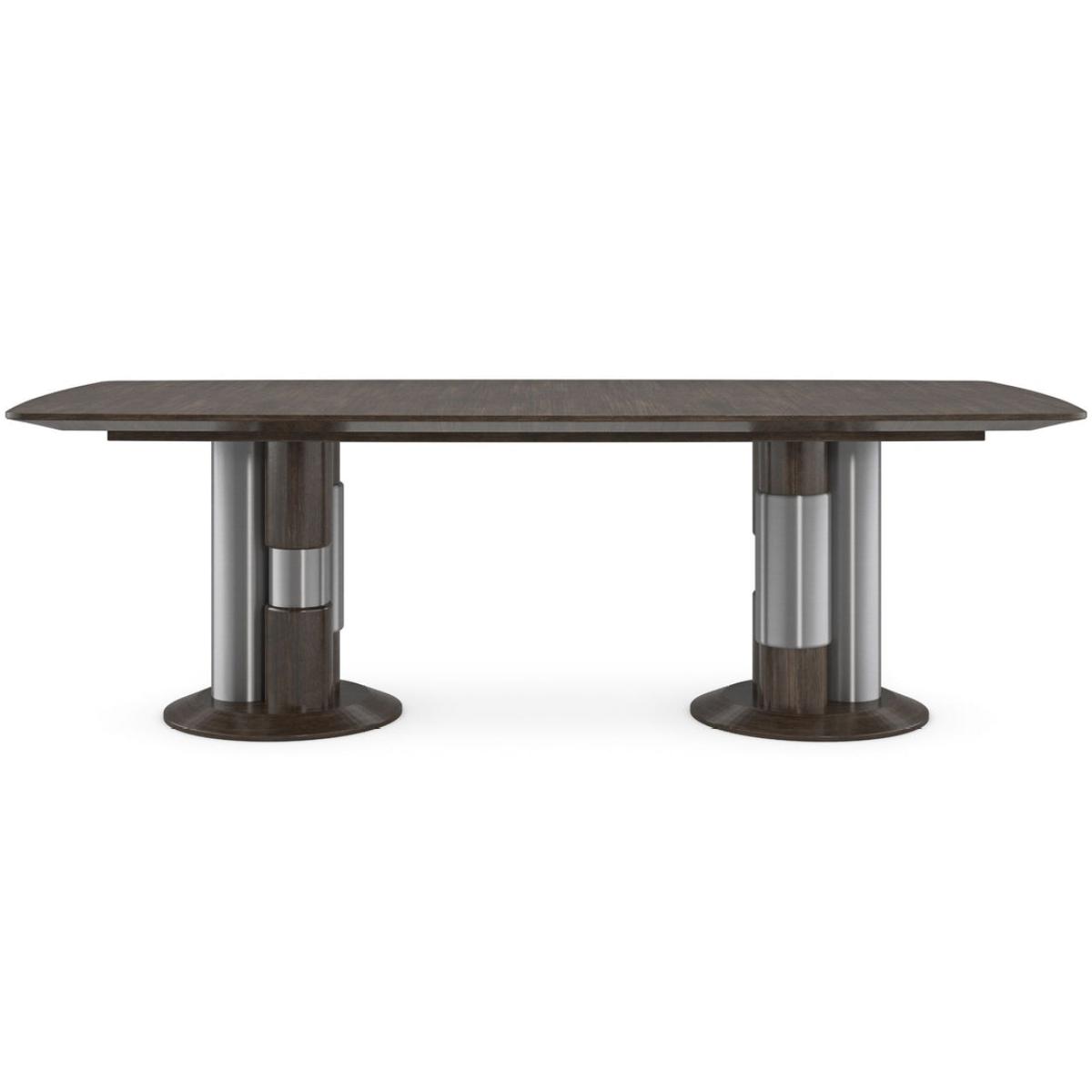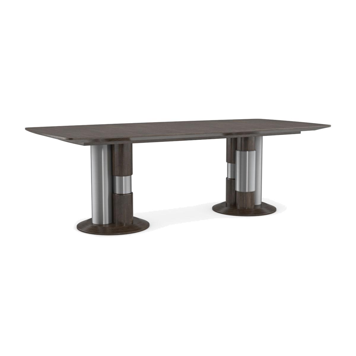Mixing modernism with elements of classical architecture, this extension dining table melds the soft sheen of metal with the natural beauty of wood. Clean-lined and generously sized, a minimalist tabletop with a bevelled apron is balanced on pedestal legs, each composed of three stylized columns in Sepia and Smoked Stainless Steel. Perfect for entertaining and accommodating extra guests, it comfortably seats 12 with the addition of two 20” leaves. Table top in slip matched Paldao finished in Sepia. Apron in Sepia. Legs in Smoked Stainless Steel Paint and Sepia. Base in Smoke Stainless Steel Paint. Table extends to 134" with two 20" leaves. Table seats 12 when fully extended.