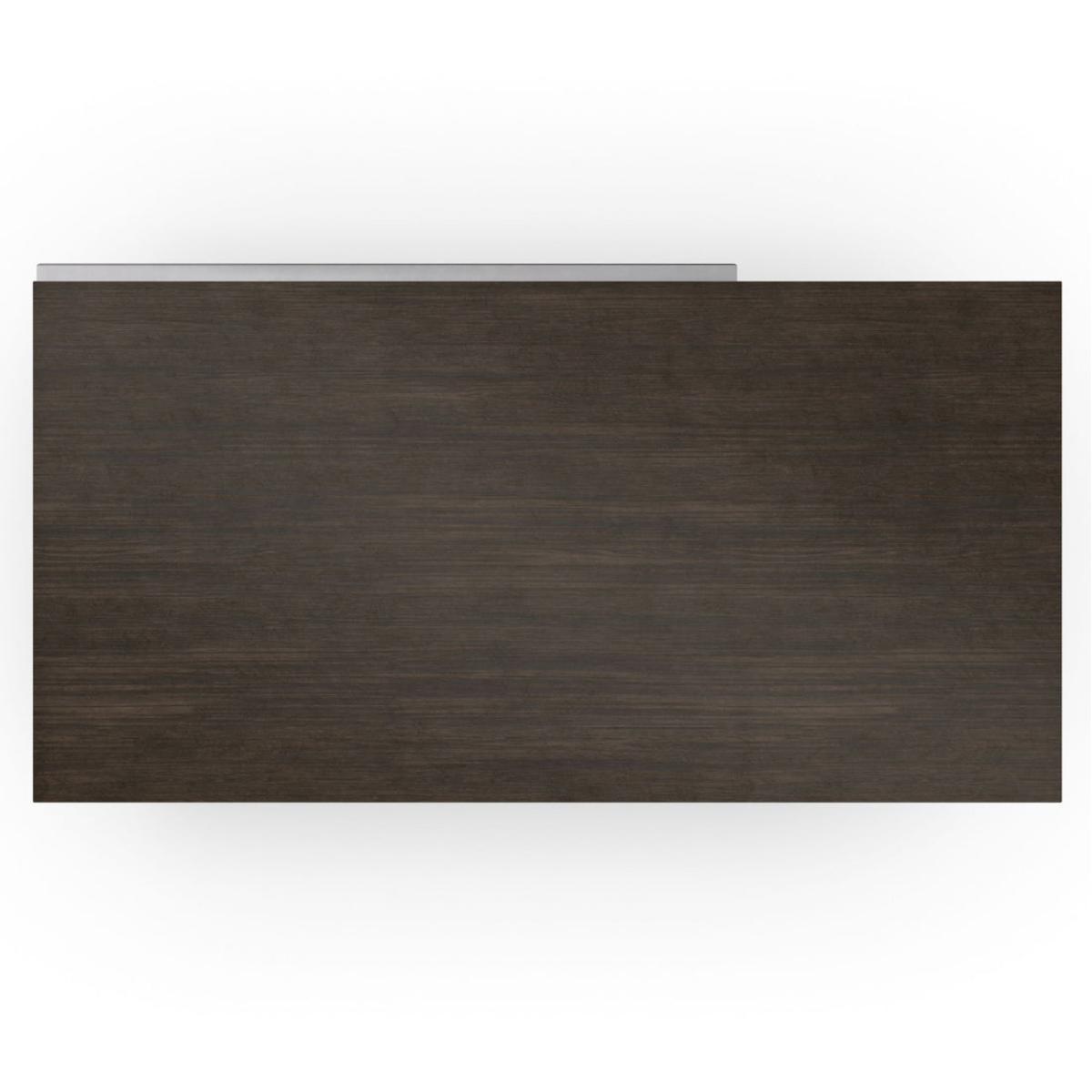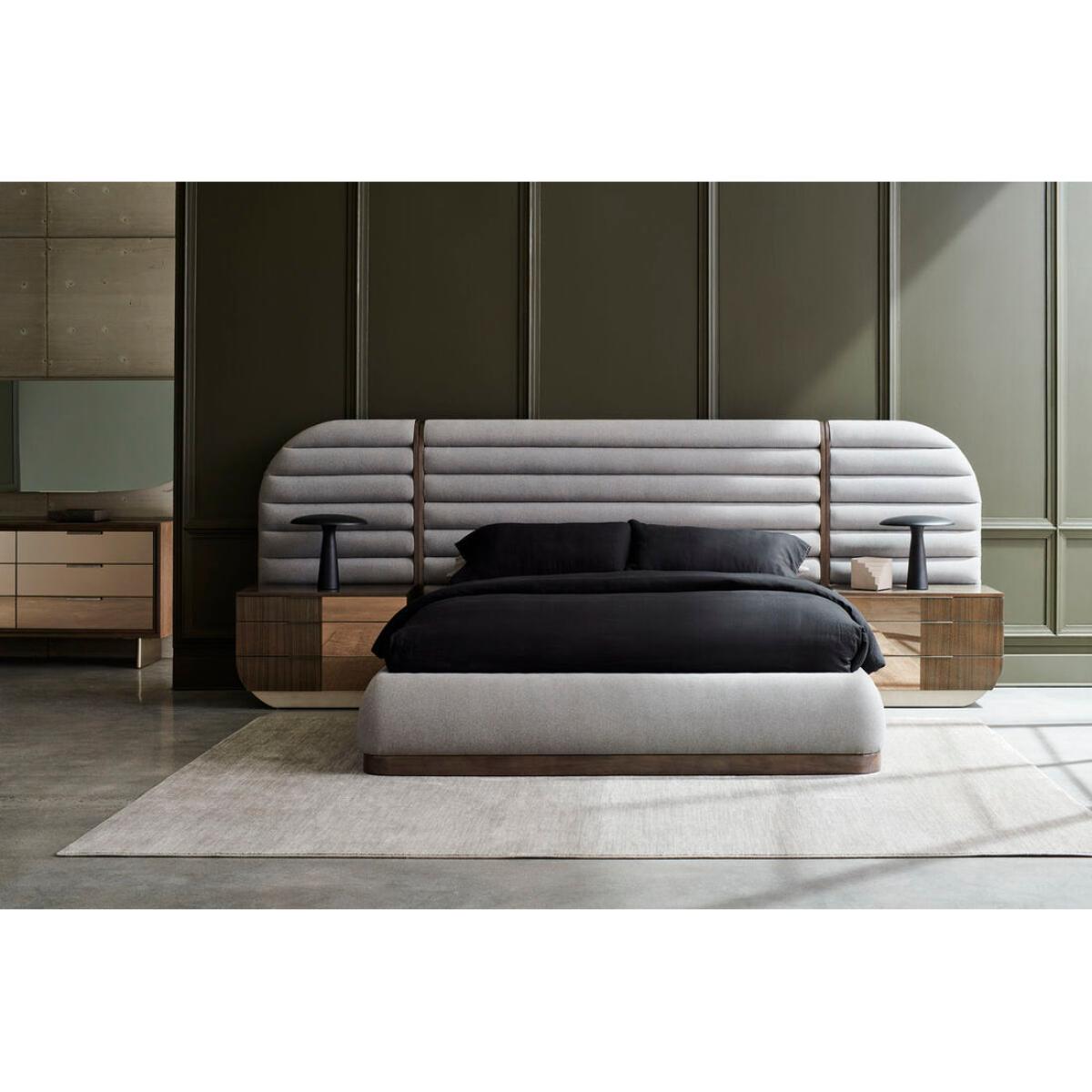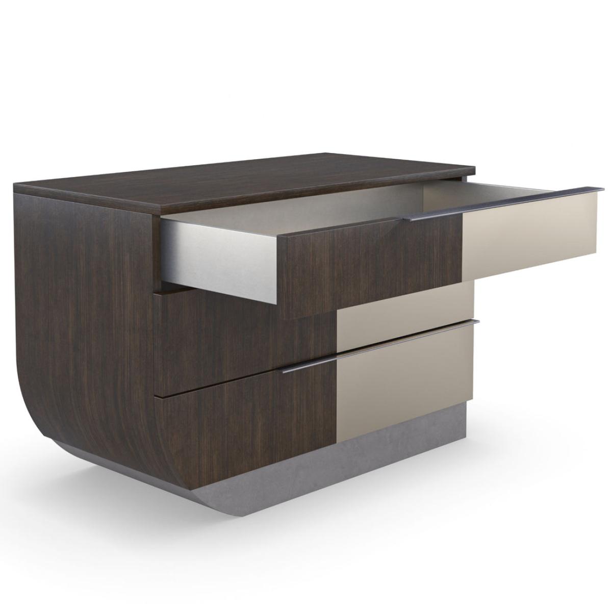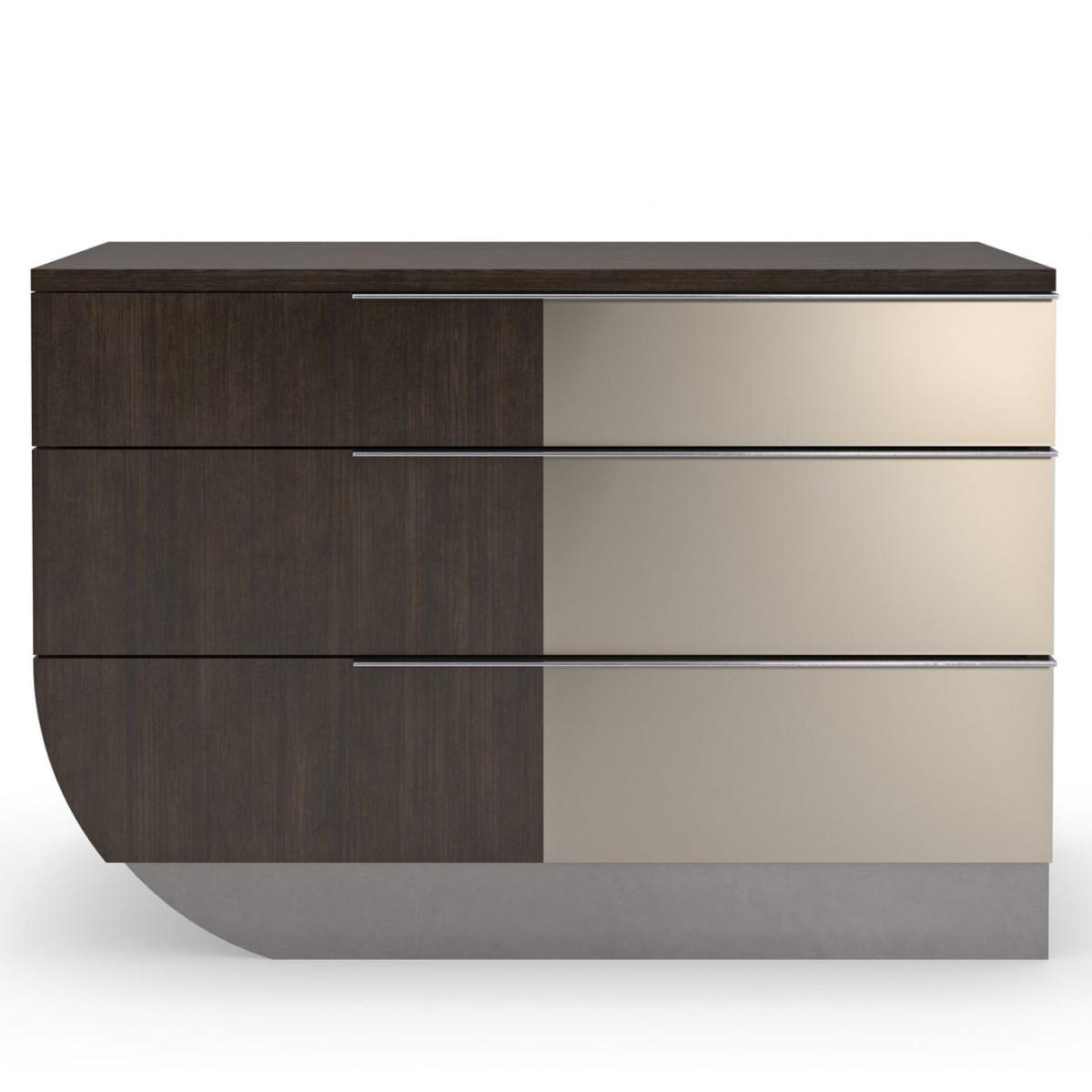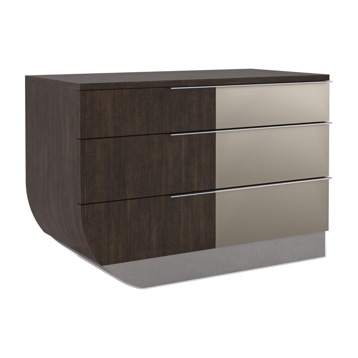Striking a balance between beauty and functionality, this nightstand introduces a Euro-modern design in a modest mix of materials. Divided drawer fronts merge the shimmer of mirrored bronze with a warm wood grain, minimally accentuated by finger-cup pulls in Smoked Stainless Steel. Uniquely designed with a rounded left edge to complement the winged panels of our La Moda bed. Right facing nightstand also available. Case finished in Sepia. Three drawers with fronts in Sepia and Bronze mirror and undermount soft close guides. Drawer interior in Soft Silver Paint. Base in Smoked Stainless Steel Paint.