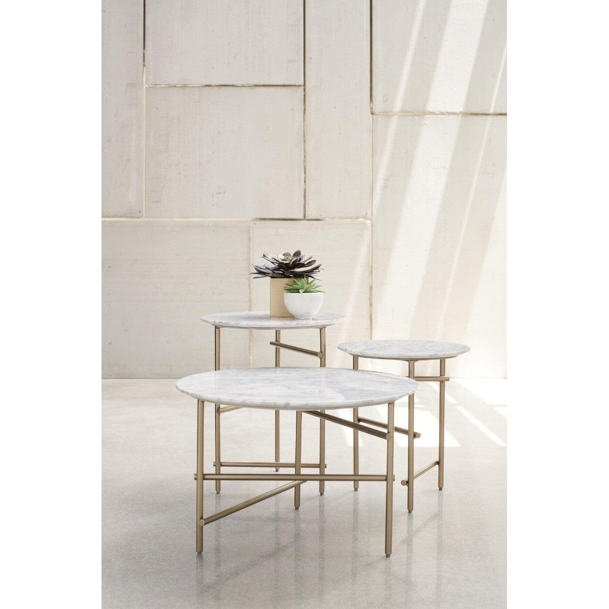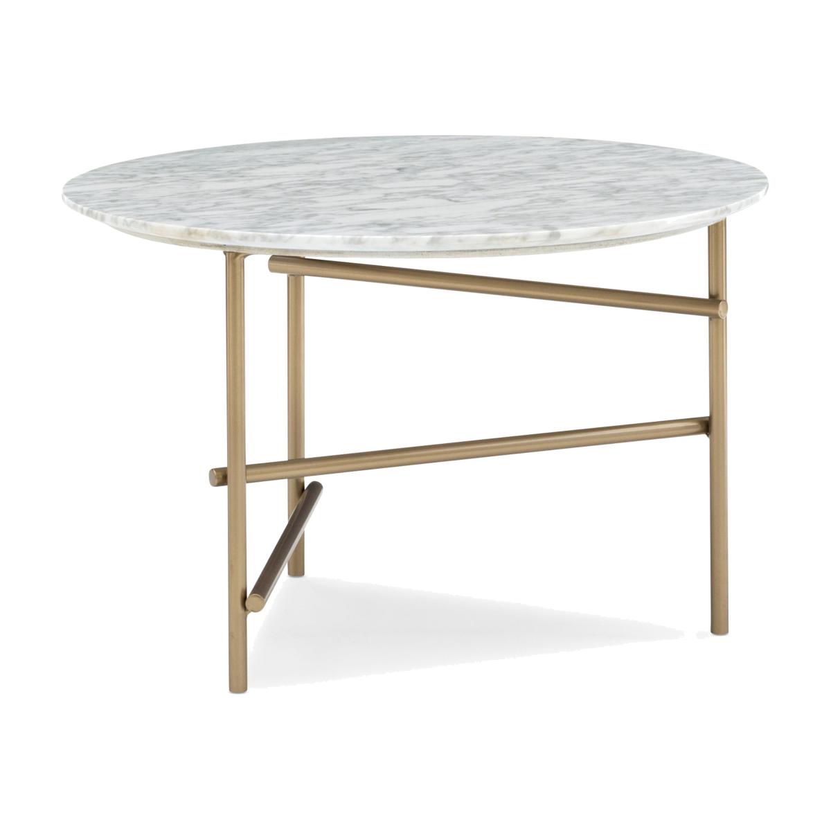 Bring a touch of the unexpected into your living space with the symmetrical beauty of this chic cocktail table. Its bold presence is achieved with a luxurious mix of materials, including a ¾-inch thick Carcasta marble top supported by a metal base plated in Lucent Bronze. Designed to bunch, pair, or float within various living room settings, this distinctive circular side table is multifunctional at heart. Even its base conveys modern style with angular supports that offer a contemporary take on rustic construction. Plated metal base finished in Lucent Bronze Smooth Metallic Paint. 3/4" thick Caracasta marble top.