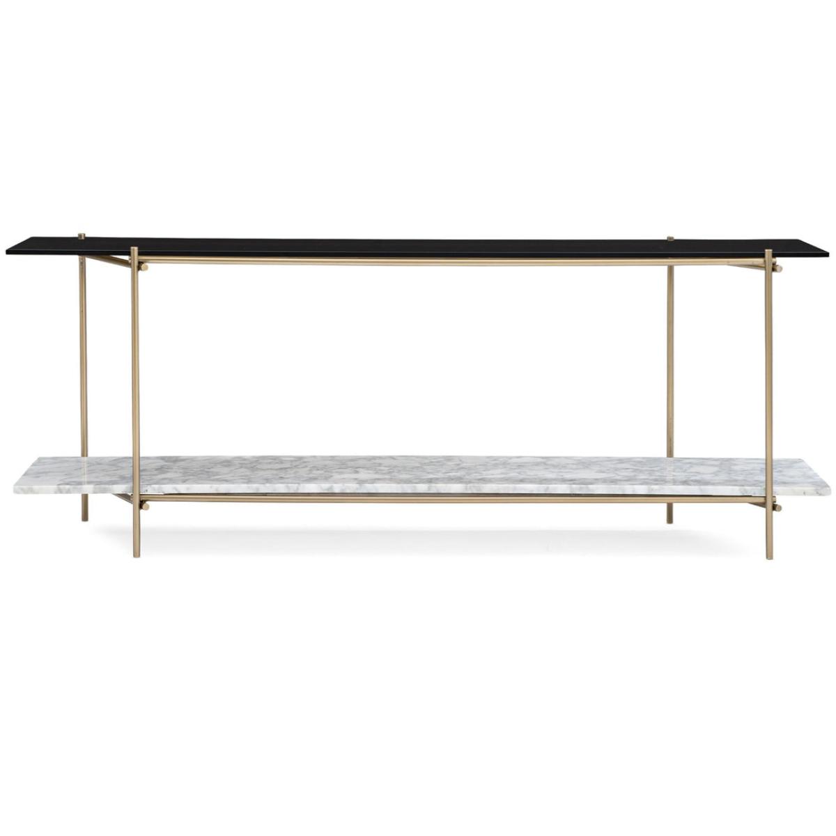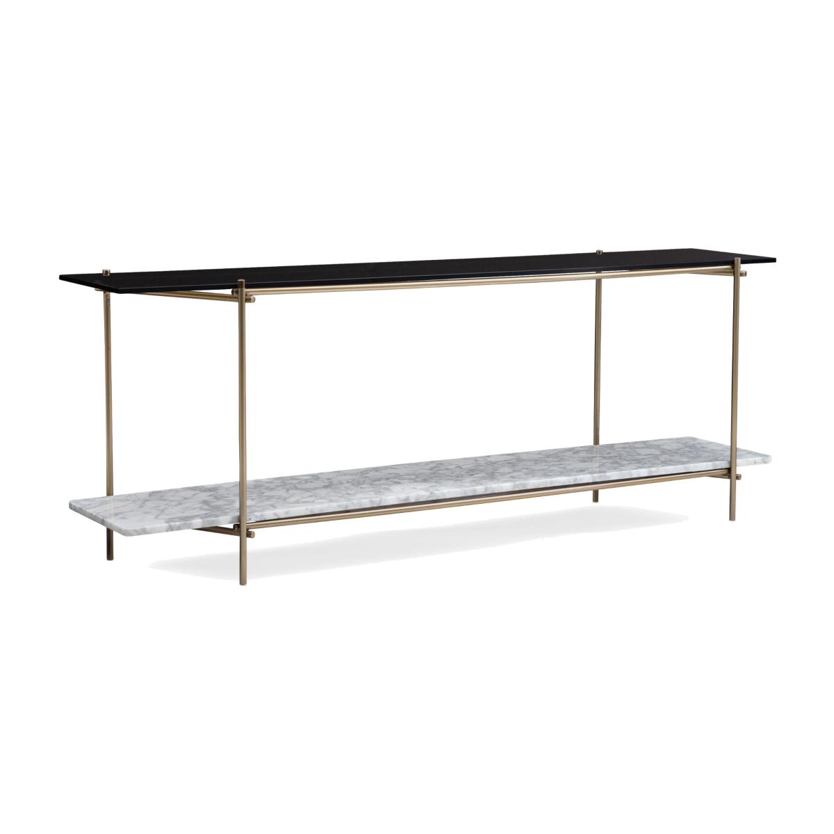 Glass, metal, and stone meet and meld in this exceptionally beautiful console table. Its modern silhouette is open and airy yet offers substantial presence. At the top you'll find an elegant plane of glass tinted in a warm brown that lets you look through to see the beauty beneath. Visible from above, the bottom shelf is crafted of ¾-inch slab of Carcasta marble. Both glass and stone are outlined in a plated-metal frame finished in a luxurious Lucent Bronze. This console table's stylish base features angular supports that offer a contemporary take on rustic construction while each design element is skilfully balanced to create a singular look that will stand out wherever it's located. Plated metal frame finished in Lucent Bronze Smooth Metallic Paint. 12mm thick brown tinted tempered glass top. 3/4" Caracasta laminated bottom stone shelf. Ships KD.