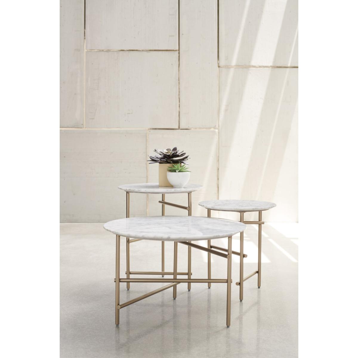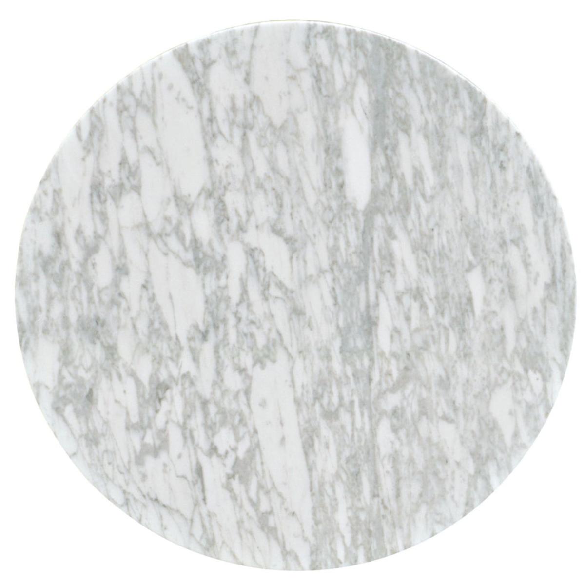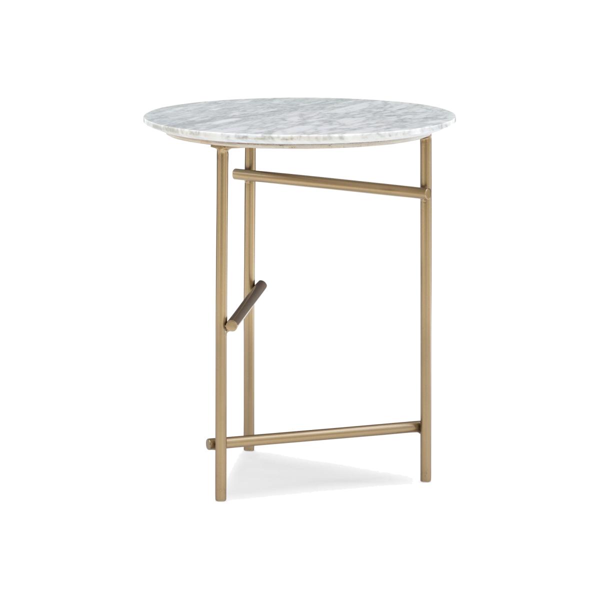 Bring a touch of the unexpected into your living space with the symmetrical beauty of this chic side table. Its bold presence is achieved with a luxurious mix of materials, including a ¾-inch thick Carcasta marble top supported by a metal base plated in Lucent Bronze. Designed to bunch, pair, or float within various living room settings, this distinctive circular side table is multifunctional at heart. Even its base conveys modern style with angular supports that offer a contemporary take on rustic construction. Plated metal base finished in Lucent Bronze Smooth Metallic Paint. 3/4" thick Caracasta marble top.