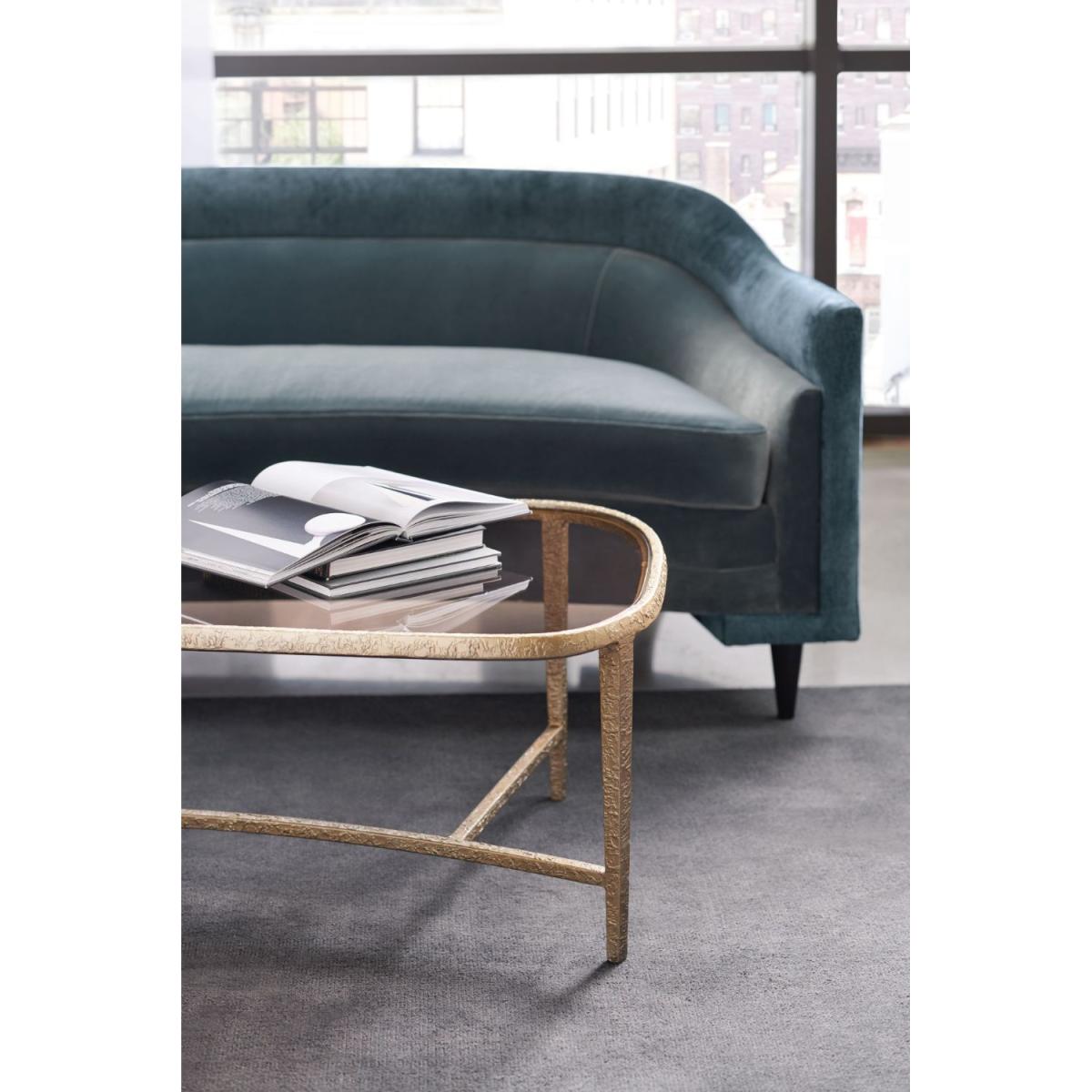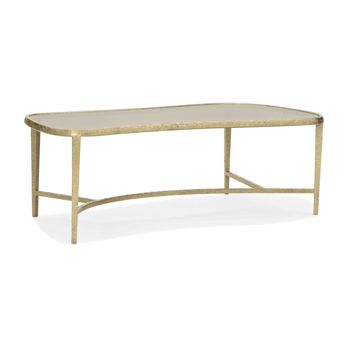 Light yet warm, this luxurious cocktail table captures the essence of modern organic styling and brings it home. Its clean lines meet rich, luxurious materials to create a visual that's polished yet welcoming. The ultimate mate to your favourite sofa or sectional, this distinctive cocktail table boasts a rich mix of materials that includes a glass top tinted in a warm shade of brown supported by a cast-metal frame finished in a textured Lucent Bronze Metallic Paint. The organic form and unique texture of this Contour table brings movement into the occasional setting while anchoring it in style. Cast metal frame finished in Lucent Bronze Textured Metallic Paint. 8mm tempered brown tinted glass top. Ships KD.