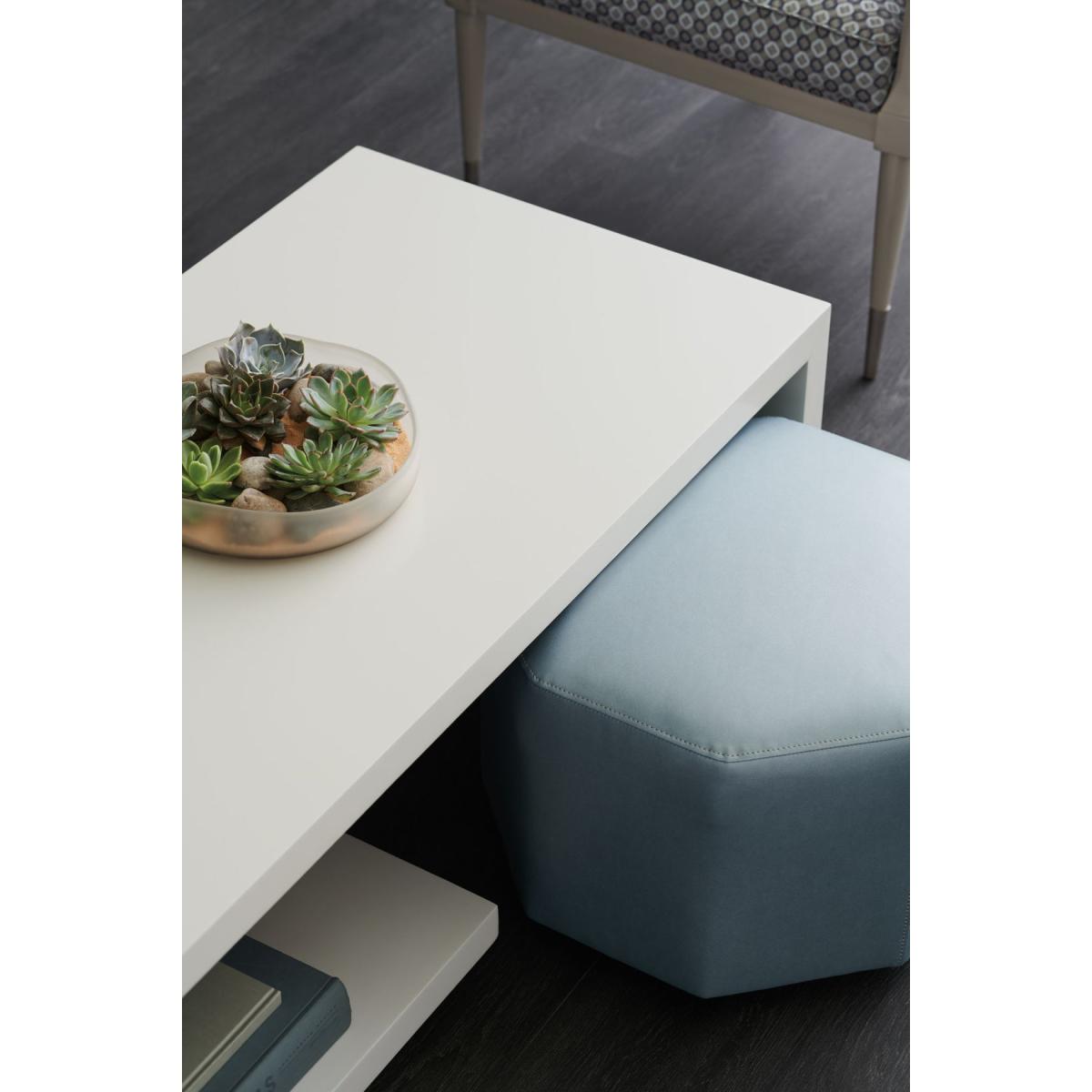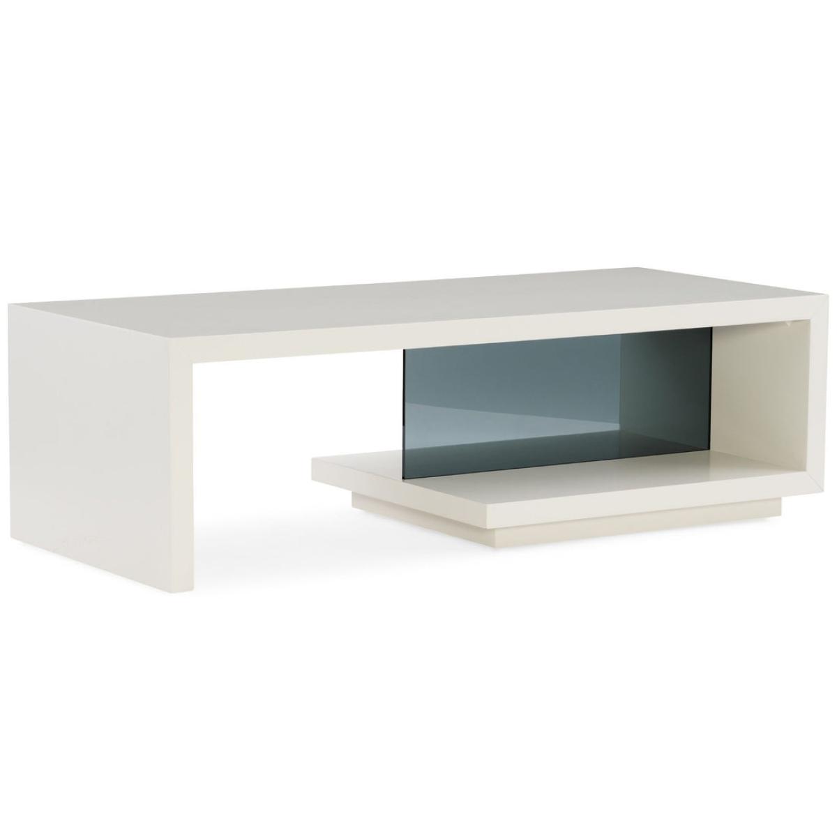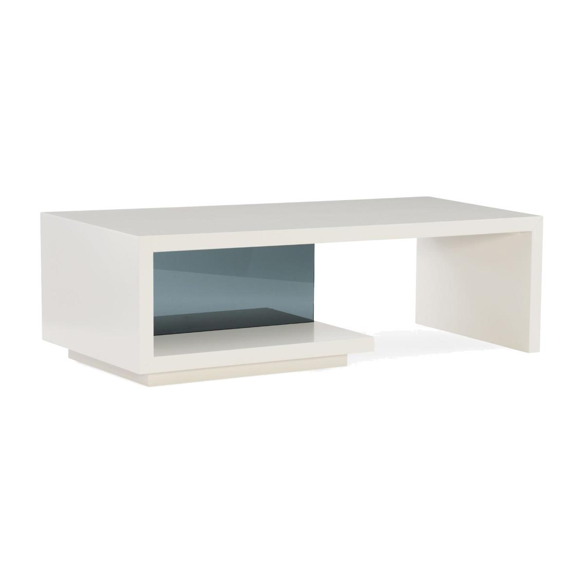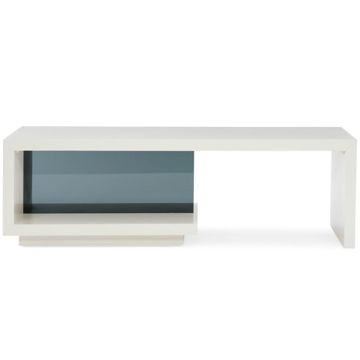 Bold in form and perspective, this unmistakable cocktail table takes linearism to the max. A Winter Haze finish highlights its signature shape while a smoked, grey glass insert panel distinguishes the back. An open area provides room for storage and a plinth base completes its undeniable appeal‚ making it the perfect anchor to a modern seating area. Case finished in Winter Haze. Smoked grey glass insert back panel. Open storage area. Plinth base.