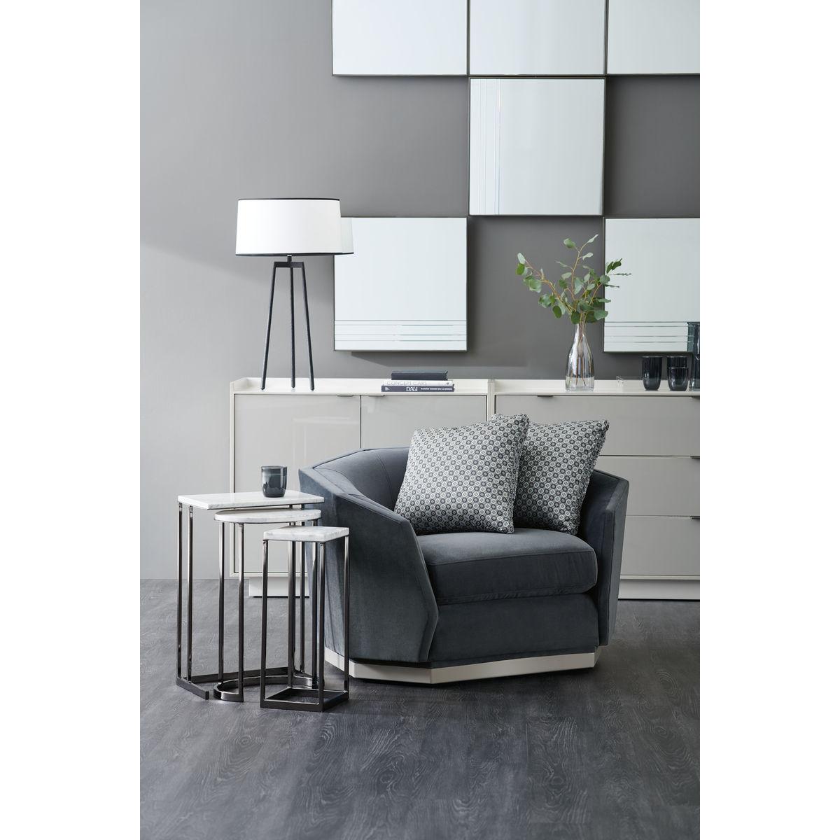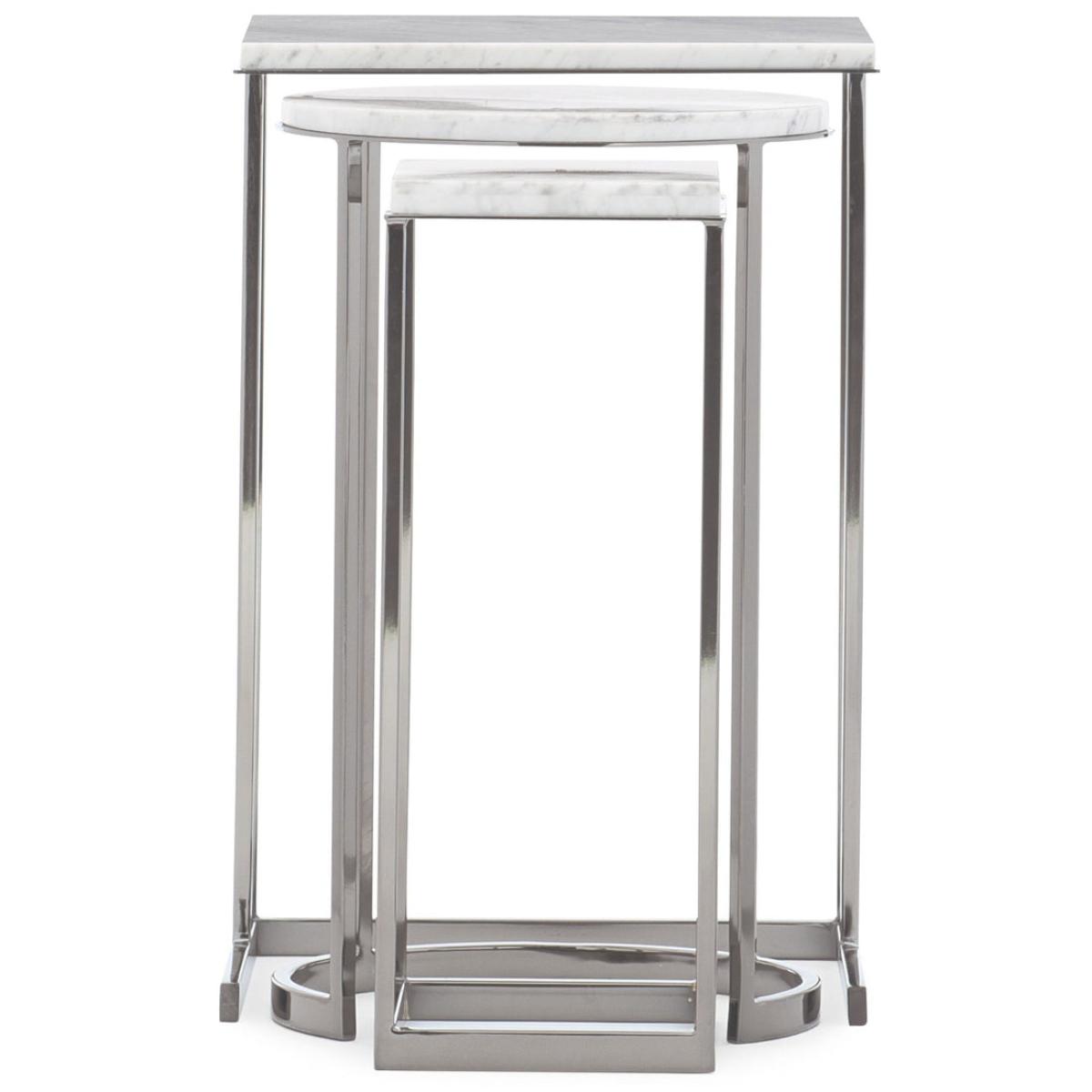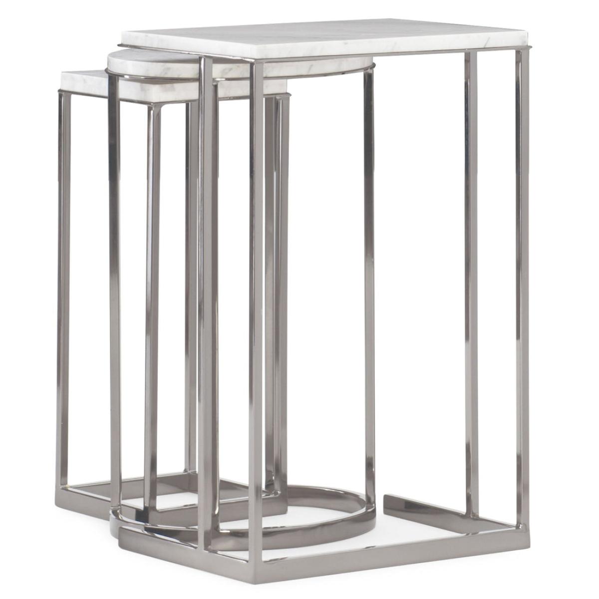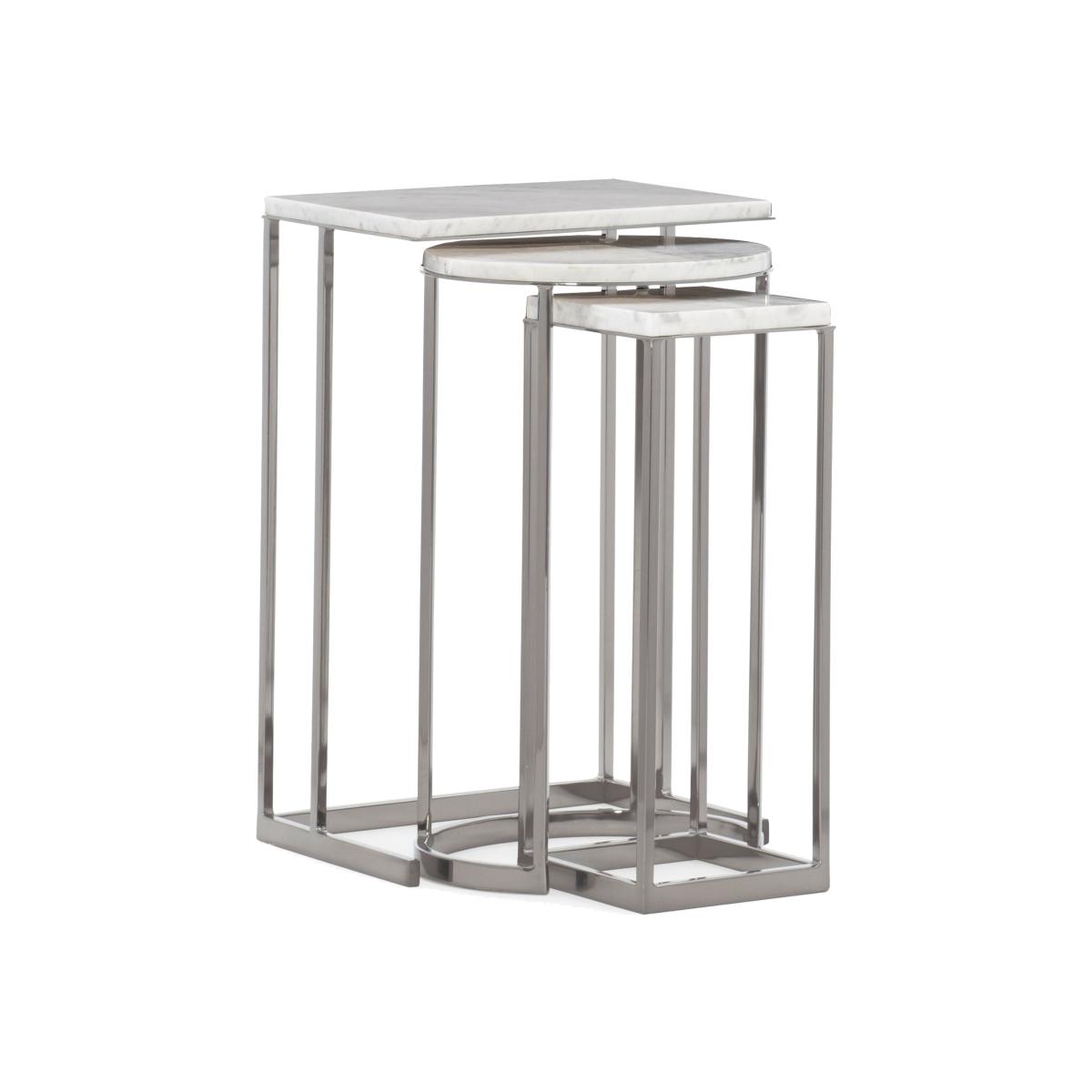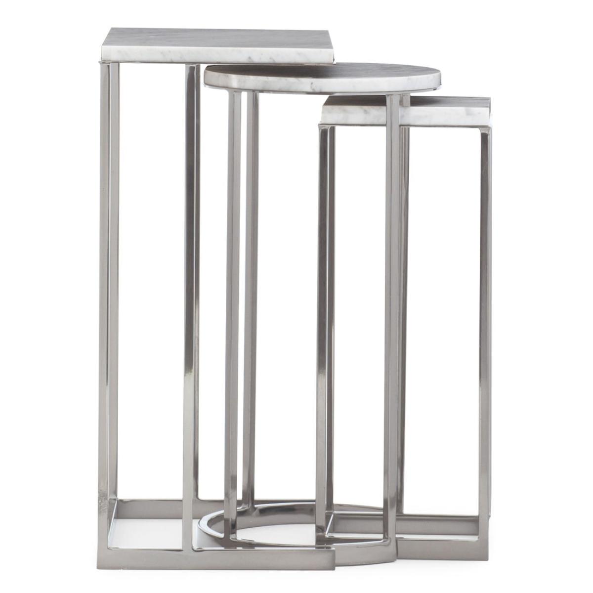 With three times the function and triple the flair, these nesting end tables are destined to become a favourite. Keep them stacked most of the time and pull them out when you're entertaining or need more room for beverages or snacks. Topped with luxurious Carrera marble and finished in Plated Nickel, each one is intriguing on its own‚ but nest them together and you have a remarkable design solution with modern appeal. Metal bases in Plated Nickel. Tops are Inset Carrara marble. Rectangle: 41. 3 W x 28. 6 D x 63. 5H. Oval: 36. 2 W x 29. 8 D x 59. 7H. Square: 21. 6 W x 21. 6 D x 55. 3. H