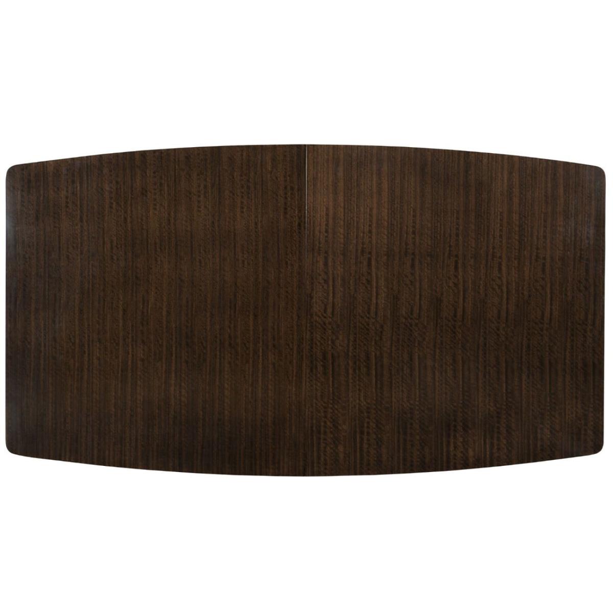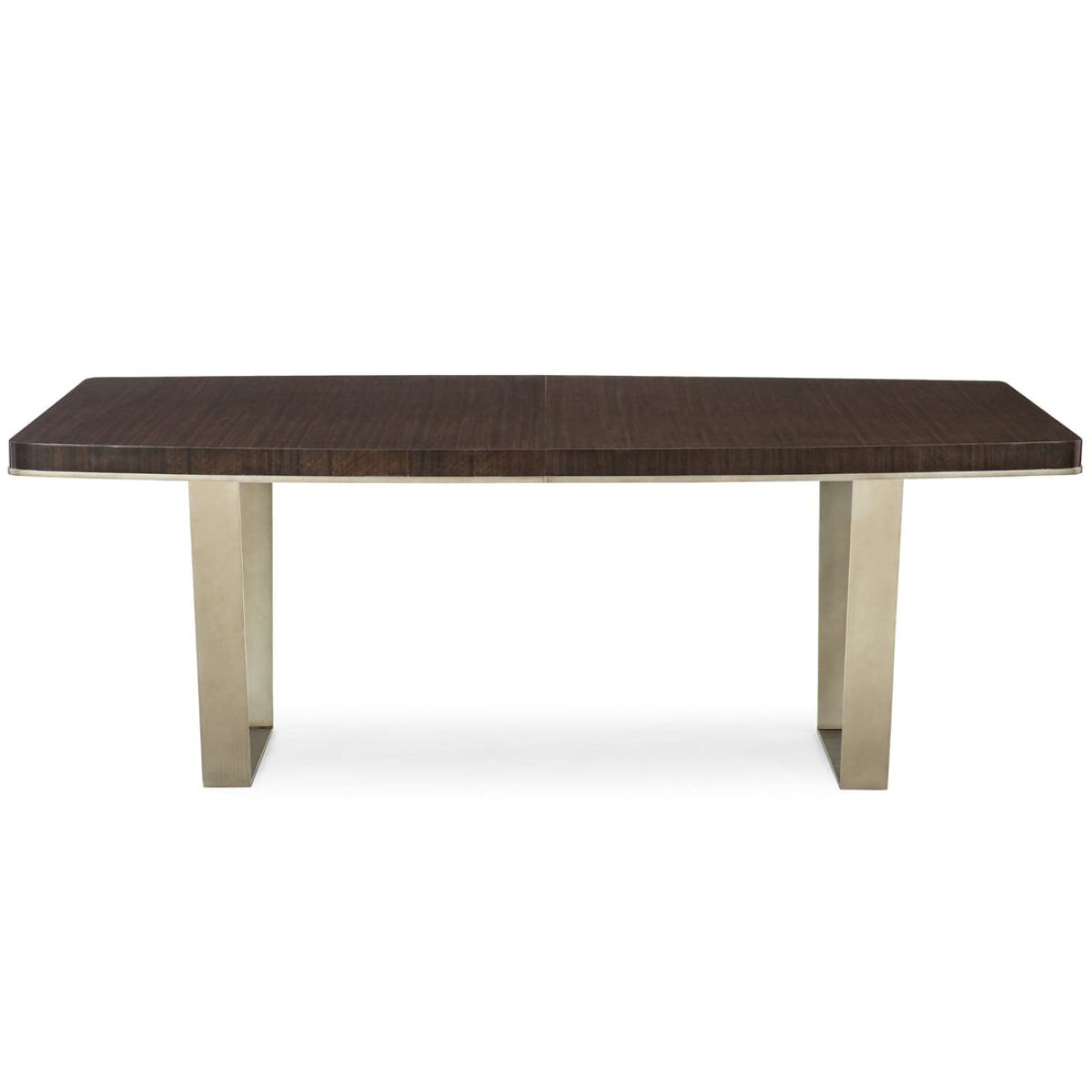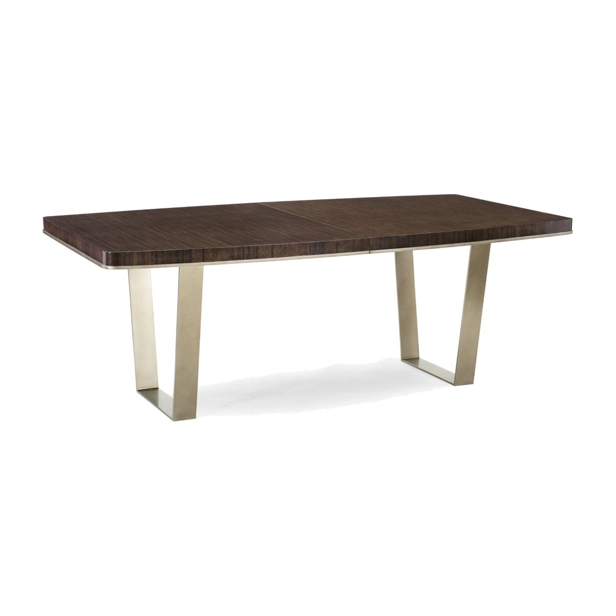 The memorable grain of fumed figured eucalyptus comes to life atop a dining table that is suspended by angled, contemporary metal braces. The wood's Aged Bourbon finish results in a commanding presence that can be expanded to easily seat 10 people. The accent moulding is showcased in a band of Smoked Bronze that matches the sculptural metallic legs. The rounded rectangular shape of this table encourages conversation over a great meal. Table top and aprons in Aged Bourbon with accent moulding on aprons in Smoked Bronze. Trestle frame is metal in Smoked Bronze. Table extends to 104" with one 22" leaf. Ships KD.
