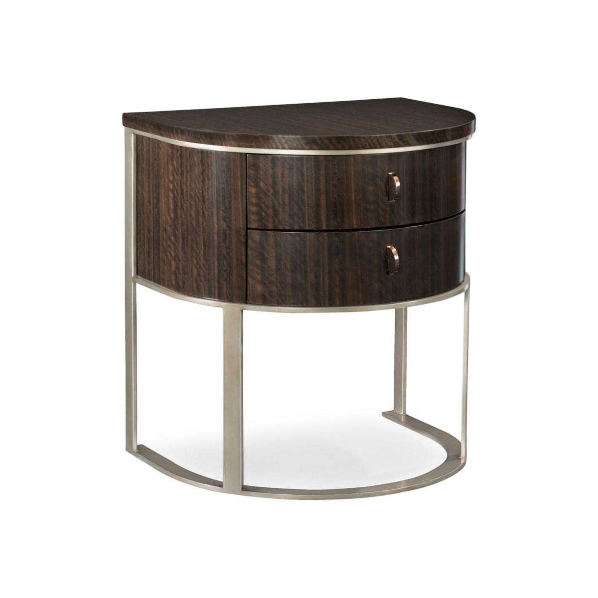 This half-moon-shaped nightstand is constructed of fumed figured eucalyptus that has been finished in Aged Bourbon with a high sheen. Two rounded drawers open with custom Smoked Bronze metal pulls in the shape of half-moons. Interiors are finished in a Dark Chocolate painted finish. A Smoked Bronze band outlines the front edge, and the entire piece rests atop a Smoked Bronze metal frame. Case in Aged Bourbon with metal frame and trim in Smoked Bronze. Two drawers with undermount soft-close guides. Drawer interiors in Dark Chocolate paint.