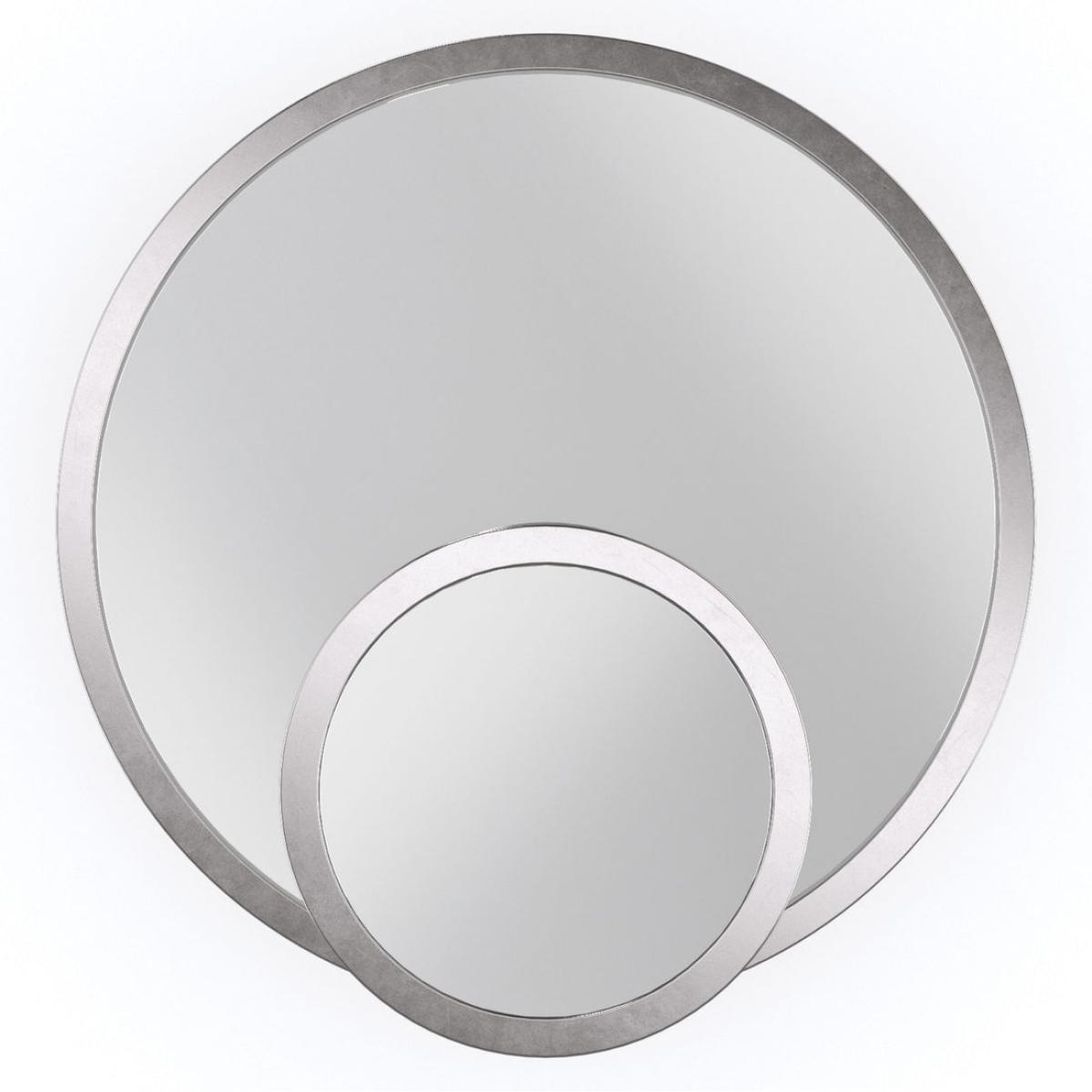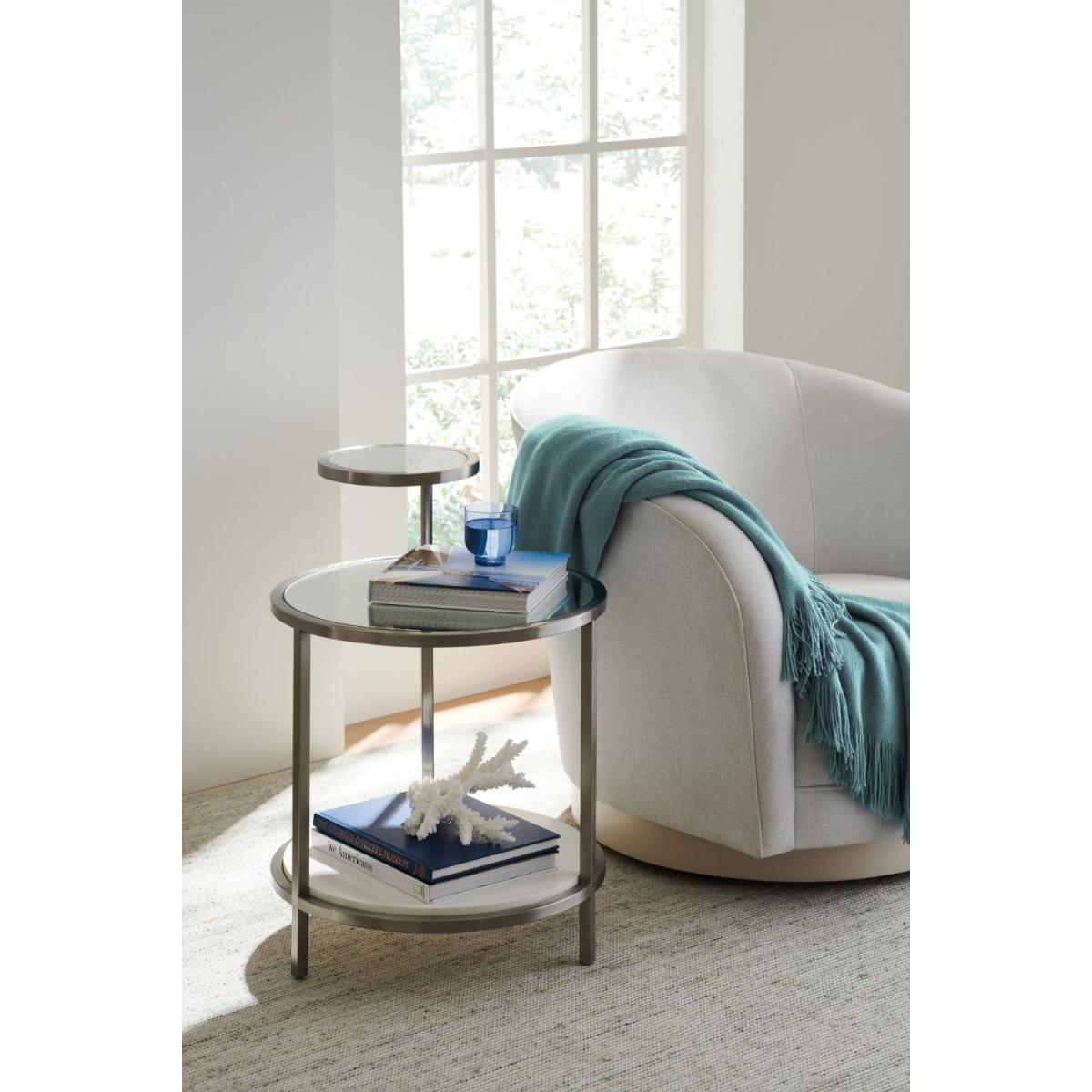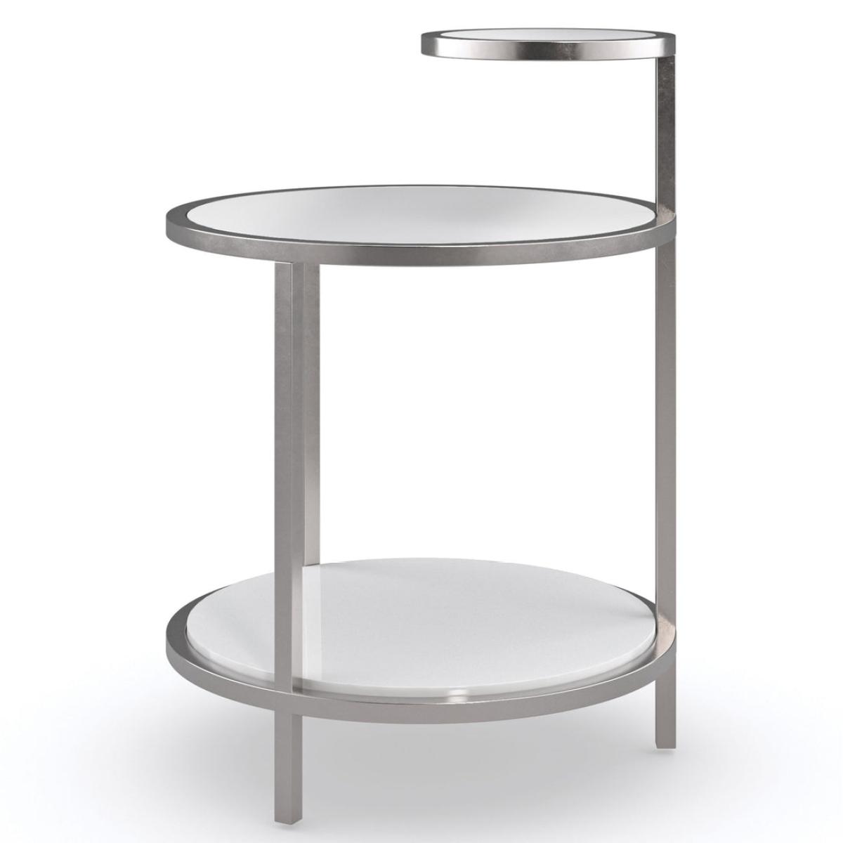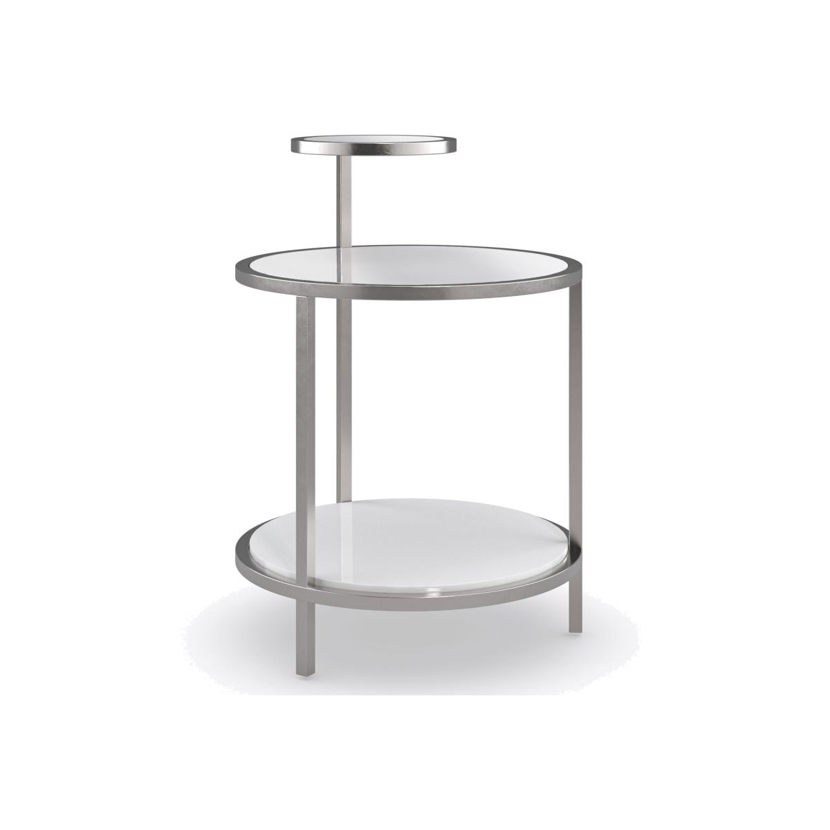 Mixing metal and mirror, this modern side table adds depth, dimension, and subtle shimmer. Features a mirrored top shelf –perfectly sized for a cup of tea or icy drink– that swivels in place for just-right positioning. Style alongside a statement seat to complement curves or counter clean lines. Metal frame in Satin Nickel. Mirrored top. Mirrored top shelf which swivels for custom positioning. Bottom shelf in Cloud White.