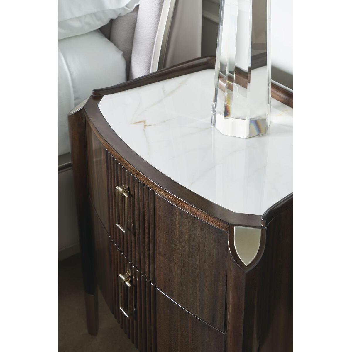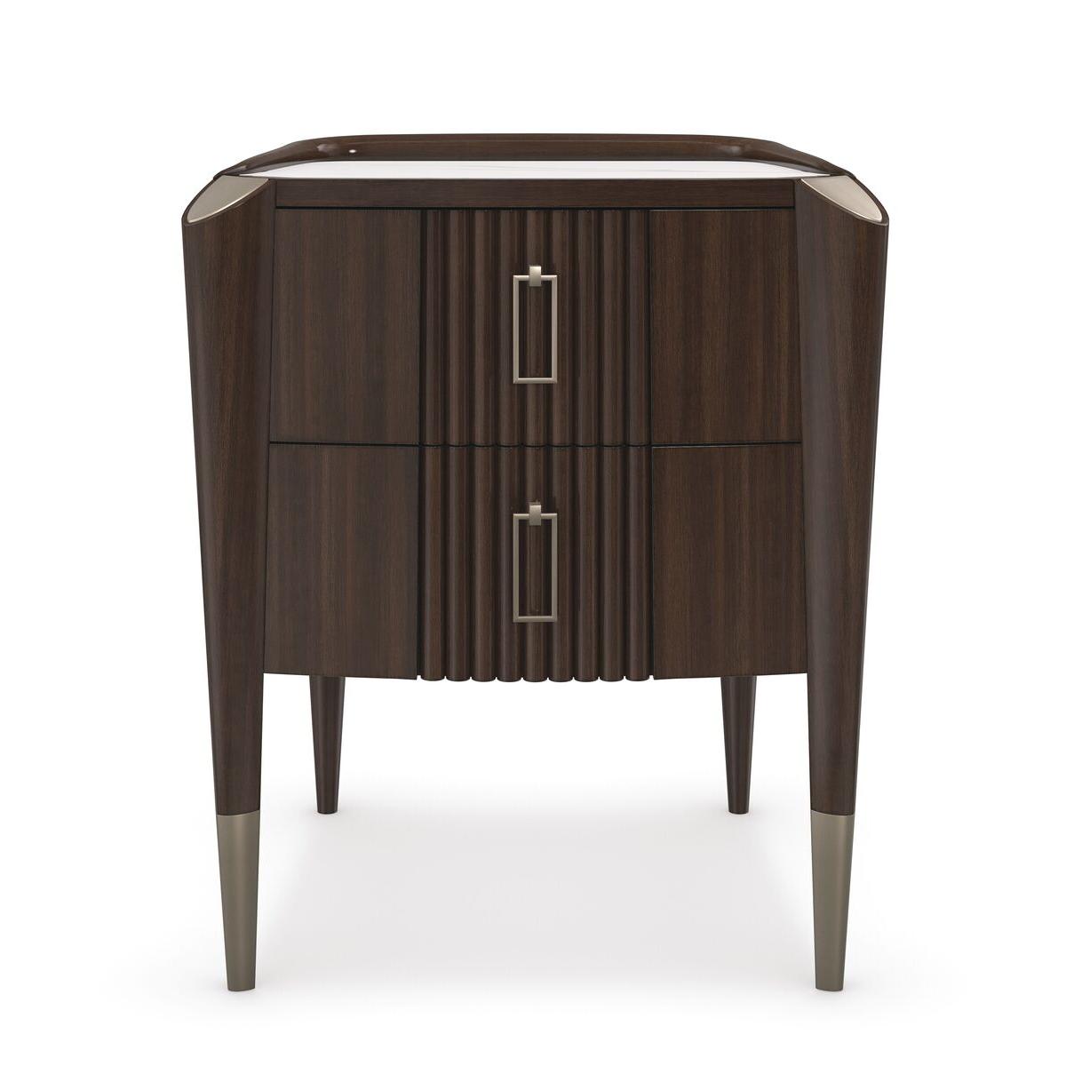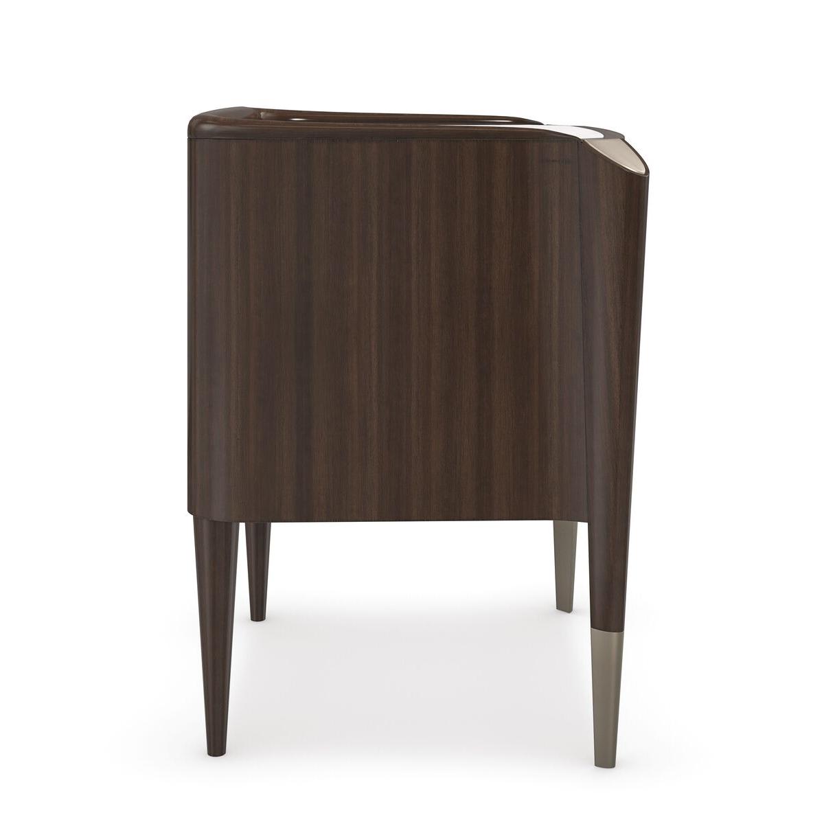 Top is Kararagin stone with rail in Stallion. Case in Stallion, legs in Stallion stain with top posts in Afterglow and trim in Pyrite. Bottom leg posts in Pyrite. Two drawers with undermount soft close guides. Drawer Interior in UV Nightshade.