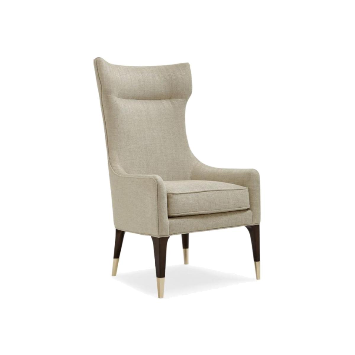This fully upholstered wing chair has been updated with a fabric that completely surrounds this tall silhouette. Perfect for the head of the table, as a desk chair or for occasional seating, it stands on dark Seal Skin legs tipped in Whisper of Gold metal ferrules. Dimensions: H: 119.4 x W: 68.6 x D: 81.3cm Materials:  Birch Wood