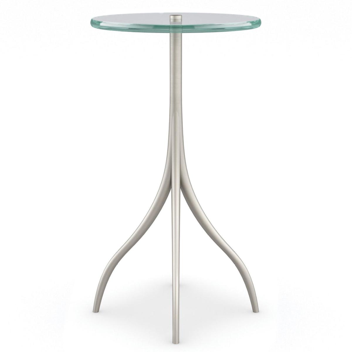 On point in any setting, this petite accent table is perfectly scaled for creating conversation areas. Adds a note of elegance, with an effervescent glass top and slender metal base in Soft Silver paint. Well-sized for sitting down a drink or displaying fresh flowers in a vase. Glass top. Metal base in Soft Silver Paint.