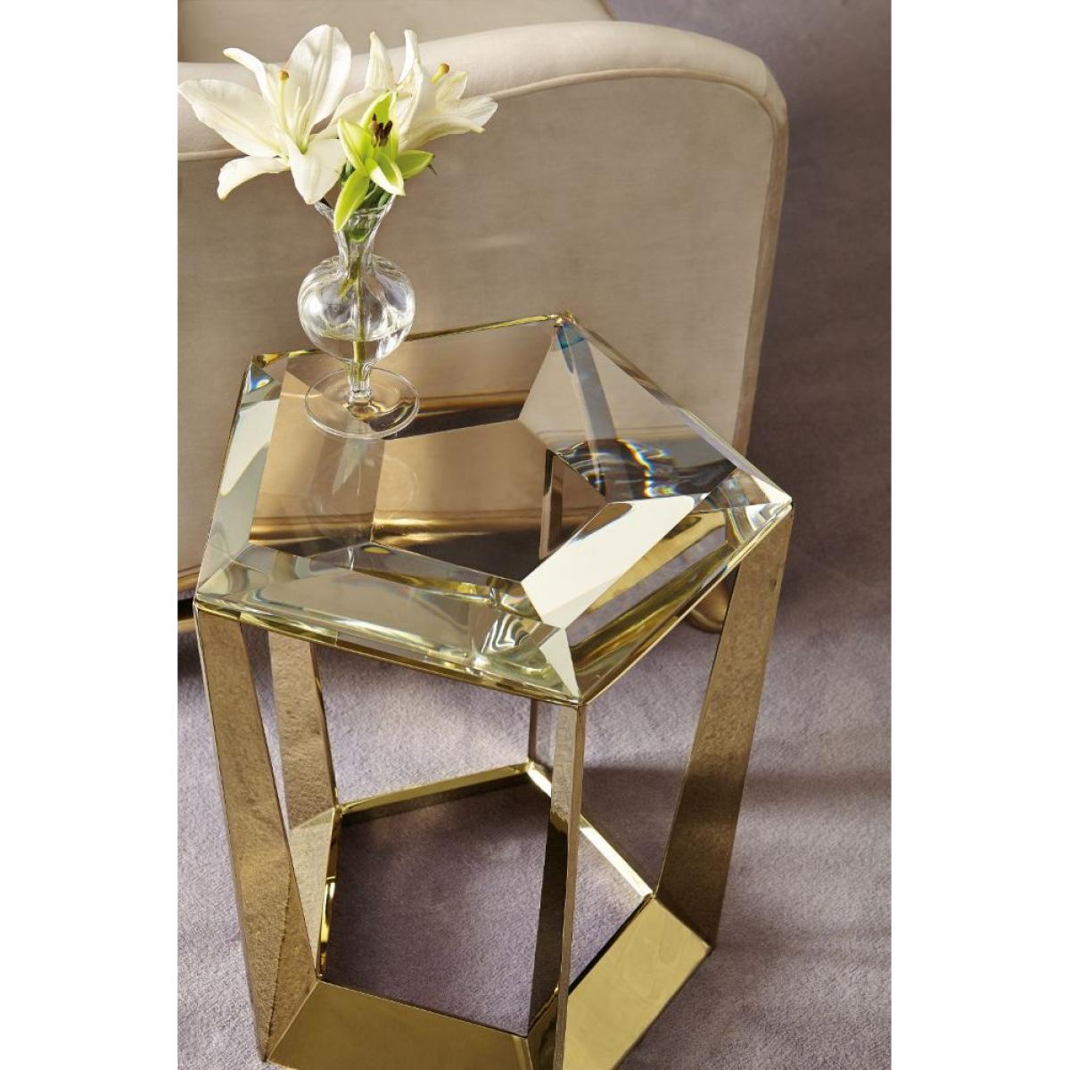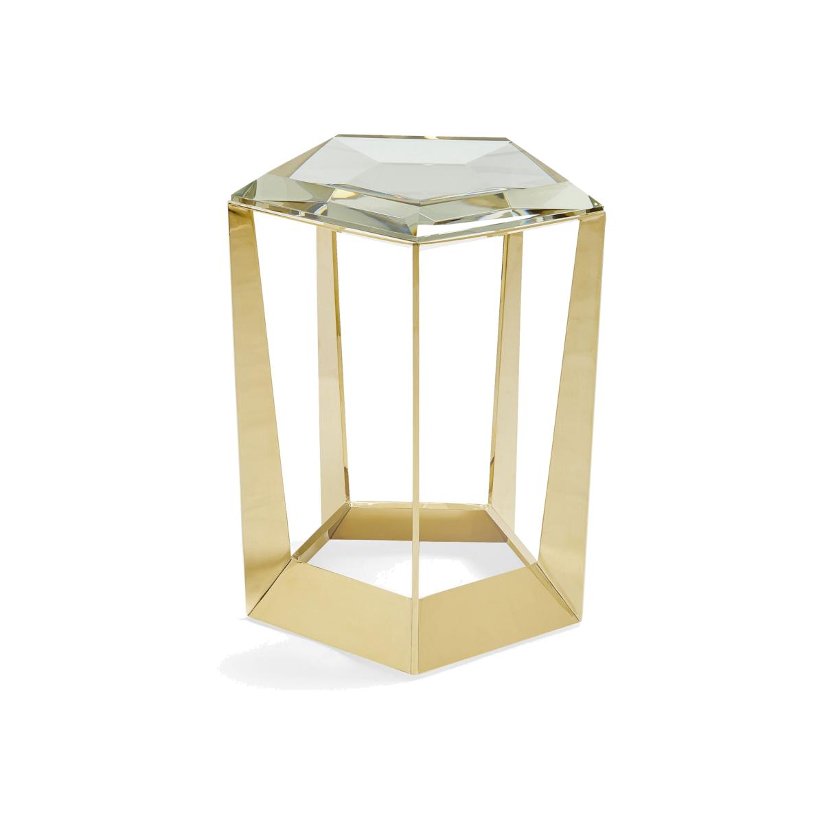 The Gem Side takes its inspiration from your finest diamond ring. The gleaming Majestic Gold legs emulate a ring's elegantly slender prongs. With its thick bevelled crystal top, cut in the shape of a gem, it is the perfect accessory to add sparkle in any room. Crystal top.