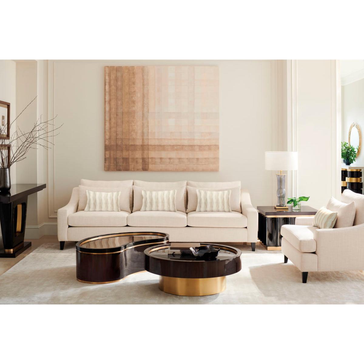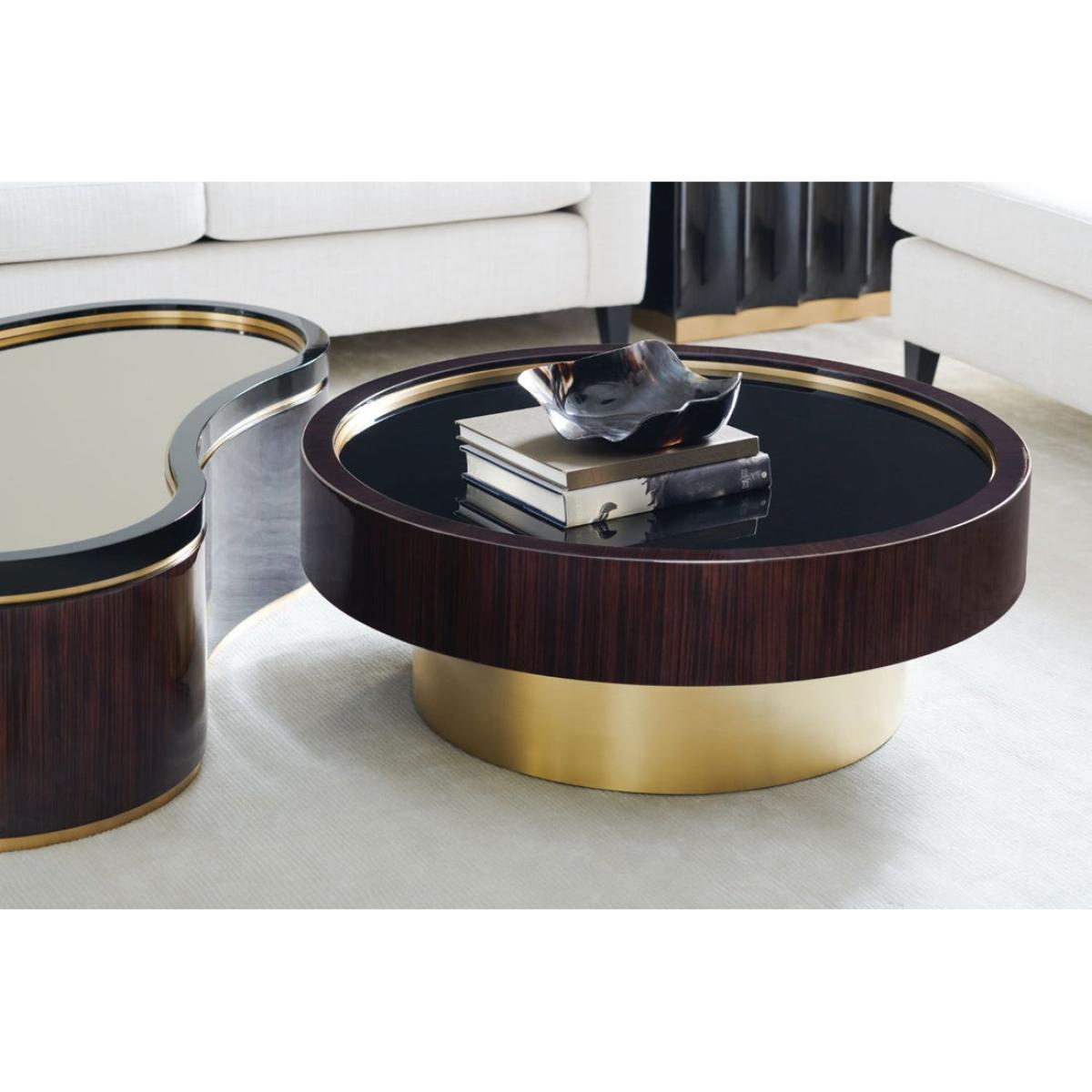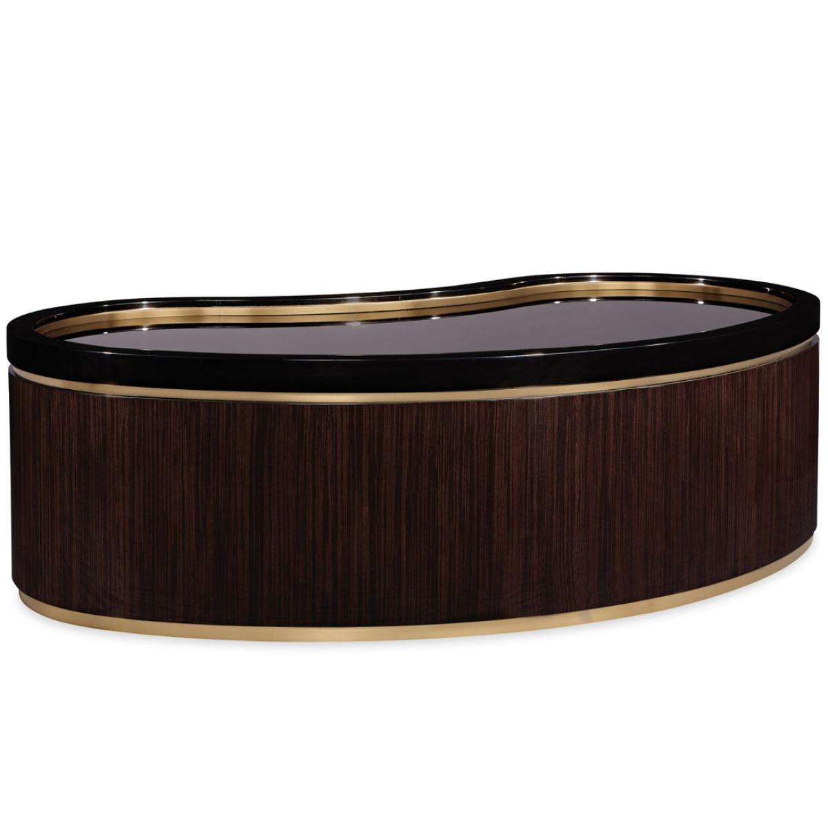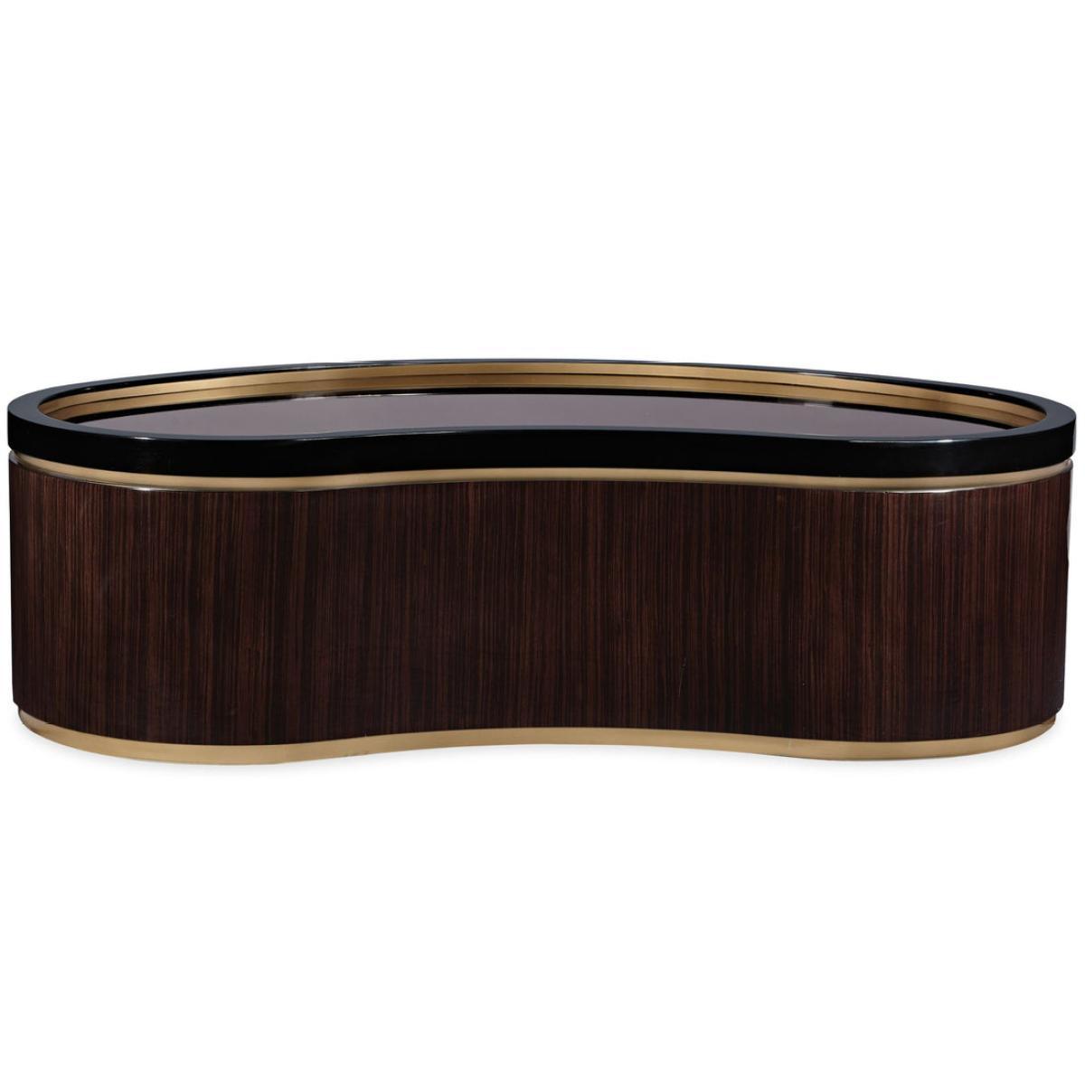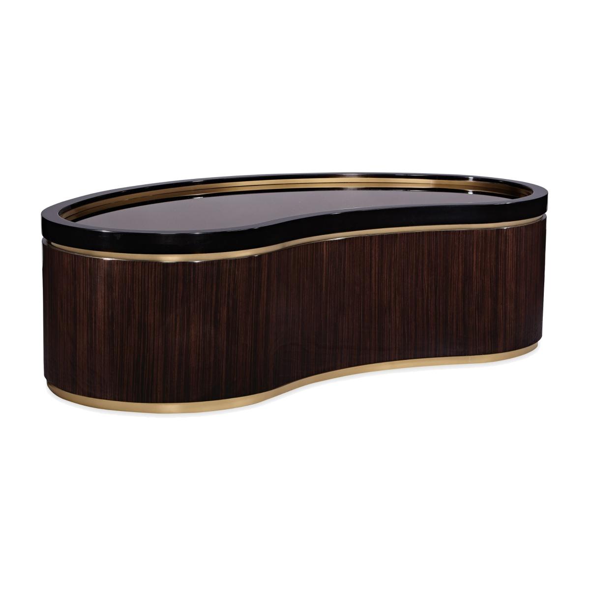 Looking for a distinctive cocktail table to add a warm yet modern focal point? Look no further, the Flow Cocktail table's curvy, oblong shape and modern mix of materials promises to create a striking centrepiece while adding interesting layers of texture. We particularly love the contrast between the softness of the Urban Brass, the linear woodgrain of the Ebony Macassar and the sleekness of Urban Black lacquer. Urban brass forms the table's base and creates a layer of interest between the wood veneer and black lacquer. The table's surface is rendered in a reflective bronze glass that is artfully rimmed in Urban Brass‚ creating a rich, lustrous look. For an interesting juxtaposition of shapes, consider pairing the oblong-shaped Flow Cocktail table with the circular-shaped Anonymous Cocktail table. Table is wrapped in Urban Ebony featuring Urban Brass band surrounding the top and bottom. Bronze glass top.