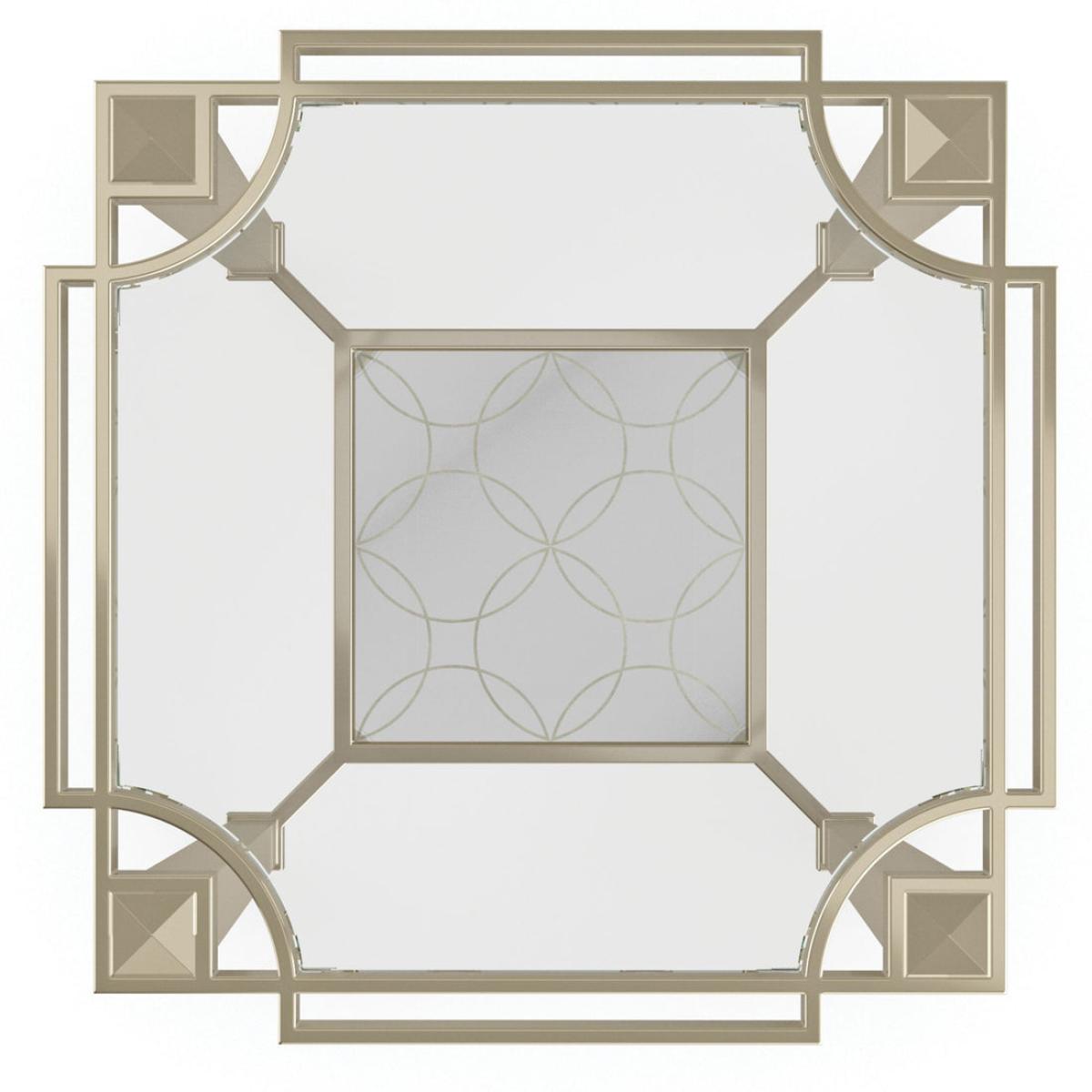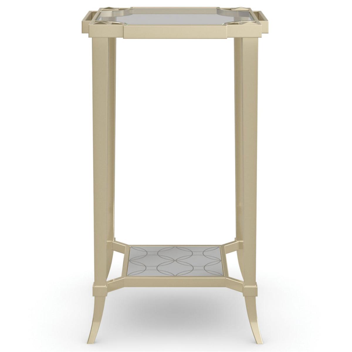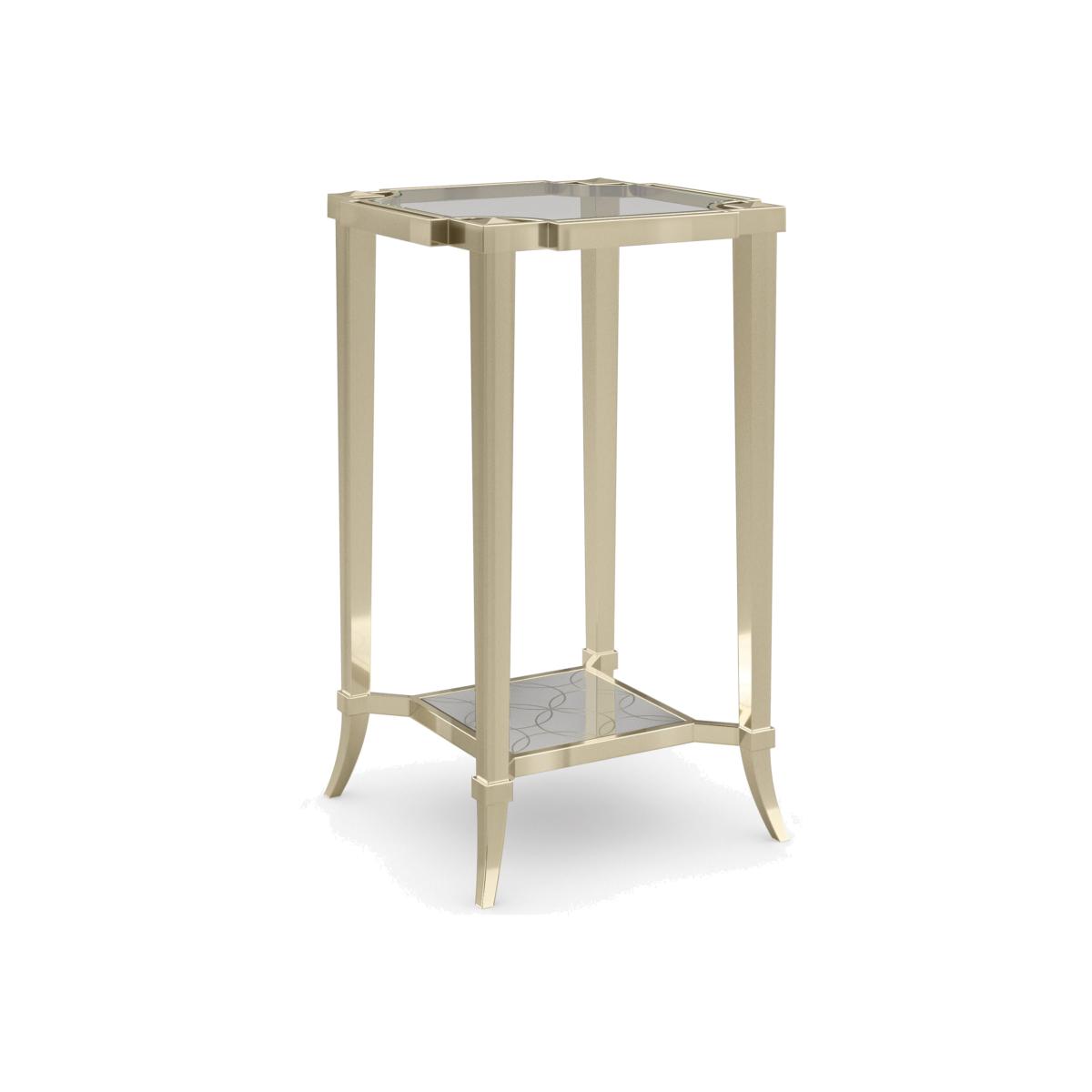 The perfect accent in any room, this shimmering side table mixes intricate details with luxe materials and a soft gold finish. Its tall cube shape is designed with square metal legs, perfectly positioned to offset arcing corners and uphold a bevelled glass top set within a slender, double frame. A small mirrored shelf with silver leaf etching on the back enhances its effortless elegance. Pairs well with our Prince Charming cocktail table and Third Time's A Charm end table. Stainless Steel frame in Whisper of Gold. Clear glass top. Mirrored shelf with etched back in Soft Silver Leaf.