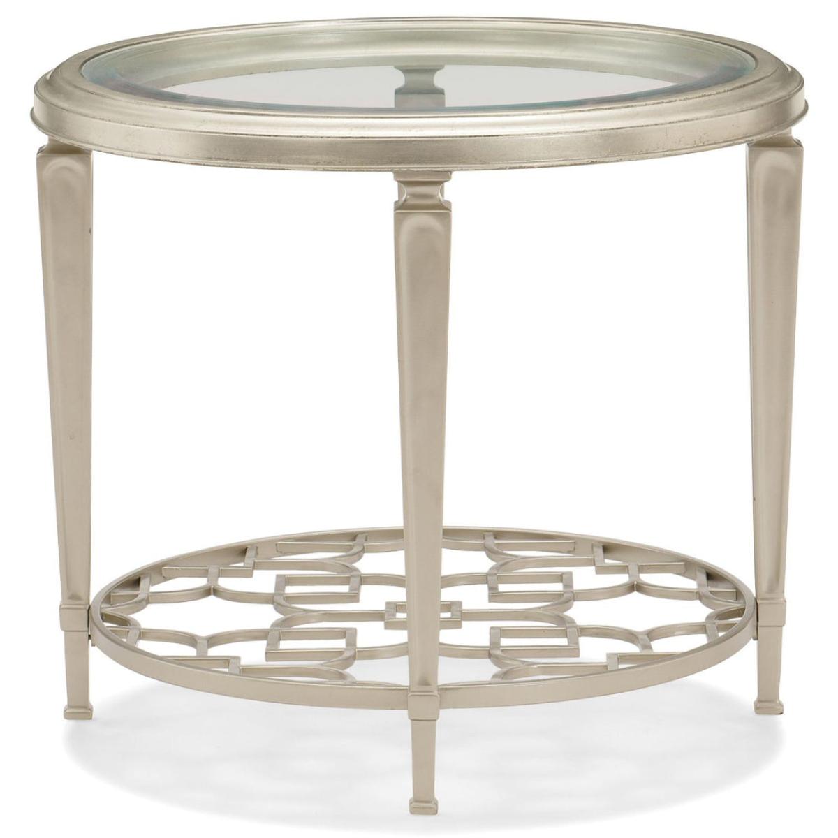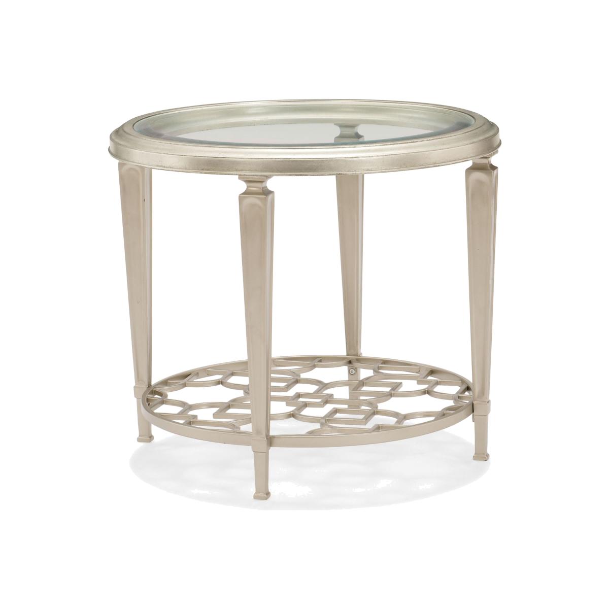 Perfectly proportioned and gracefully appointed, this round end table adds instant sophistication. A distinctive metal fretwork design in a pleasing open graphic pattern distinguishes its round lower shelf. Its round glass top features a 1 ¼” bevel and is creates just the spot for a favourite book or beverage. An open design feels light yet substantial, while the lovely combination of neutral Taupe Paint highlighted by Taupe Silver Leaf will complement any fabric or finish in the room. Metal fret shelf in Taupe Silver Leaf. Metal legs in Taupe Silver Leaf. Wood top frame finished in Taupe Paint. Clear tempered plain glass top with 1 1/4" bevel. Ships KD.