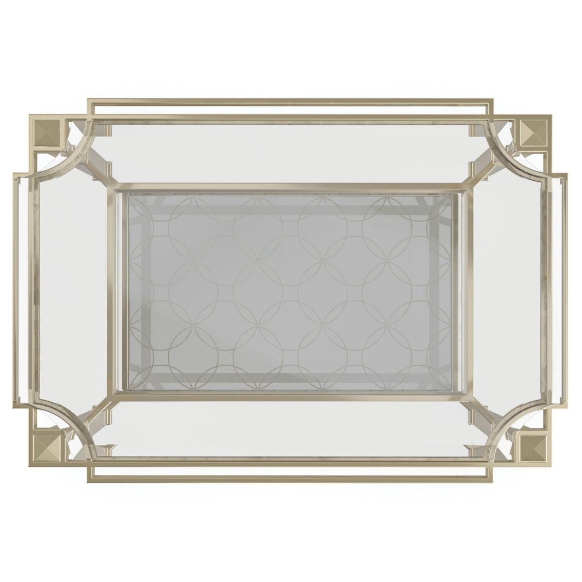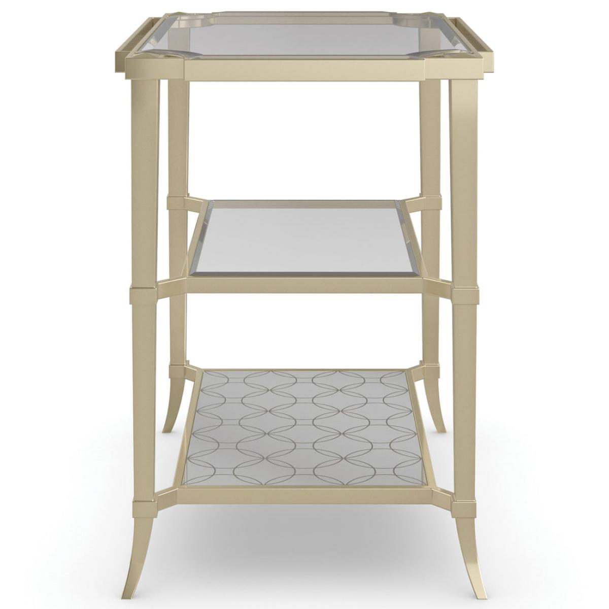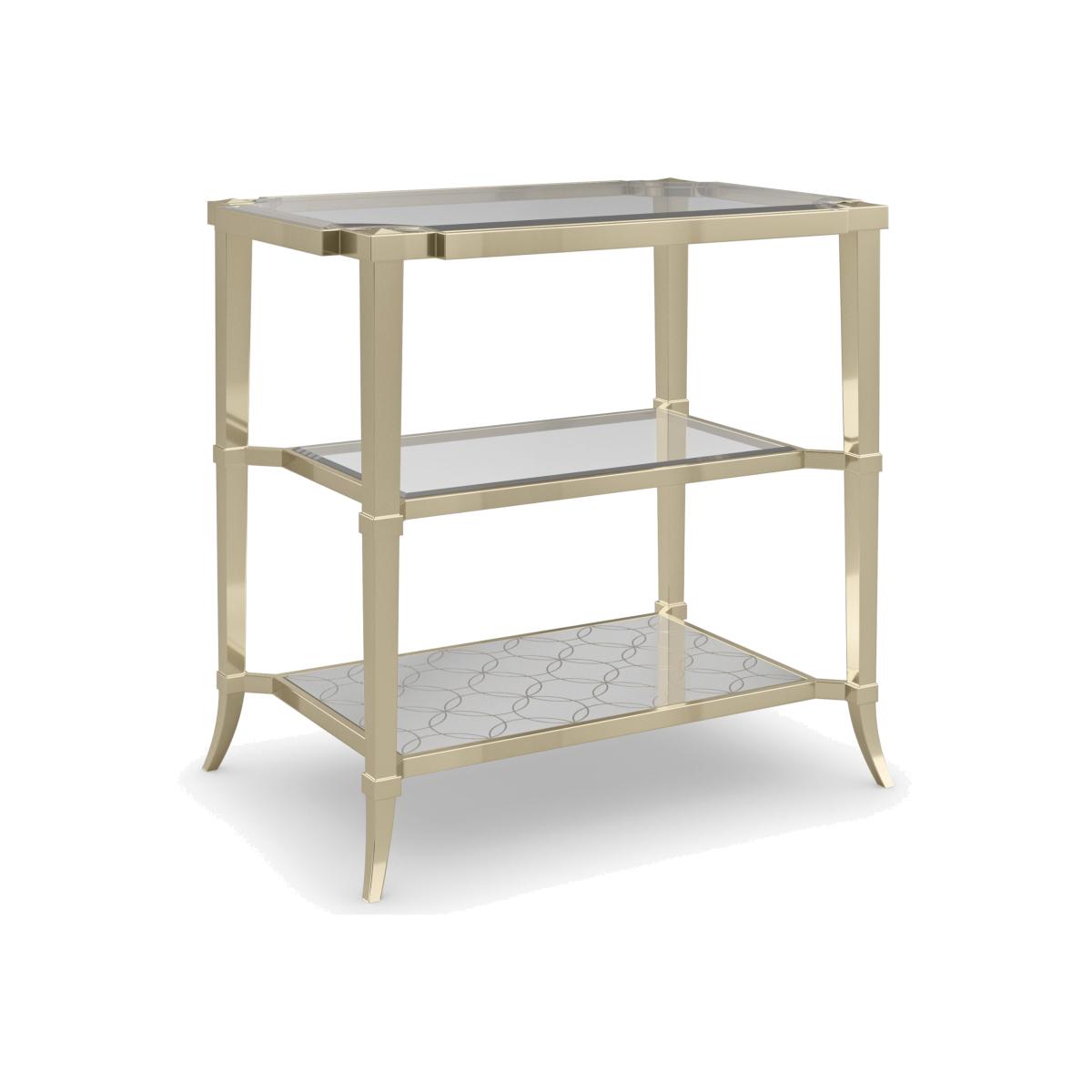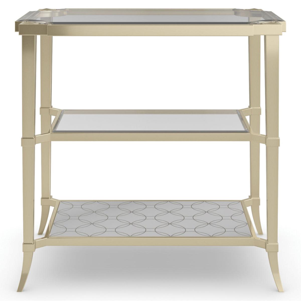 Artfully adorned in a Whisper of Gold, this tiered end table mixes intricate details with clean lines and luxe materials. Square metal legs are perfectly positioned to offset arcing corners and uphold a bevelled glass top set within a slender, double frame. Adding intrigue: a mirrored bottom shelf with a repeating geometric pattern etched in Soft Silver leaf. Light and effervescent with an air of elegance, it makes a captivating addition to seating areas, whether on its own or styled in pairs to accompany our Prince Charming cocktail table. Stainless Steel frame in Whisper of Gold. Glass top and middle shelf with 3/4" bevel. Bottom shelf is mirrored glass with etched back in Soft Silver Leaf.