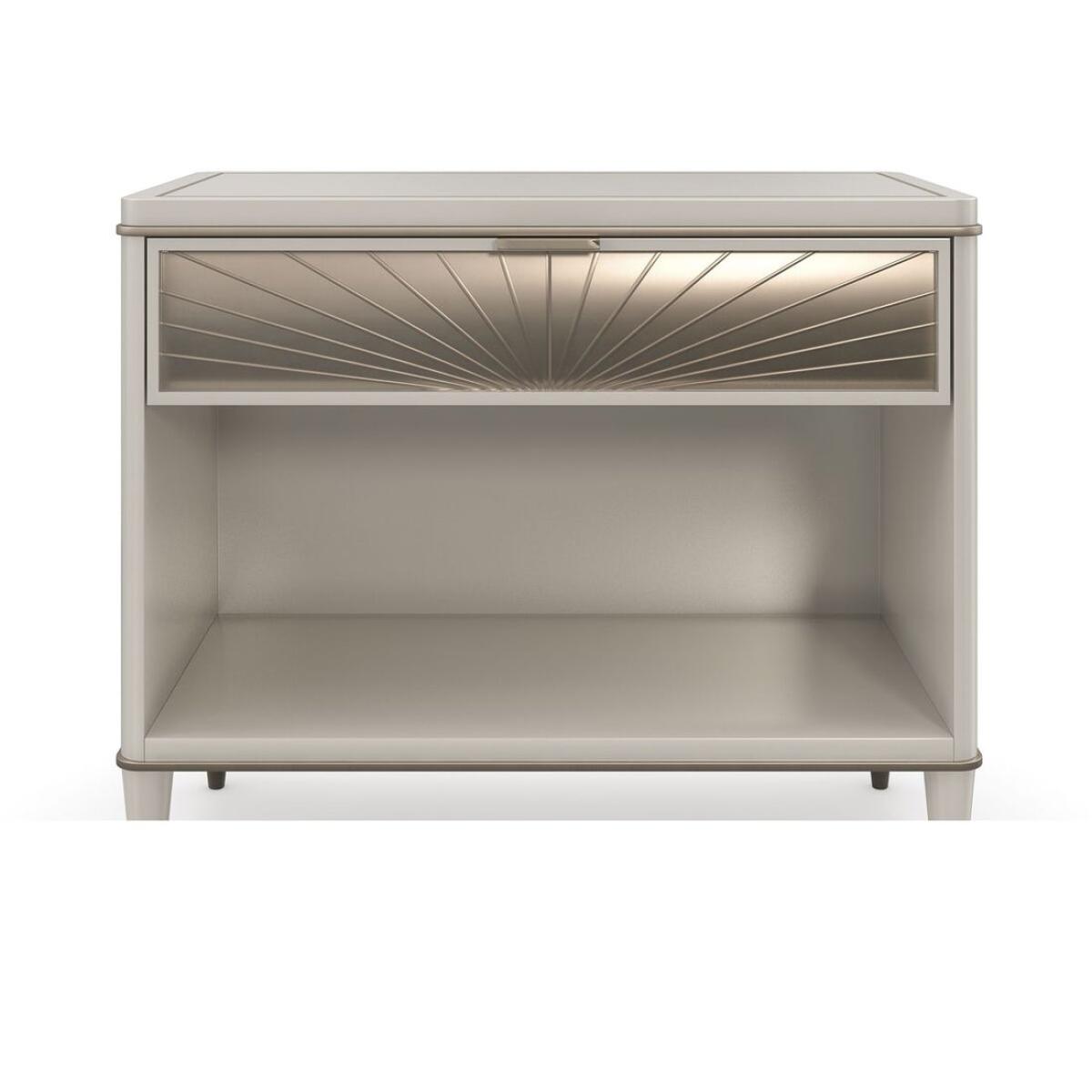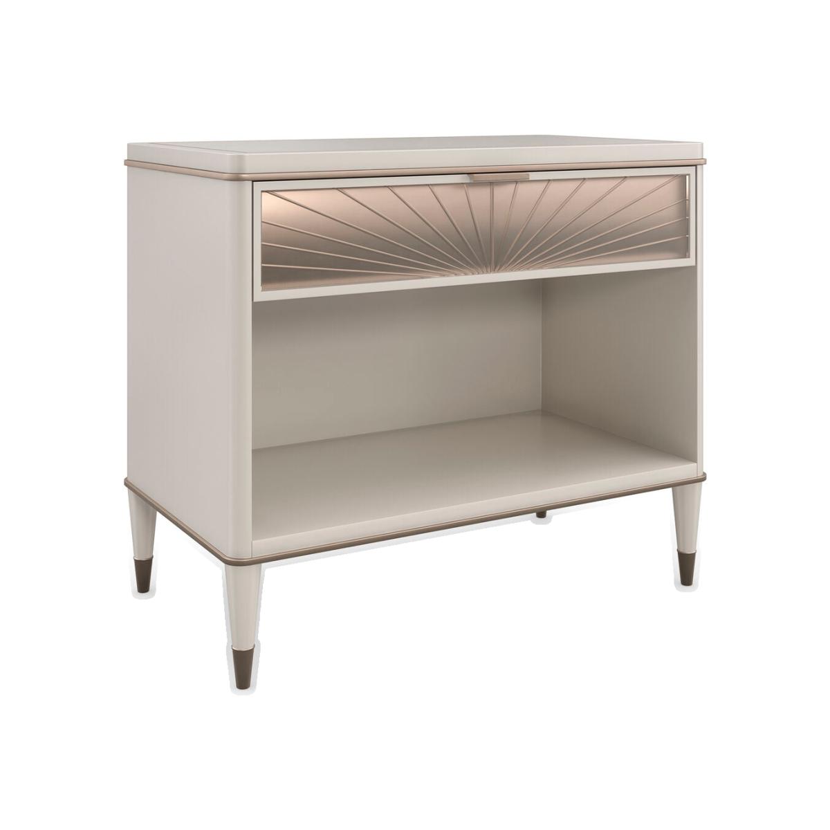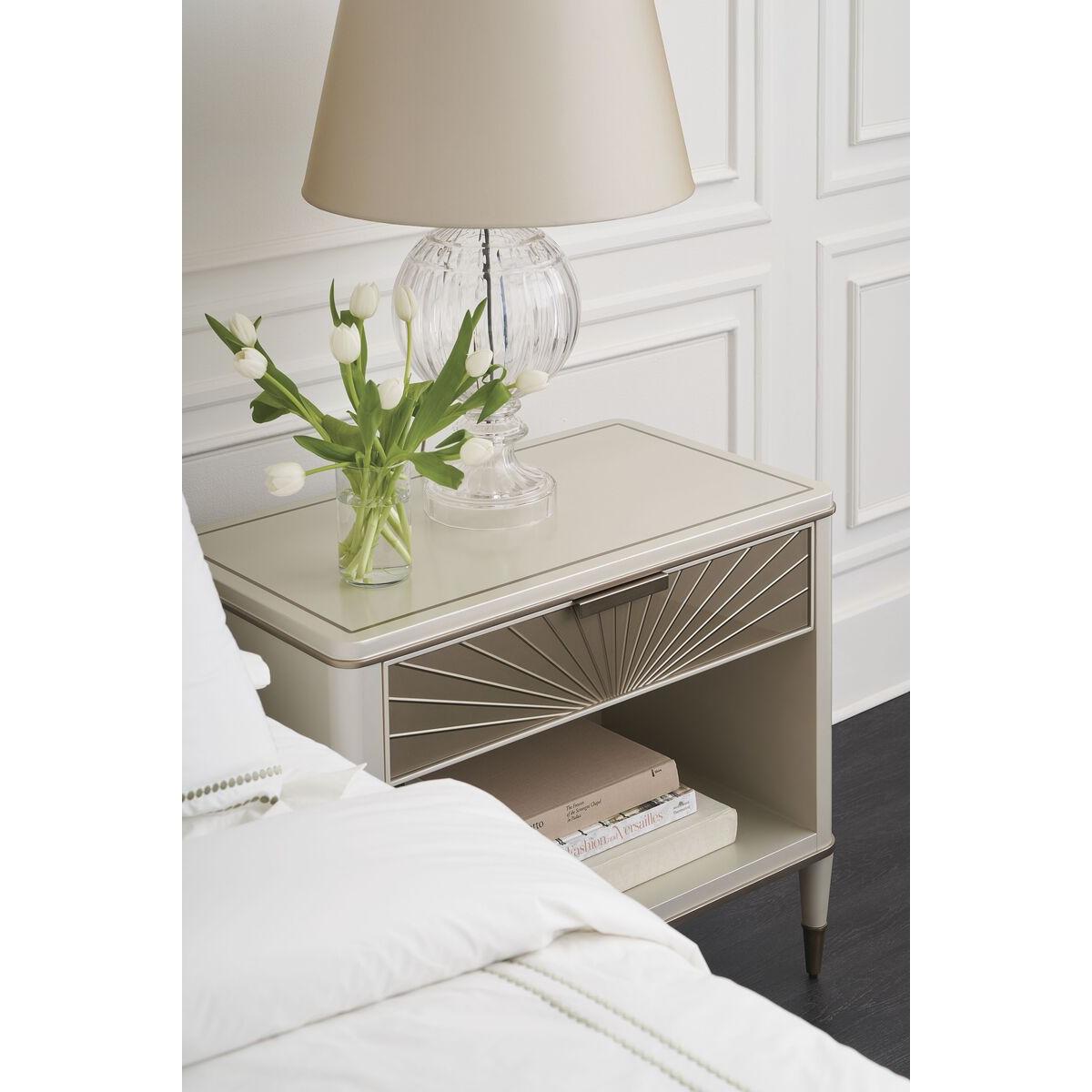 Caracole Valentina Large Bedside Table. Case in Matte Pearl. Top pinstripe and case molding in Golden Shimmer. One drawer with front in etched back painted glass in Golden Shimmer with V cut pattern and soft close side guides. Open storage area. Metal ferrules in plated Bronze Gold. Drawer Interior in UV Linen. An alluring bedside companion, the Valentina Large Nightstand introduces a shimmering mix of materials and finishes. Features a mirror-like drawer front created from v-groove cut, back-painted glass to create a striking radial pattern. Ample open storage allows for display, and neatly keeping nighttime reads and bedside essentials. A silkscreened pinstripe detail frames the top andadds a touch of luxe, complemented by tapered legs dressed in Bronze Gold metal ferrules.
