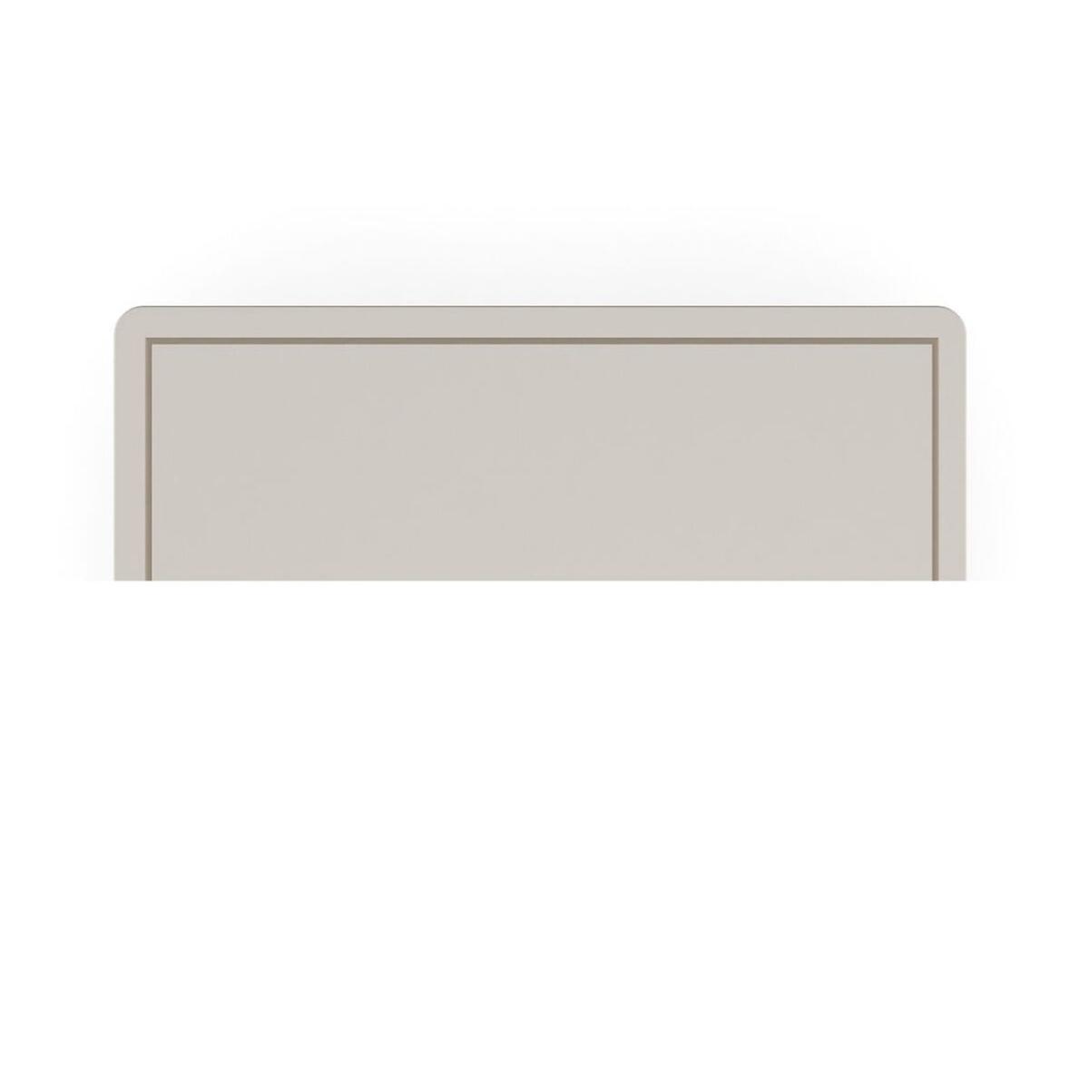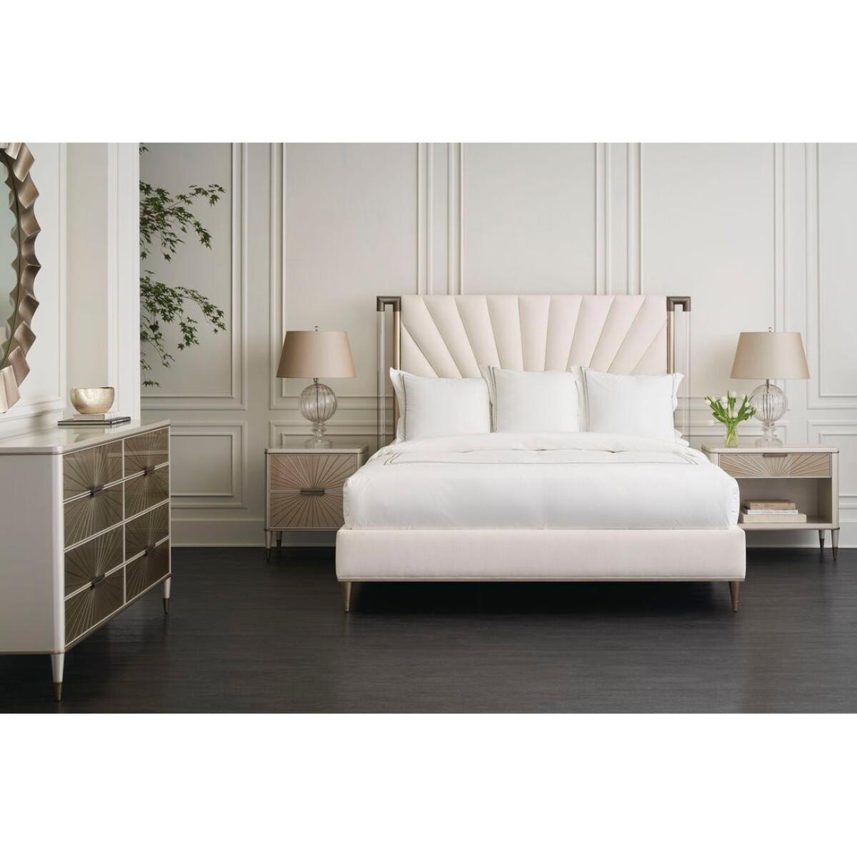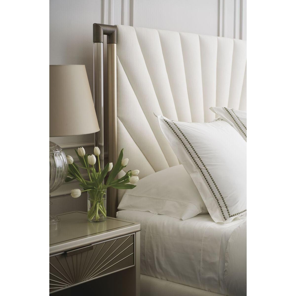 Caracole Valentina Large Bedside Table. Case in Matte Pearl. Top pinstripe and case molding in Golden Shimmer. One drawer with front in etched back painted glass in Golden Shimmer with V cut pattern and soft close side guides. Open storage area. Metal ferrules in plated Bronze Gold. Drawer Interior in UV Linen. An alluring bedside companion, the Valentina Large Nightstand introduces a shimmering mix of materials and finishes. Features a mirror-like drawer front created from v-groove cut, back-painted glass to create a striking radial pattern. Ample open storage allows for display, and neatly keeping nighttime reads and bedside essentials. A silkscreened pinstripe detail frames the top andadds a touch of luxe, complemented by tapered legs dressed in Bronze Gold metal ferrules.