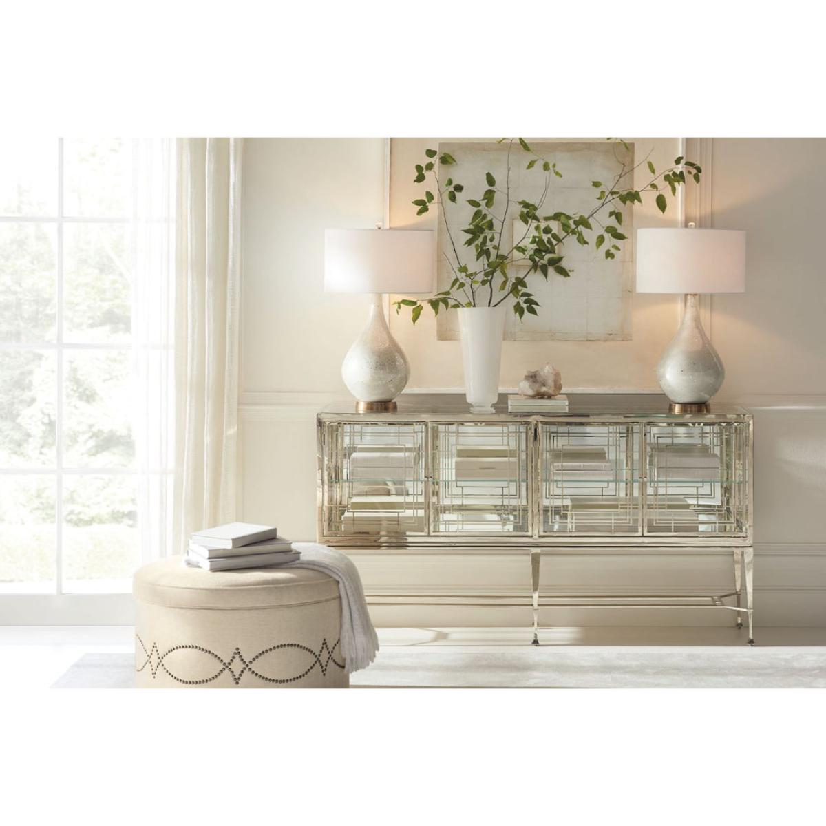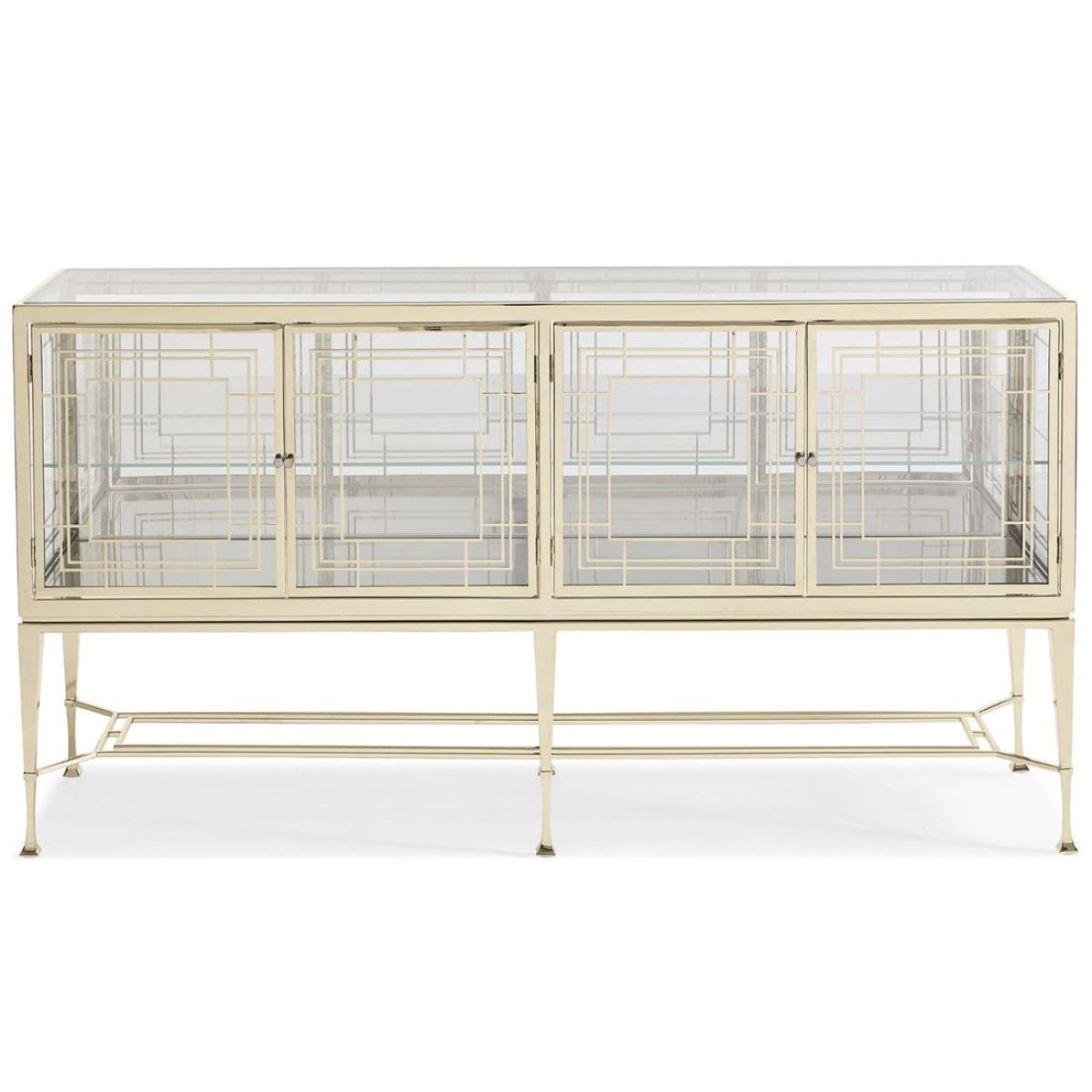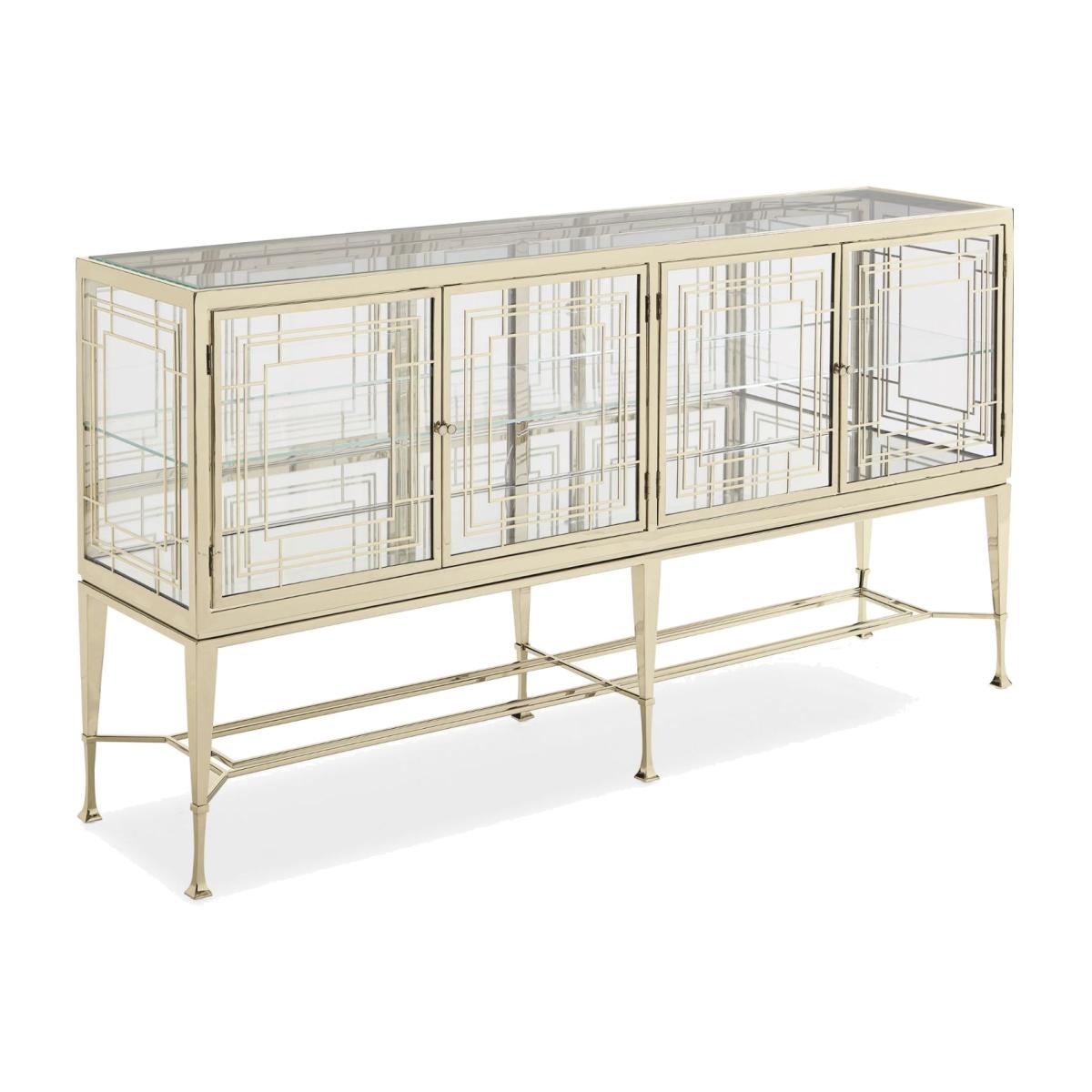 Experience the allure of our glass console, reminiscent of the brilliance found in gold jewellery glistening under radiant light. This exquisite piece captures beauty from every perspective, meticulously crafted with transparent glass panels that create an entrancing visual effect. Its design boasts a glass top, glass end panels, and a glass shelf, all harmoniously complemented by four clear glass doors. These elements converge to create a symphony of luminosity, reflecting elegantly off mirrored back and bottom panels. Elevating its elegance, a Whisper of Gold finish gracefully envelops the plated metal frame, bestowing a captivating contrast to its radiant surface. This console serves as an impeccable canvas for showcasing your cherished treasures and curated collections, adding a touch of opulence to your space. The plated metal frame, adorned in the luxurious Whisper of Gold hue, forms a sturdy foundation. The clear glass top and end panels infuse an airy ambience, while the quartet of clear glass doors, centred around a glass shelf, offers both functional storage and an aesthetic focal point. The mirrored back and bottom panels magnify the console's allure, creating a mesmerizing play of reflections. Arriving at your doorstep fully assembled, this masterpiece is ready to transform your space with its ethereal charm. Discover the perfect union of craftsmanship and style, where the whisper of gold meets the radiance of glass. Dimensions: H: 91.44 x W: 172.72 x D: 40.64cm Materials: Glass, Metal