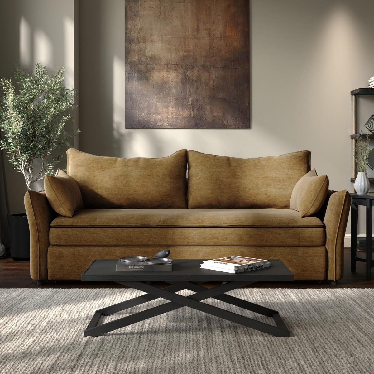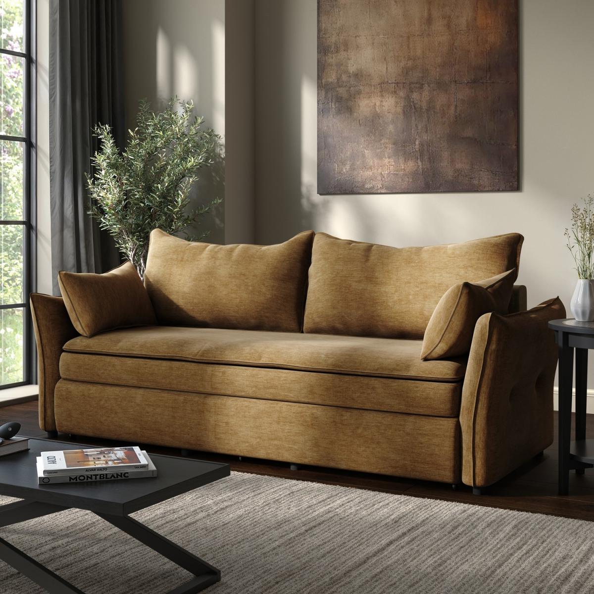 Sleek, minimalist design that suits modern and timeless interiors. Quickly transform from a cosy sofa to a spacious bed, ideal for overnight guests and small spaces. The memory foam top ensures restful sleep while the foam and fibre filling provides cosy seating. Ideal for small apartments, guest rooms, or multipurpose spaces, offering seating and sleeping in one smart design. A spacious compartment under the seats keeps bedding and essentials neatly stored. Be prepared for overnight guests with the Gaia Futon Sofa Bed in a stunning golden brown chenille fabric. Easily transform the 3-seater sofa into a bed with the simple and smooth pull-out mechanism. This fold-out sofa bed is complete with a built-in memory foam mattress top, creating a comfortable double bed for your guests, ensuring a great nights sleep. This sofa bed features a textured chenille fabric with a caramel brown hue that instantly adds warmth to your space. The durable chenille fabric is perfect for busy households, requiring little maintenance to keep it looking its best. Under the seats you'll find a hidden storage compartment, perfect for storing your bedding and any other essentials. For additional comfort and support, this sofa bed is foam and fiber-filled and comes with 2 matching throw cushions.