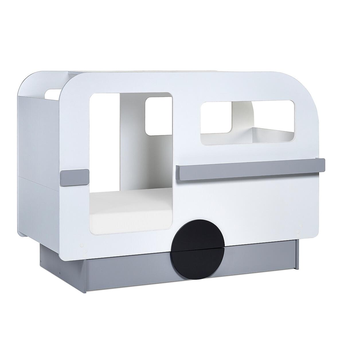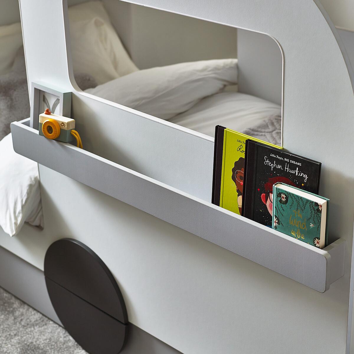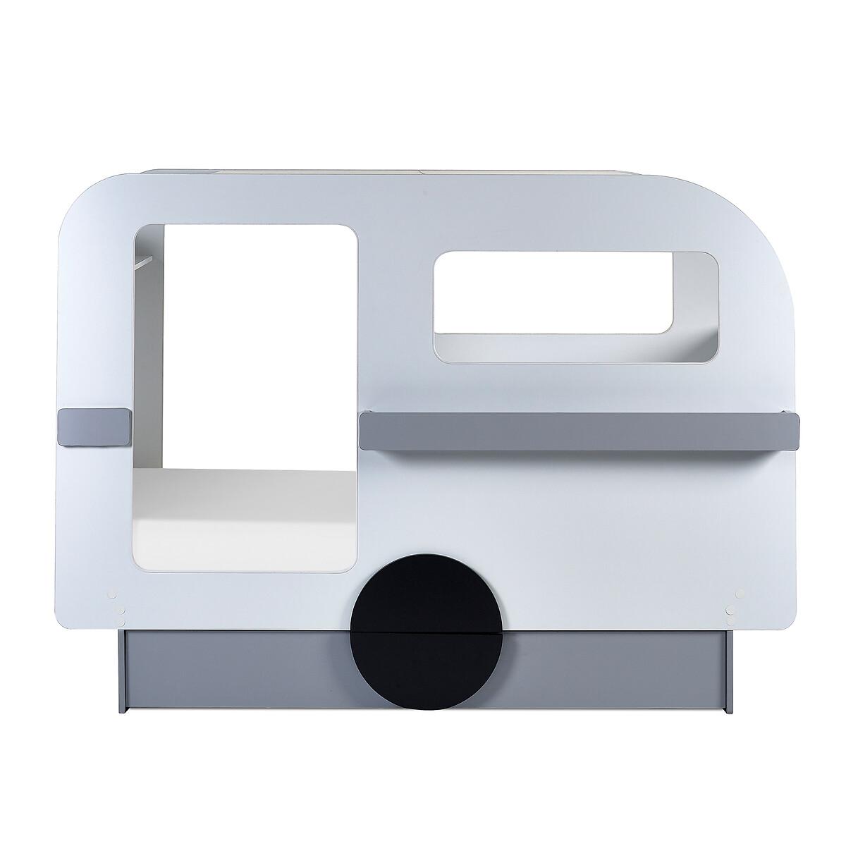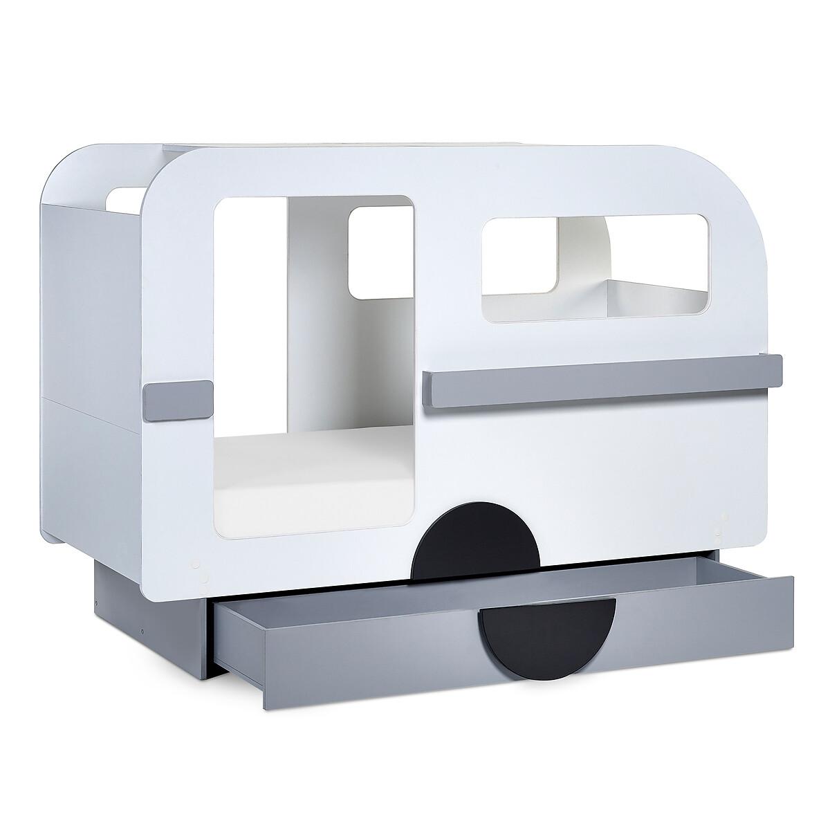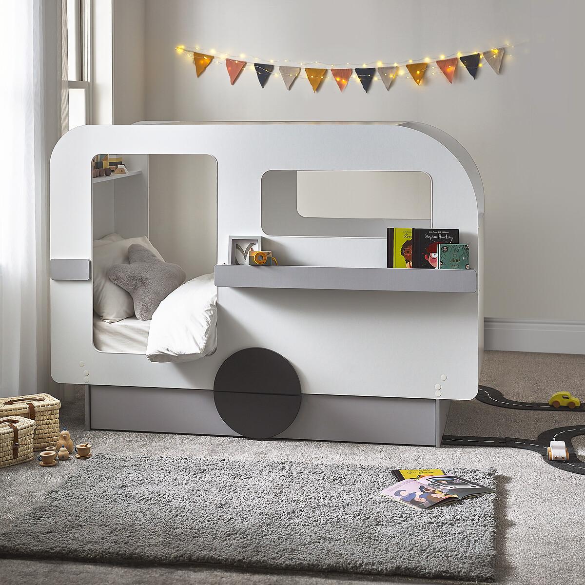Let your little one's imagination go wild with our whimsical Caravan Bed. With its unique shape, the Caravan bed offers shelves both on the inside and front, perfect for storing books and toys, as well as a pull-out drawer at the bottom of the bed for stashing away all the essentials, including blankets, clothes and toys! Finished in lacquered white, grey, and black round-shaped wheels. Product details• Features ample storage with 2 shelves inside and at the front, along with a single pull-out drawer at the bottom, keeping books, toys, and essentials neatly organised.• Ideal for playtime and bedtime, this bed provides a versatile space for adventure and relaxation.• Assembly required• Fixings included• Compatible with Standard UK single 90 x 190 cm mattresses• Mattress not included• Maximum mattress height - 23cm. Composition - 80% Wrapped Particleboard, 10% LVL,10% Metal Overall Dimensions 196.4 cm x 95 cm x 142.4 cm , Weight - 101.6 KGBottom of side rail to floor - 22 Trundle Drawer Dimensions - H 22 x W163 x D 44. Internal trundle depth - 43.5cm Trundle base to underside of bed - 26.5cm. Shelf dimensions• External Shelf box - H 9.5(front panel) x W 110 x D 7cm• Inner Shelf - W 93.5 x D 19 cm Package Dimensions:Parcel 1 Packaged Dimensions - 97.4 cm x 66.2 cm x 14.9 cm, Weight 32 KGParcel 2 Packaged Dimensions - 204.3 cm x 133.1 cm x 6.7 cm, Weight 43 KGParcel 3 Packaged Dimensions - 165.9 cm x 54 cm x 12.7 cm, Weight 38 KGPlease note: this product cannot be be delivered to all Offshore Islands Northern Ireland or Republic of Ireland. This product will be dispatched by one of our trusted suppliers. You’ll be contacted by their selected courier about your delivery.