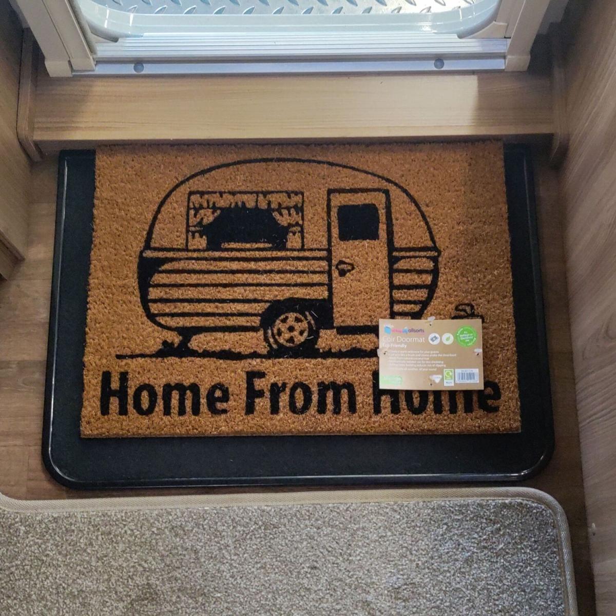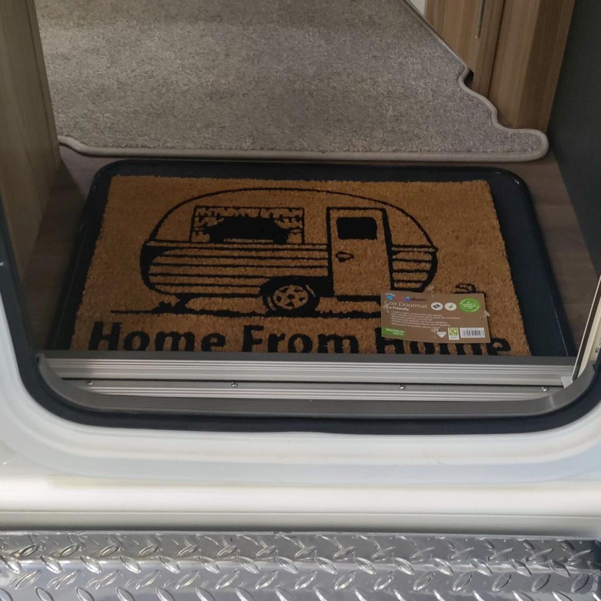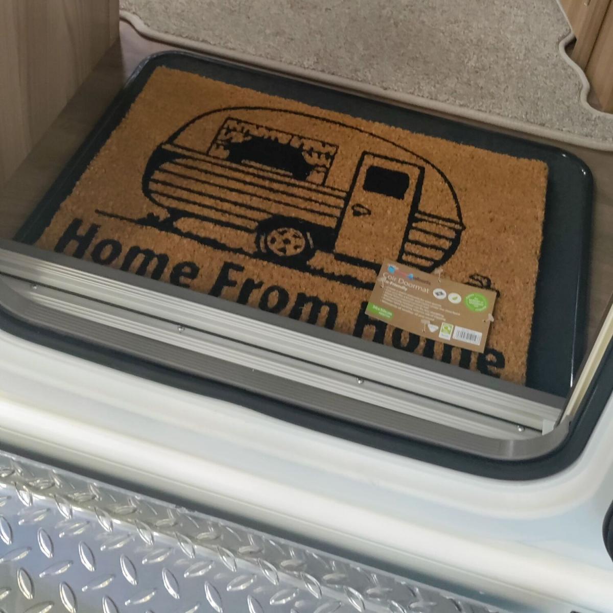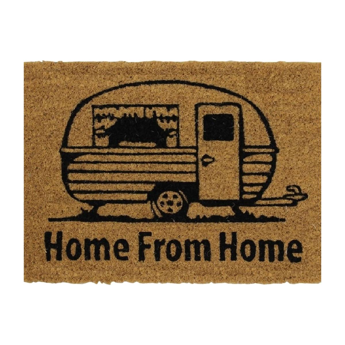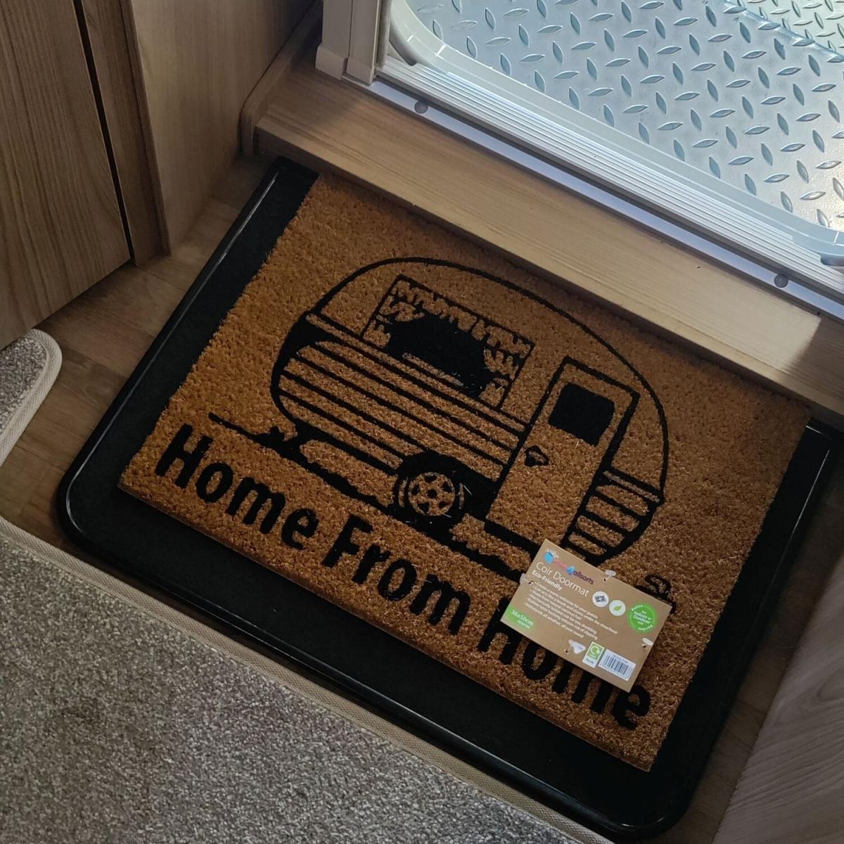 Our 50cm x 36cm novelty latex coir mat is a premium quality mat with a latex backing and the coir has been mechanically twisted for less shedding. It is made from 100% natural coir (renewable resources coir fibre, jute and natural latex). The rubber latex backing reduces the risk of slipping and helps the mat stay flat to the floor with no curling. The coconut hair (natural coir) offers fantastic scraping qualities for muddy shoes and boots and absorbs water well, meaning your floors stay cleaner for longer. The doormat is suitable for all weathers, all year round and mainly used outdoors but can be used indoors too. The caravan design and Home From Home message welcomes all of your guests, it can be used inside the caravan door, on the floor outside of the door, in the awning or porch, anywhere you want!The doormat is 100% biodegradable so when you've finished with the mat and its sent to landfill the natural coir will disintegrate with one year and the latex compound will disintegrate within five years, subject to soil conditions. The packaging and kimbles are recyclable too. Helping you to be eco friendly towards our planet!