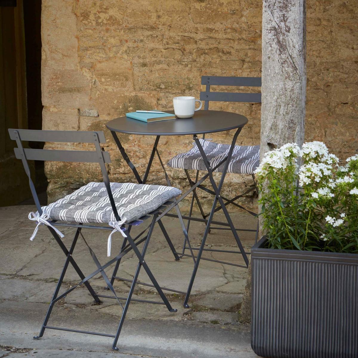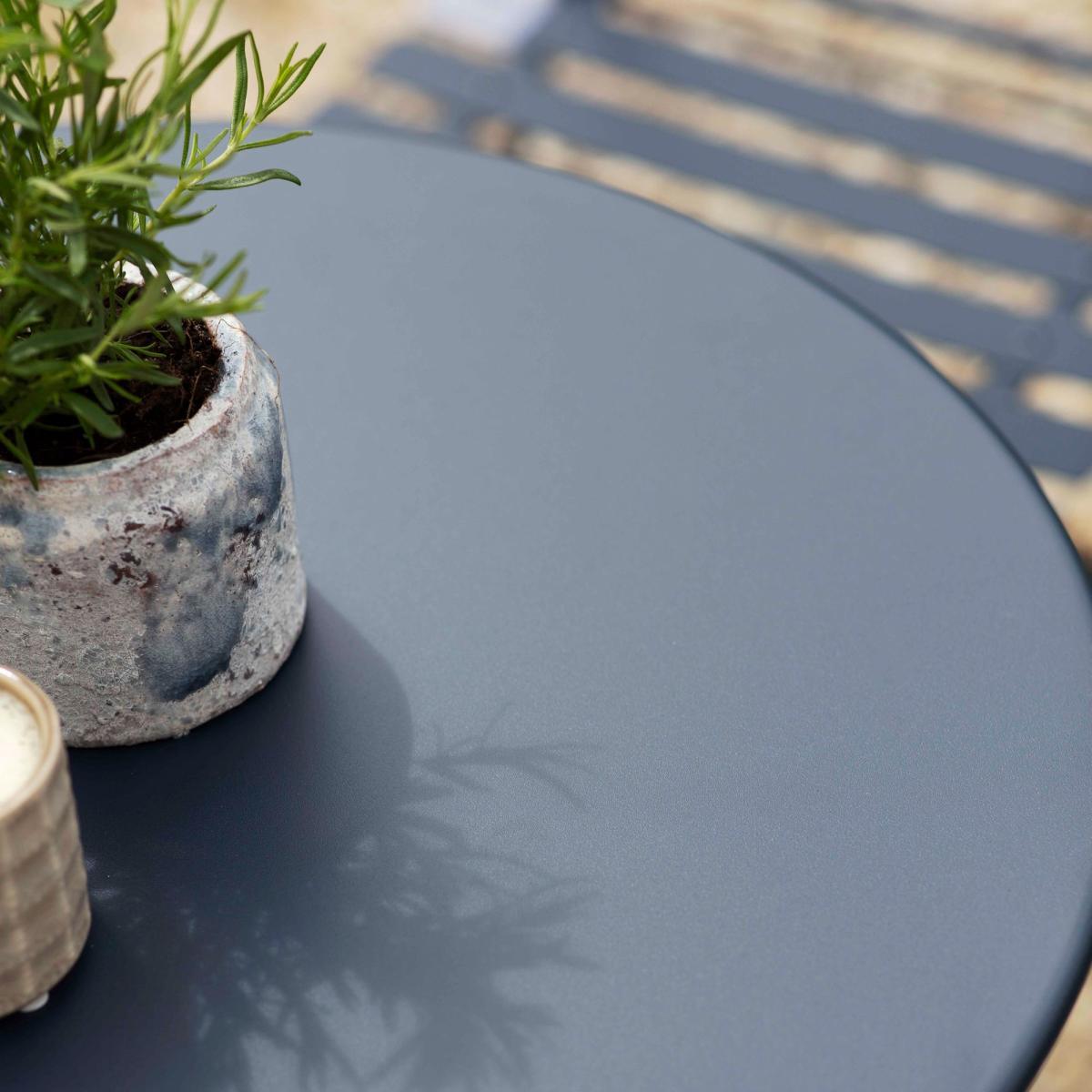 A Parisian-inspired table and matching chairs crafted from powder-coated steel in carbon grey, the perfect outdoor set for your courtyard or balcony.
