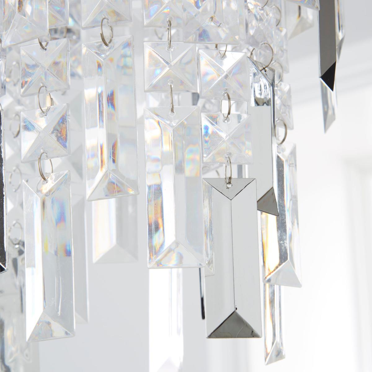 Create a stunning look in your home with the Caressa pendant. Crafted with chrome detailing and cascading clear acrylic and chrome prisms, this unique pendant will add a glamorous feel to any space.
