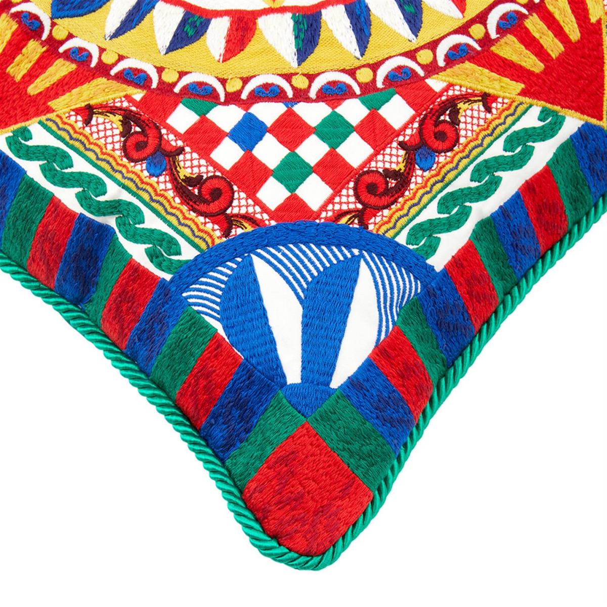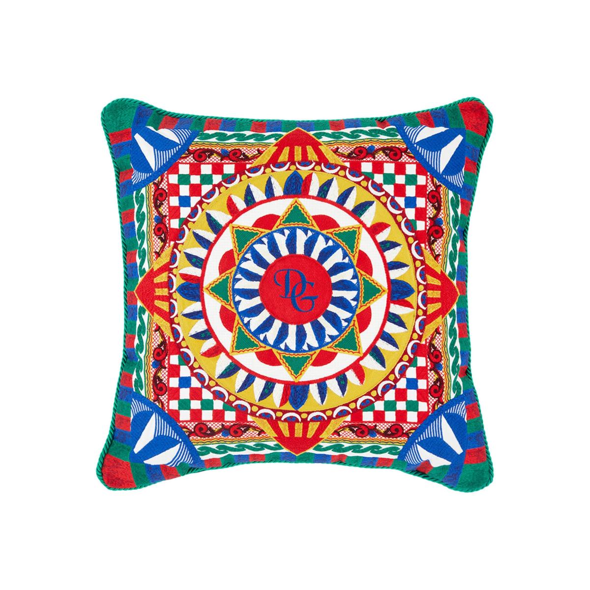 This exquisite embroidered cushion from Dolce & Gabbana Casa harnesses the folklore-inspired Carretto Siciliano beautifully. Generously padded, this gorgeous cushion has a torchon trim and features intricate, vivid embroidery on the front while the back is draped in solid-coloured plush cotton velvet.
