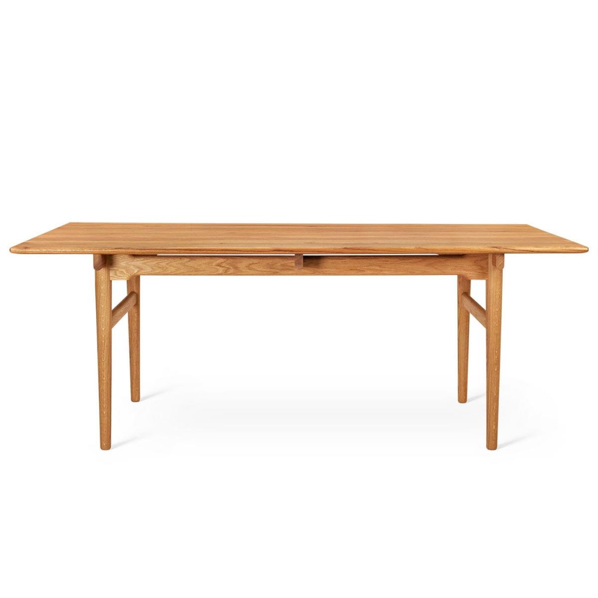Designed in 1962 by Hans J. Wegner, the CH327 dining table is a masterclass in Danish craftsmanship and design. Made from solid wood, it features softened edges, tapering legs, and a floating tabletop effect created by raised side rails. Available in two lengths, 190cm or 243cm, the CH327 comfortably seats 6–8. Add 40cm extension leaves to each end and it can accommodate 10–12, making it perfect for larger gatherings.