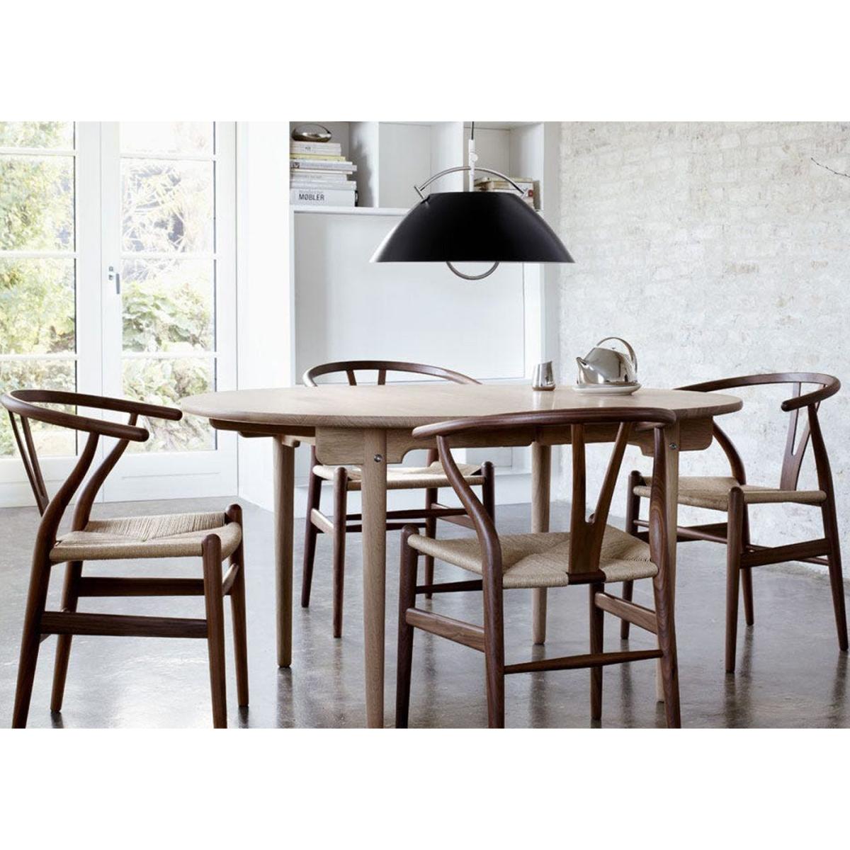 I’m a fan of the CH337 extending table for its clean, simple silhouette and the warmth of oiled oak - it feels equally at home in a Scandi-inspired kitchen or a pared-back urban loft. The extension leaves are neatly stored underneath, so you can shift from a cosy breakfast for four to a dinner party in seconds. To style it, keep the surface uncluttered: a slim linen runner or a trio of low-profile ceramics lets the grain shine through. Mix in chairs with contrasting textures - think leather-trimmed seats or woven rattan - and layer in a single sculptural jug or a small potted plant rather than a large centrepiece.