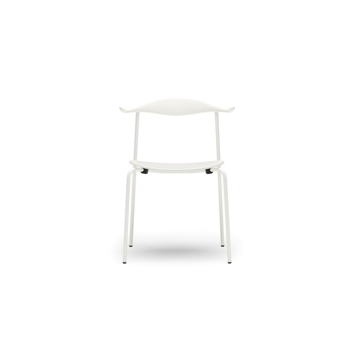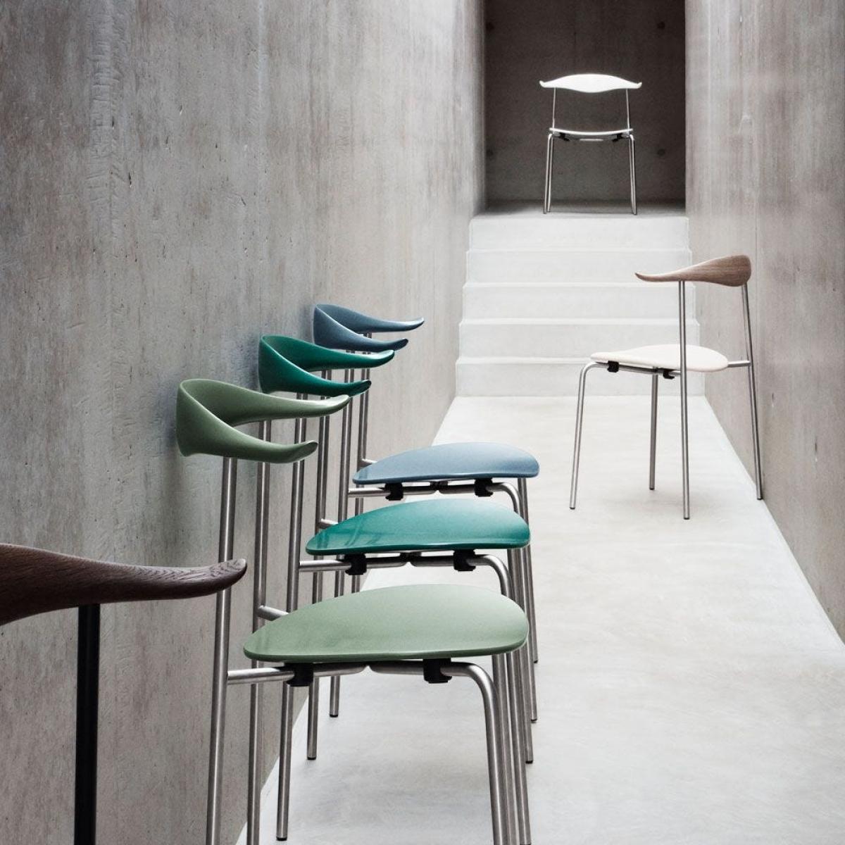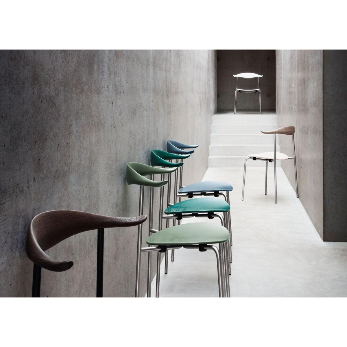 Although known for his work in wood throughout his career, Hans J. Wegner often explored the limits and potential of other materials. The CH88. T Dining Chair is one such example. The design was initially developed by Wegner as a prototype with coloured legs. It was displayed at the international Helsingborg Exhibition in Sweden in 1955. Decades later, Carl Hansen & Søn put the chair into production in celebration of the 2014 centennial of Wegner's birth. The CH88. T is versatile, elegant and functional. Its convenient stackable design seamlessly joins wood and industrial steel, showcasing Wegner's skill in lending softness to minimalist forms. The steel frame supports an oval wooden seat and steam-bent backrest with elegantly upturned ends forming a natural resting place for the forearms.
