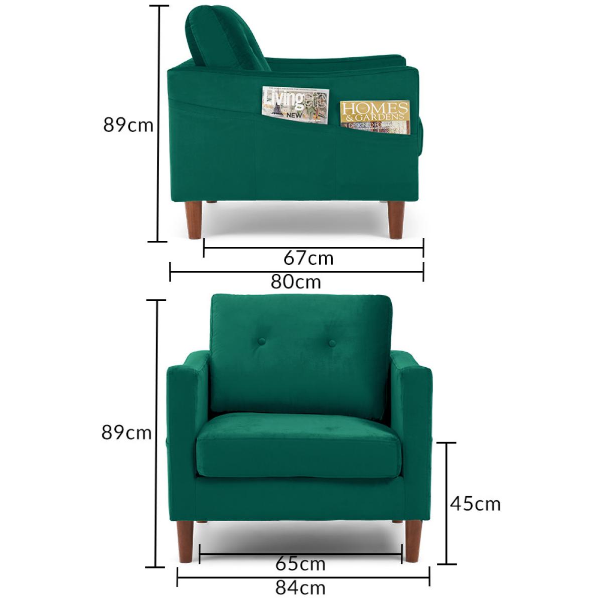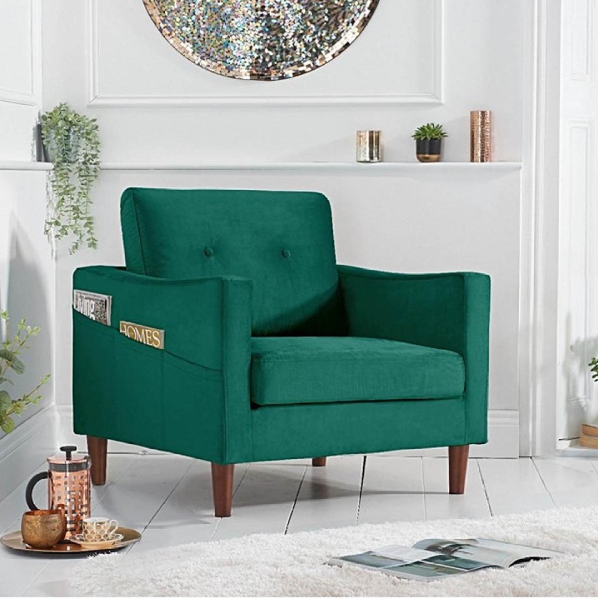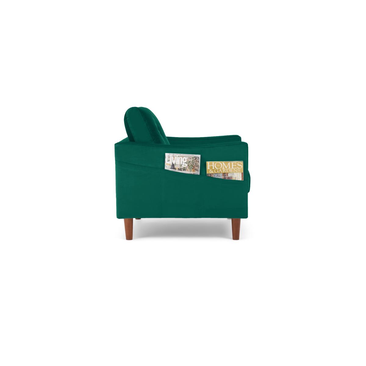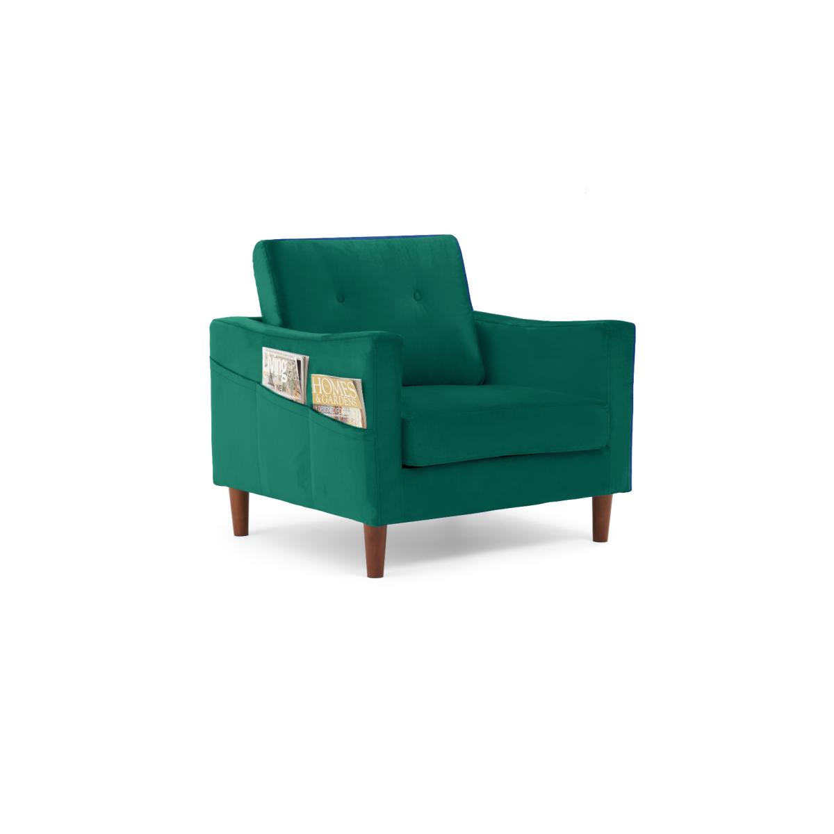 The Carla Green Velvet Armchair is an elegant addition to your home. With striking green velvet, this statement armchair features a modern design with a buttoned back cushion and is complete with a comfortable seat cushion and tapered feet. Modern armchair with statement green velvet. Modern, minimalist shape. Comfortable cushions. Buttoned design on the back cushion. Handy magazine pocket on outer armrest Complete with tapered dark wood legs