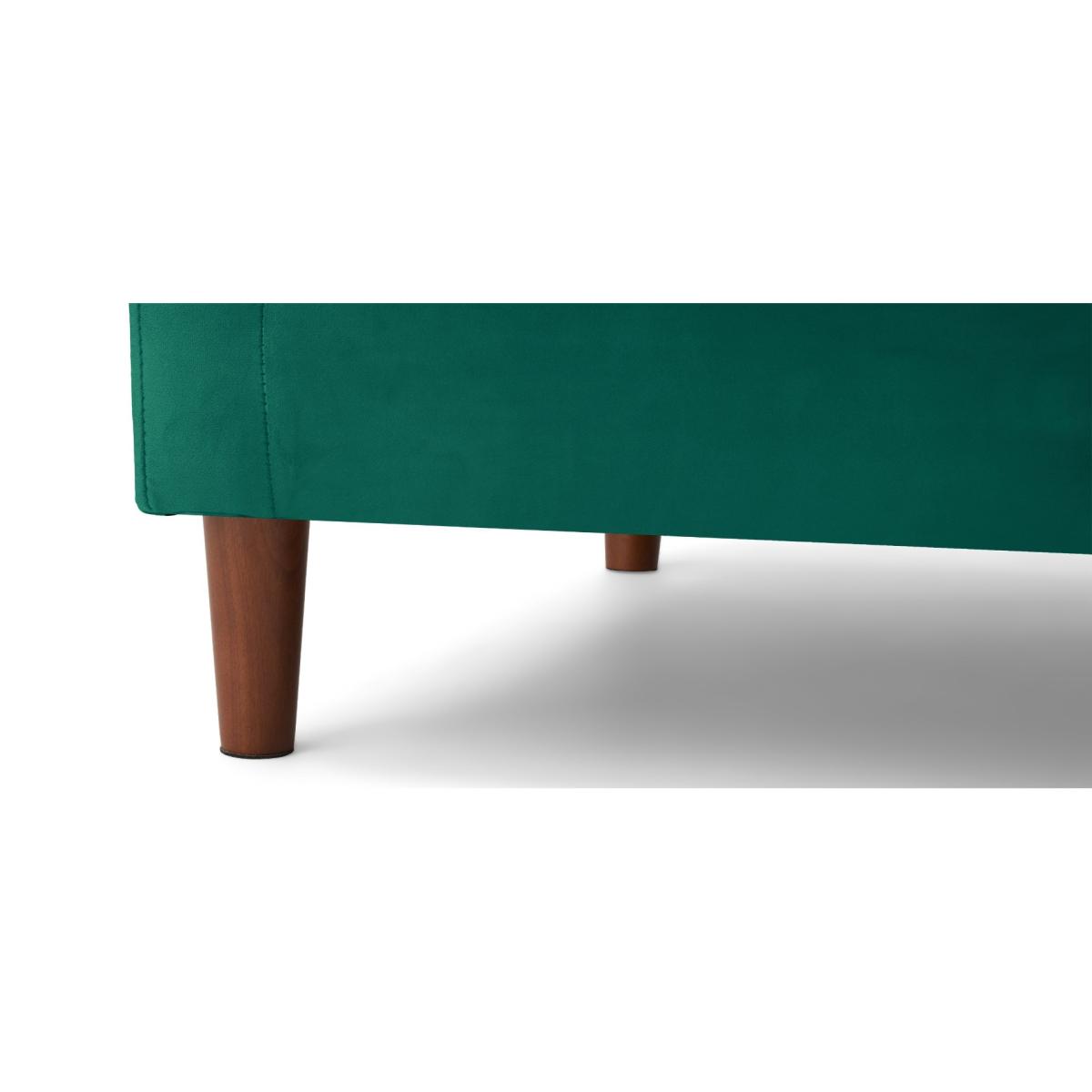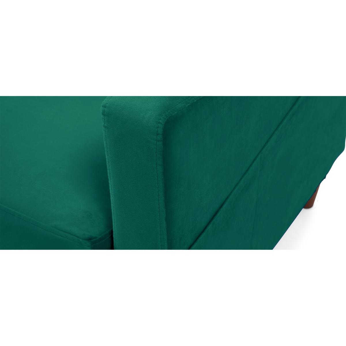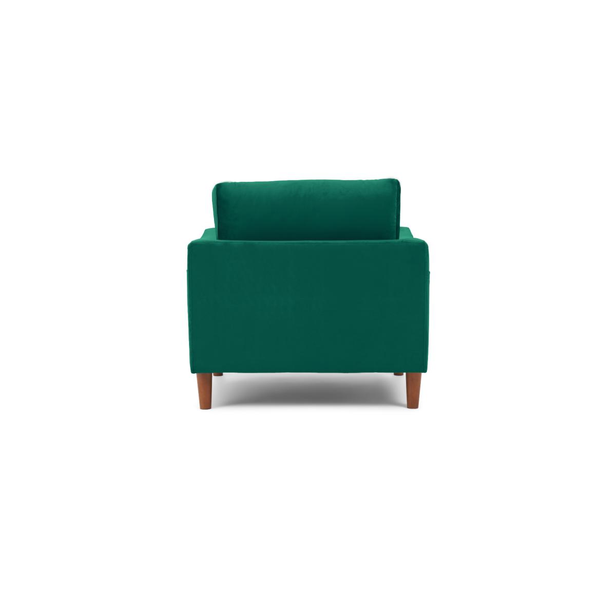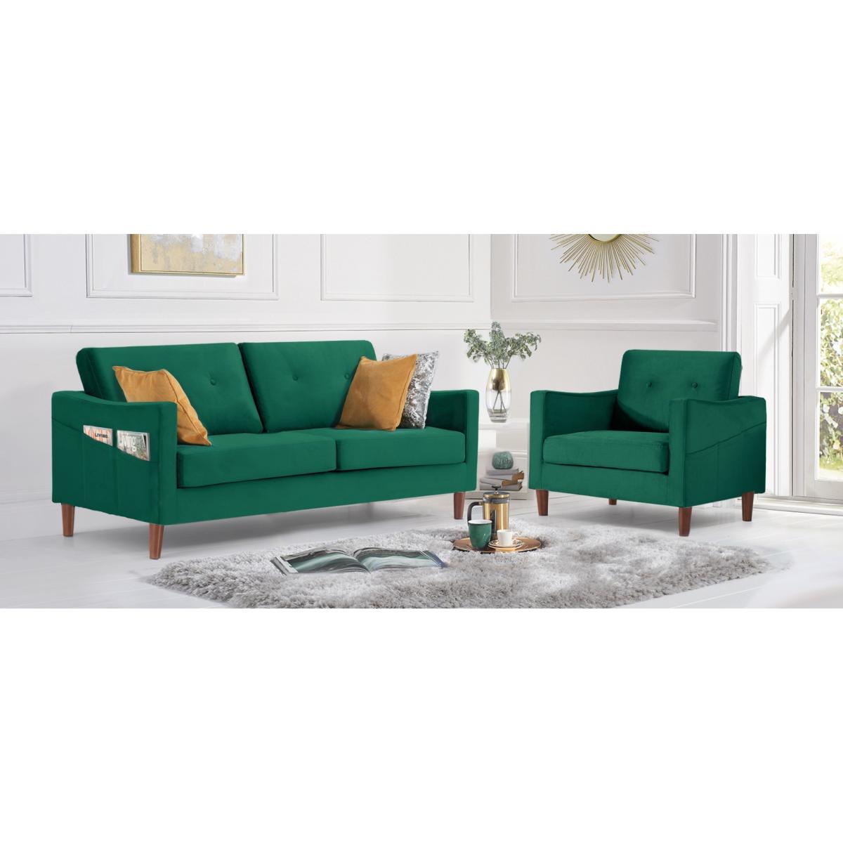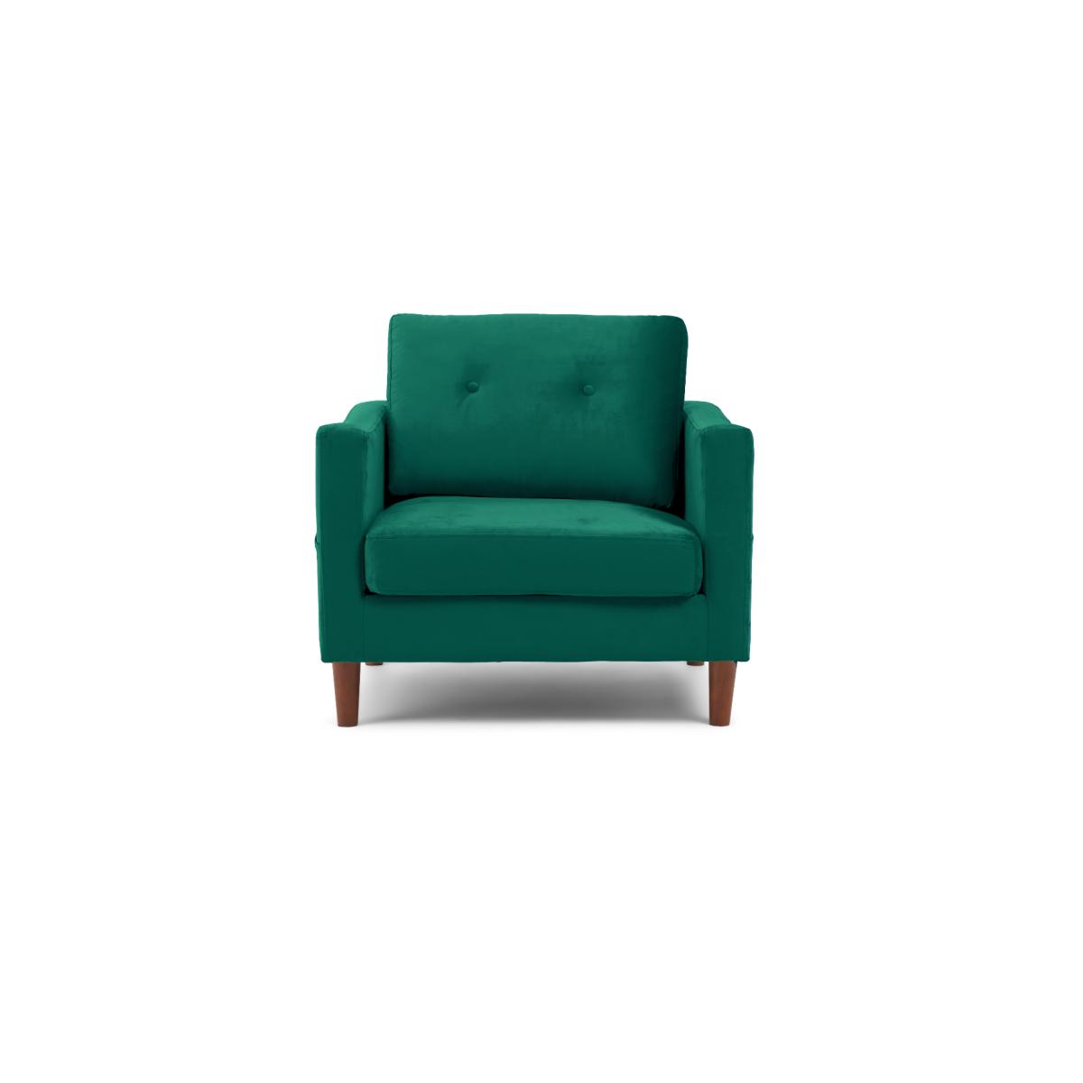 The Carla Green Velvet Armchair is an elegant addition to your home. With striking green velvet, this statement armchair features a modern design with a buttoned back cushion and is complete with a comfortable seat cushion and tapered feet. Modern armchair with statement green velvet. Modern, minimalist shape. Comfortable cushions. Buttoned design on the back cushion. Handy magazine pocket on outer armrest Complete with tapered dark wood legs
