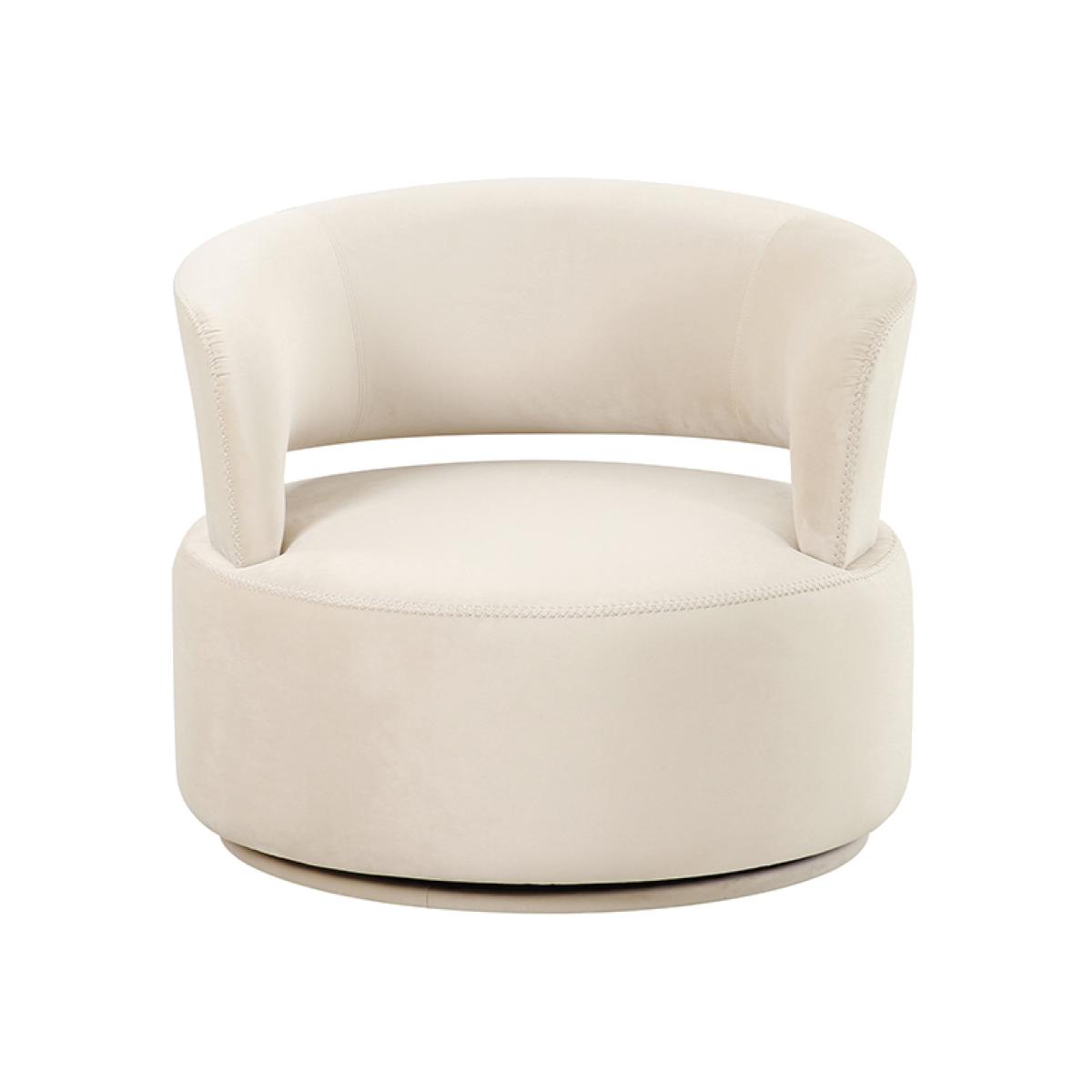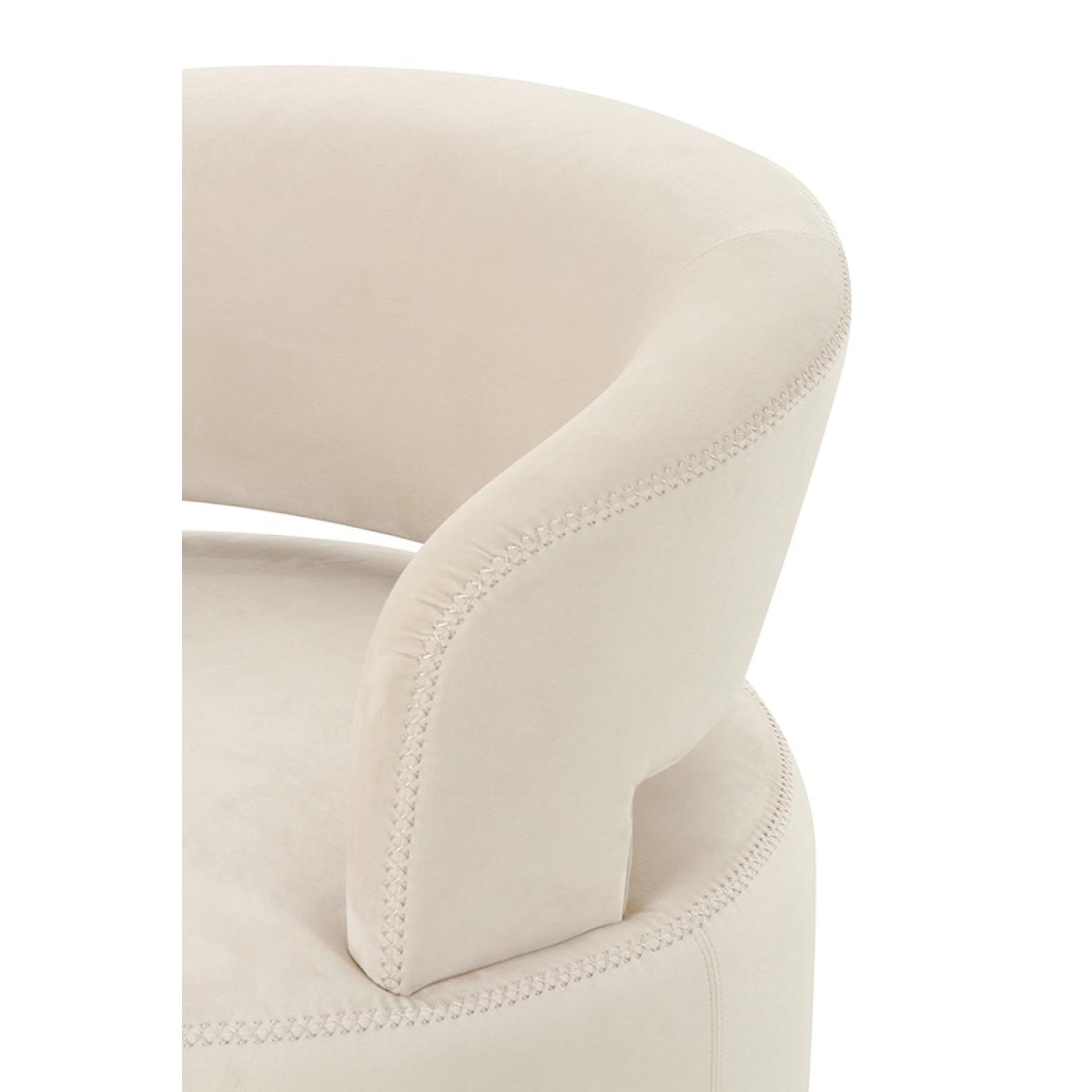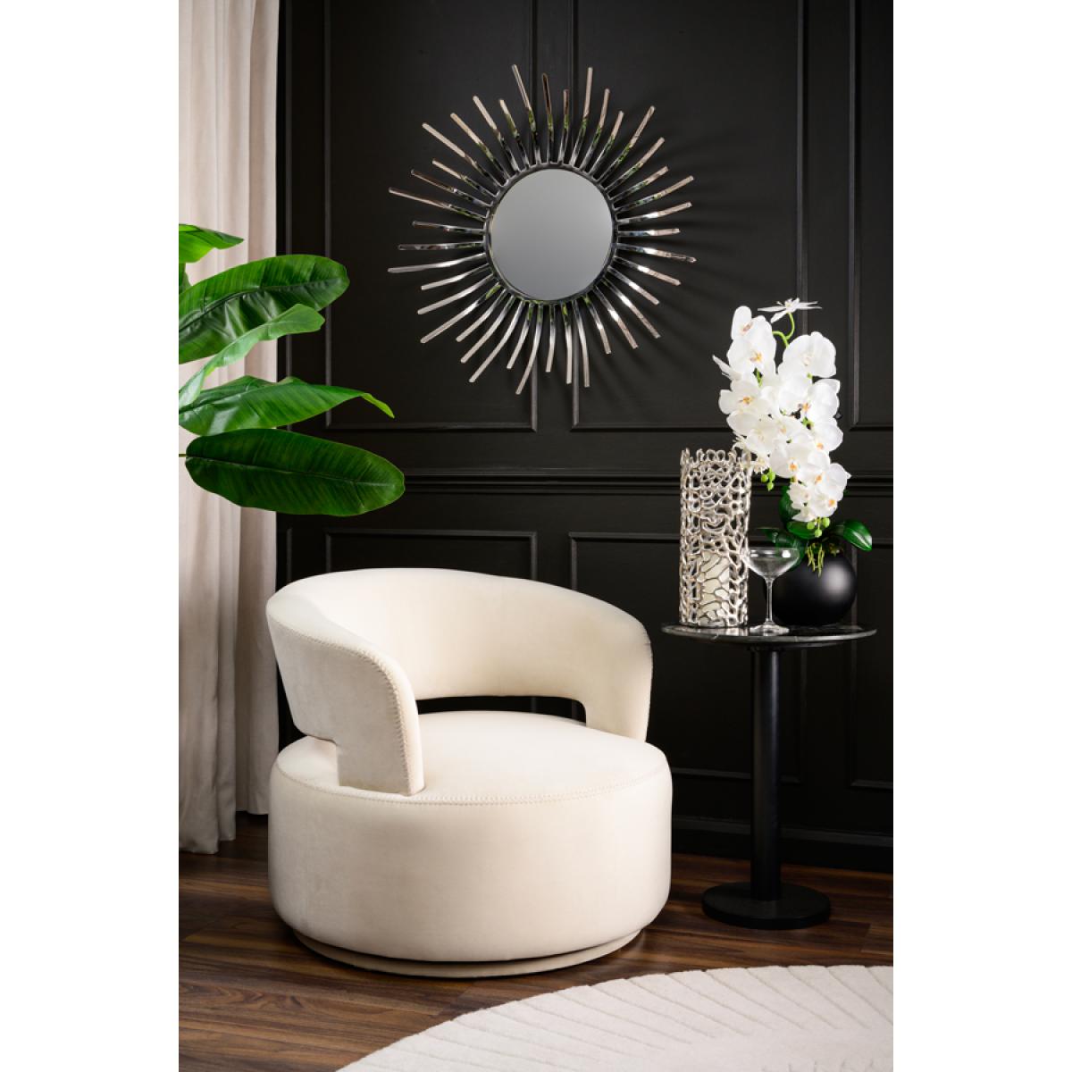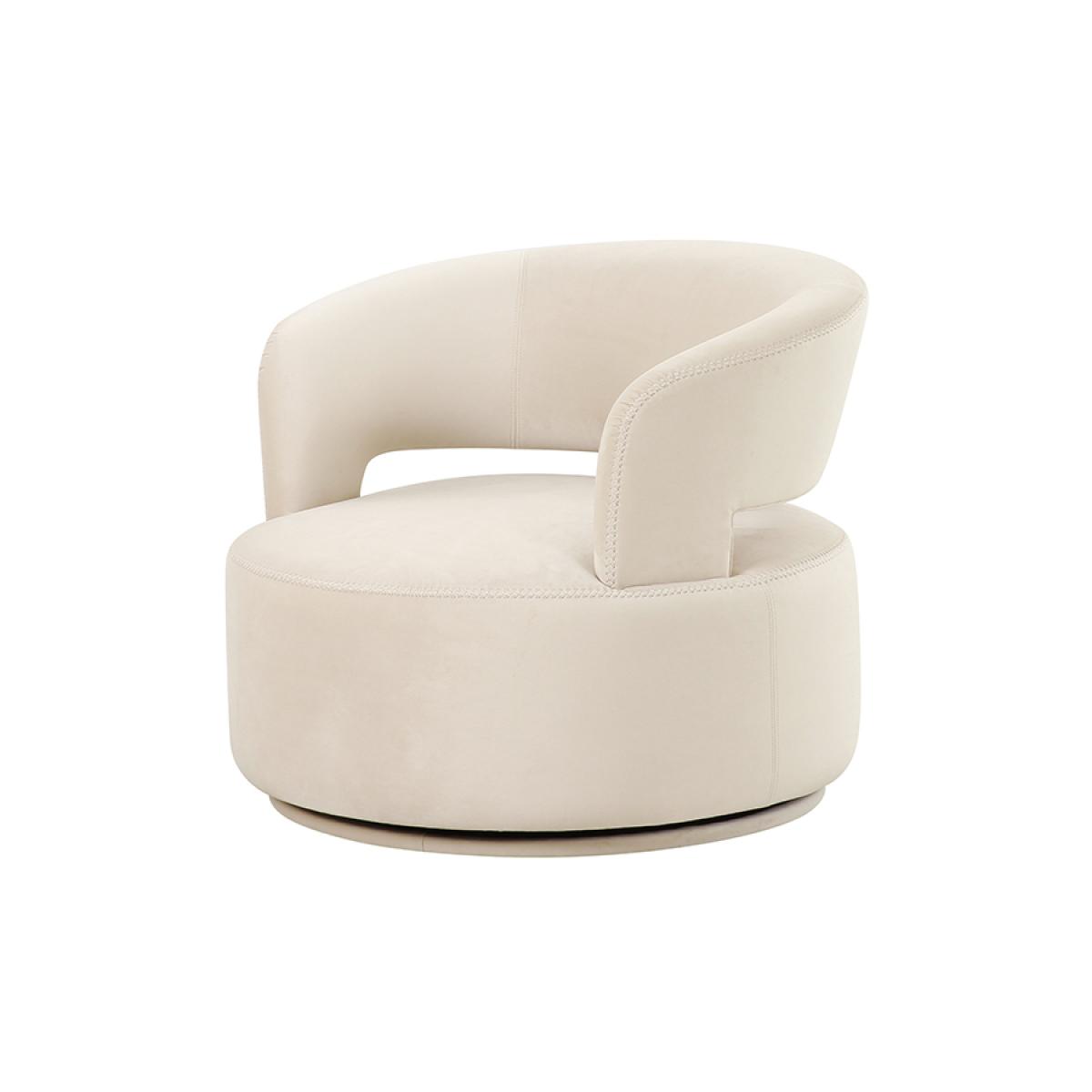 A contemporary sculptural swivel chair with a distinctive backrest design. Generous deep foam and fibre filling. Sprung seat and backrest for maximum comfort. Velvet upholstery fabric.