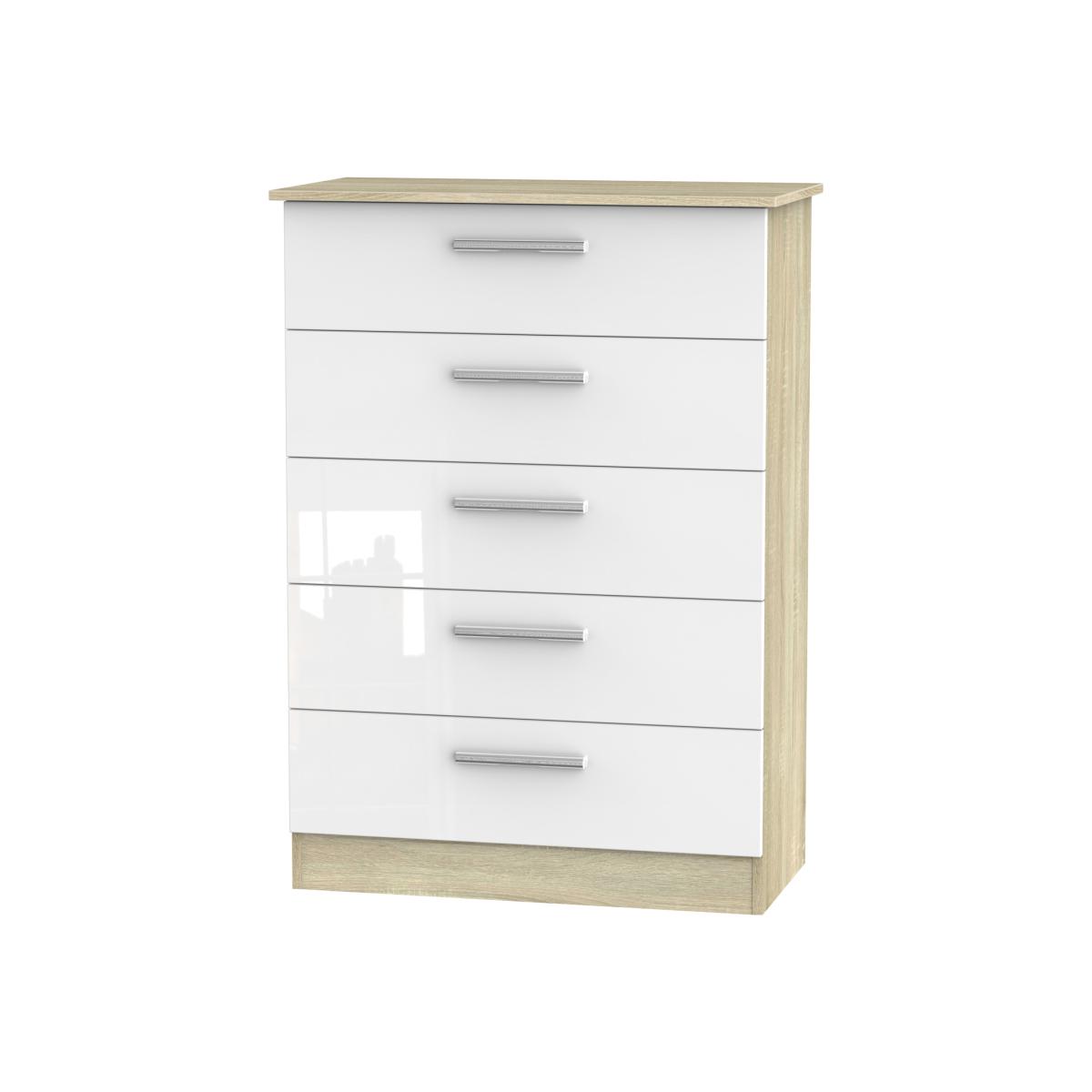 I’d call this simply the five-drawer chest, and what I like most is its clean lines and gloss-white fronts, which slot straight into modern, Scandinavian or minimalist schemes. The light oak effect sides warm up the look, so it works well against a pale grey or soft pastel wall. Styling-wise, keep the top surface tidy with one or two items at varying heights - for example a slim table lamp paired with a low-profile tray for keys or jewellery. Inside, drawer dividers or linen liners will help everything stay organised, making it as practical as it is visually appealing.