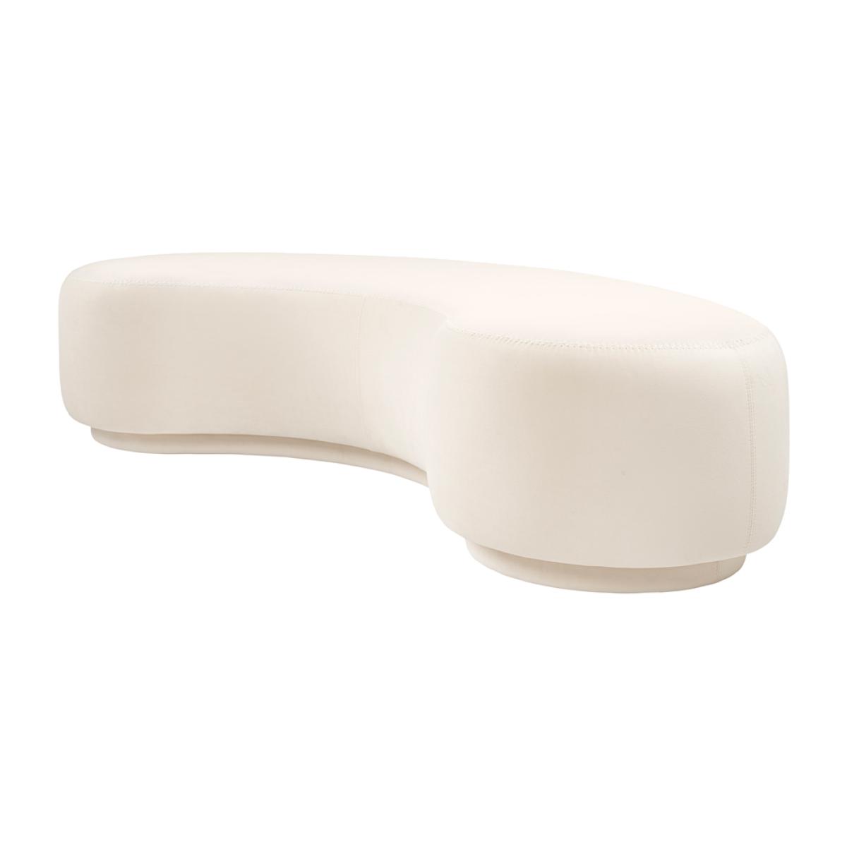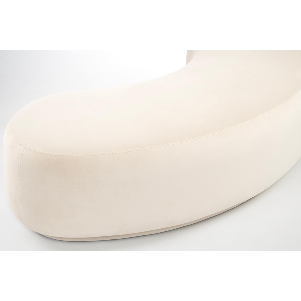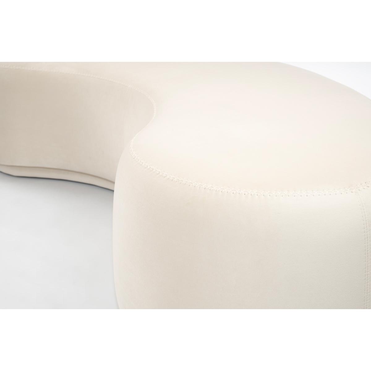 A contemporary sculptural ottoman with a distinctive curved form. Comfortable padded seat. Stylish cross stitch detailing. Velvet upholstery fabric.